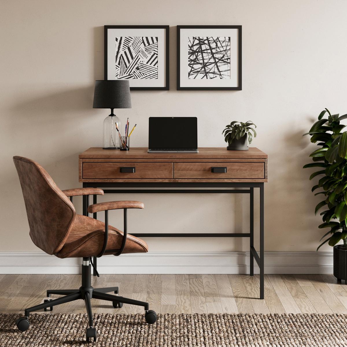 I’m a fan of this pine-effect desk for its clean lines and warm wood-grain top set against a slim black frame - it brings just the right balance of softness and structure. It suits Scandi-inspired schemes as well as loft-style or minimal home offices, pairing easily with leather or fabric seating and simple monochrome art. For styling, keep the surface clear except for a streamlined lamp and a low plant or pencil pot, hang a couple of black-framed prints at eye-level, and tuck a woven rug beneath to ground the look without overwhelming its slim profile.