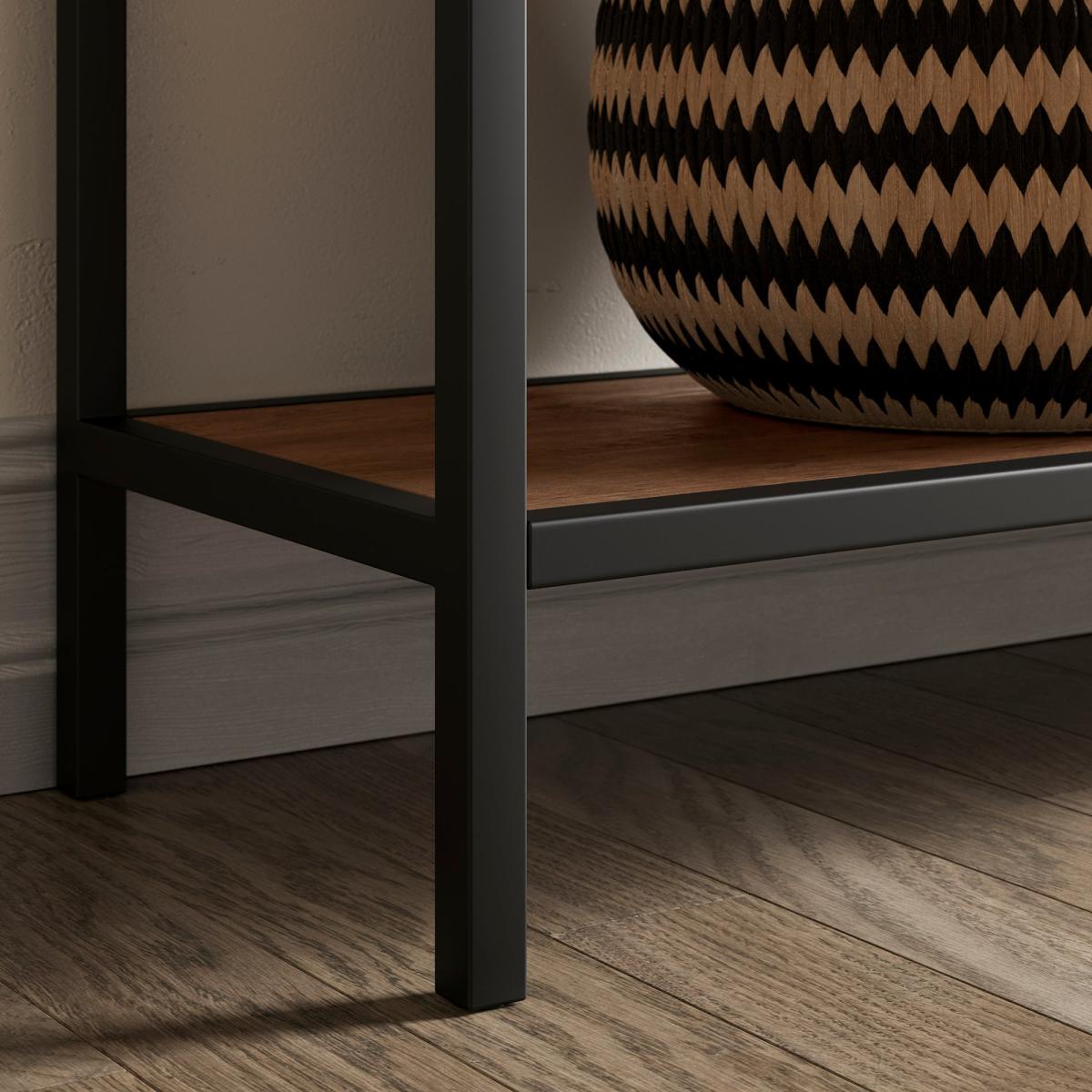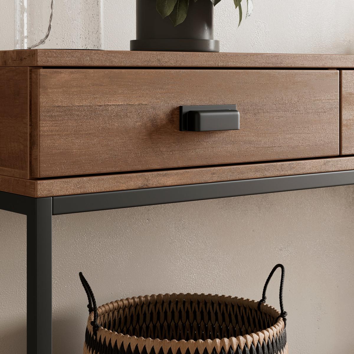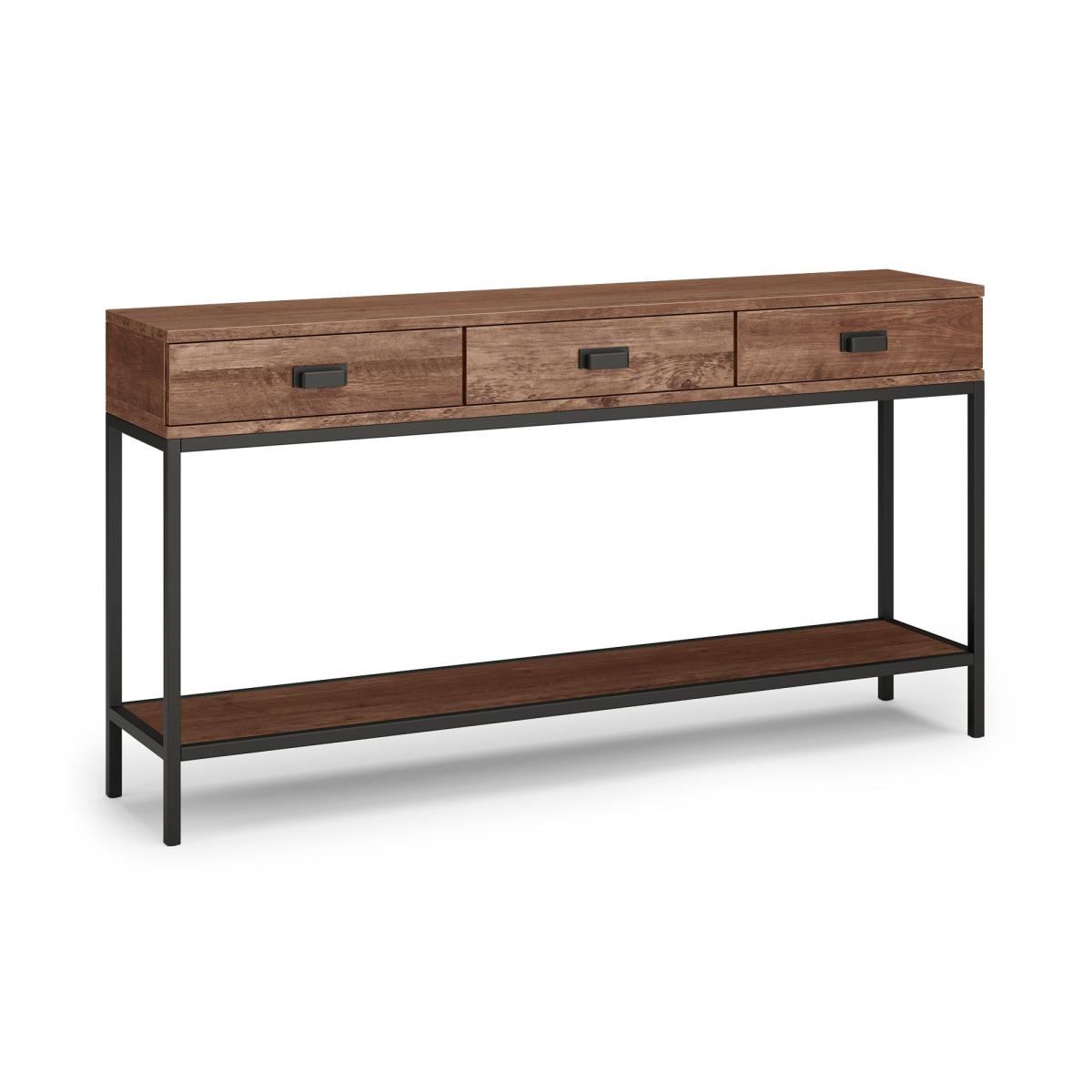 * Slim design* 3 spacious drawers* Metal legs Designed exclusively by Dunelm, this console table features a spacious design with three drawers and an open shelf, offering plenty of storage options for organising everyday items. The pine-effect finish adds a rustic warmth, while the sleek metal legs bring a modern, industrial touch.