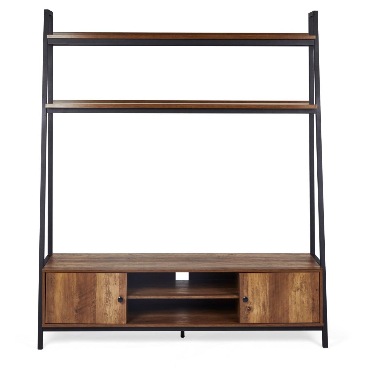 Dunelm Exclusive - Designed and Developed by Dunelm* Suitable for up to a 60" TV* Self assembly required* Overhead storage shelf* Two open shelves with cable access* Two spacious cupboards with cable access* Adjustable hydraulic buffering hinged doors* Rustic pine effect finish**Dunelm Exclusive - Designed and Developed by Dunelm**Inspired by contemporary and simplistic styling the Fulton range is a perfect statement piece to any living space. Made from durable materials with a metal tube base and unique matt finish, this self-assembly range features a rustic pine-effect finish with complementing black handles. Designed with two spacious cupboards and two open shelves with handy cable access this wide TV stand offers a wide array of storage solutions and has space to fit up to a 65" TV. This modern unit also features two fixed wide overhead shelves, perfect for providing extra book or media storage, or as a display for your home decor items. amazonaws. com/Dunelm-prod/78fbceb6-fe1f-4e52-ac92-90a0ff32caa2_Fulton+Ladder+TV+Unit+Assembly+Instructions. pdf) to view the assembly instructions.