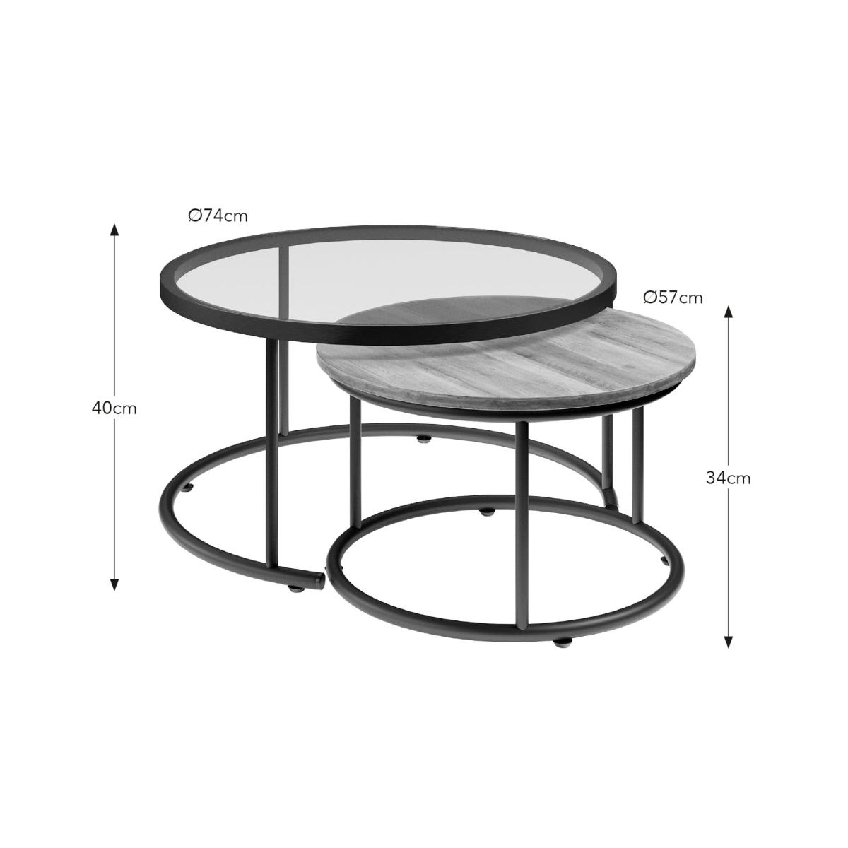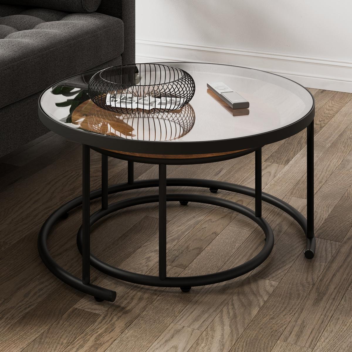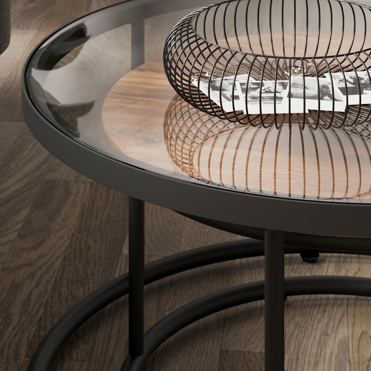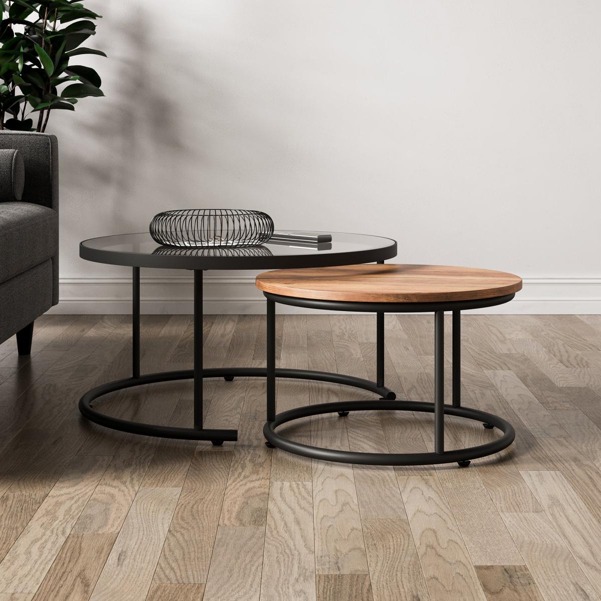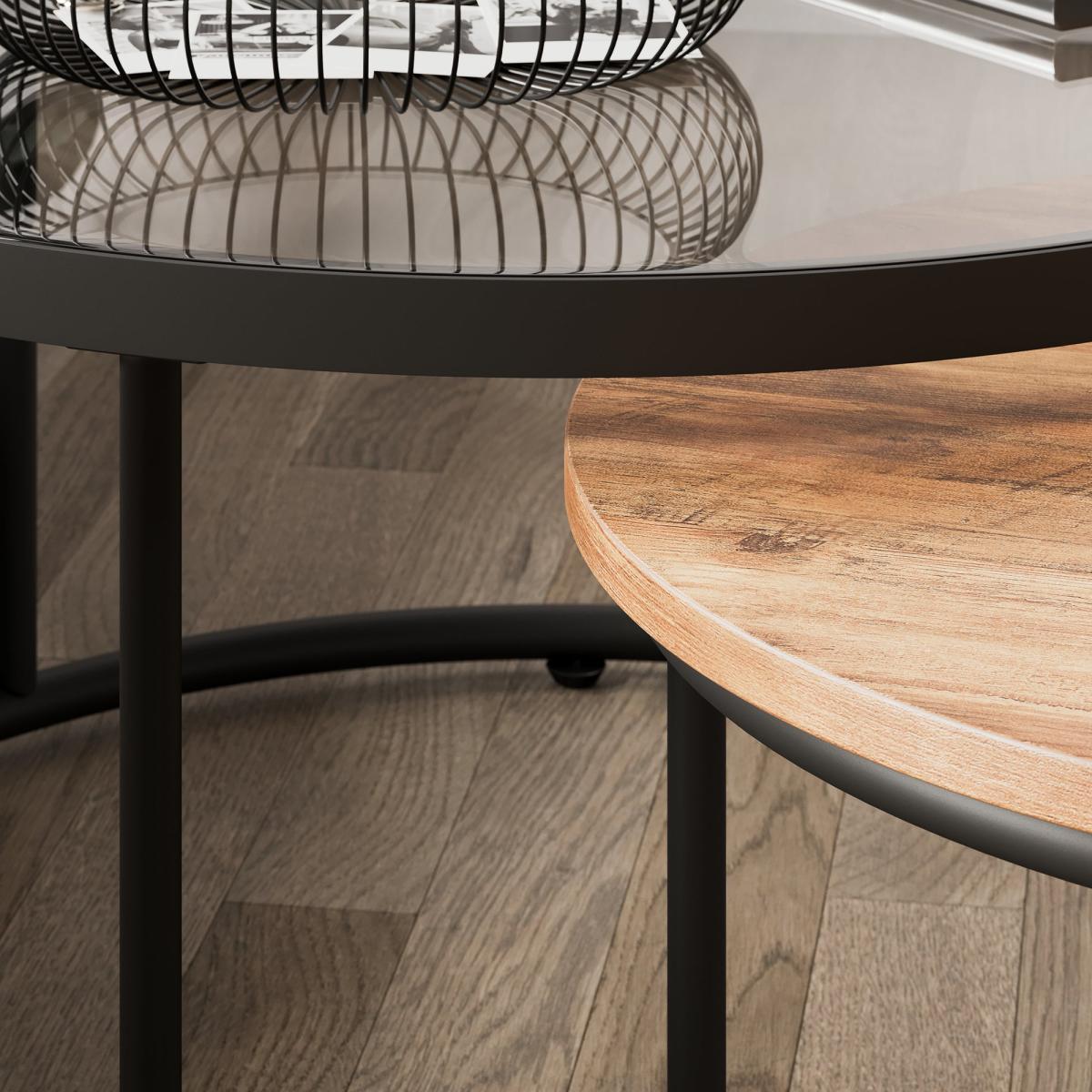 This set of 2 coffee tables are a perfect blend of contemporary design and simplistic styling. Crafted to add a touch of elegance to your living space, these tables are not only functional but also serve as striking statement pieces to any room. This set features two coffee tables, each with its own distinct charm, offering versatility to suit your personal taste. The first table showcases a sleek glass top, allowing you to appreciate the beauty of its craftsmanship. The second table boasts a warm and inviting wood top, adding a natural touch to your decor. The tables are supported by sturdy black metal leg frames that provide a sleek look that effortlessly blends with various interior styles and adds a touch of sophistication and ensuring durability. The pine effect adds a touch of nature, making these tables an excellent choice for those seeking an organic and warm feeling. Complete the look by exploring the matching collection of furniture, including tv units, side tables and shelves.