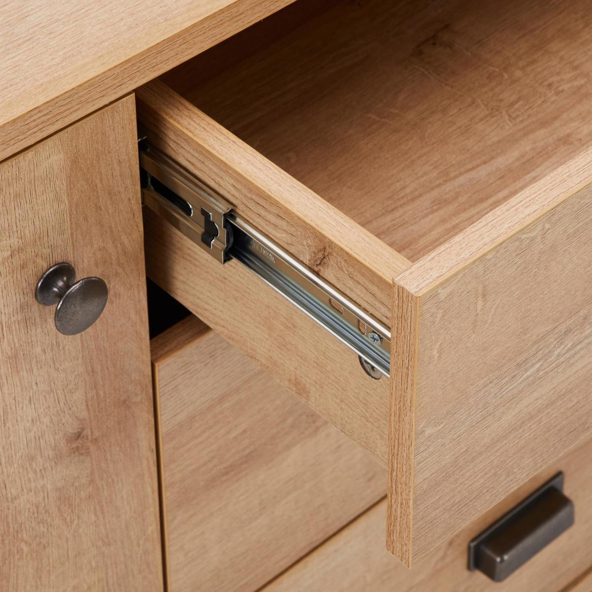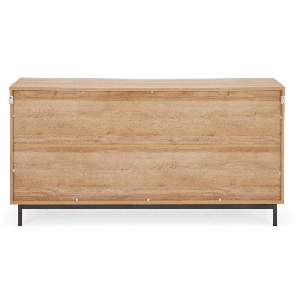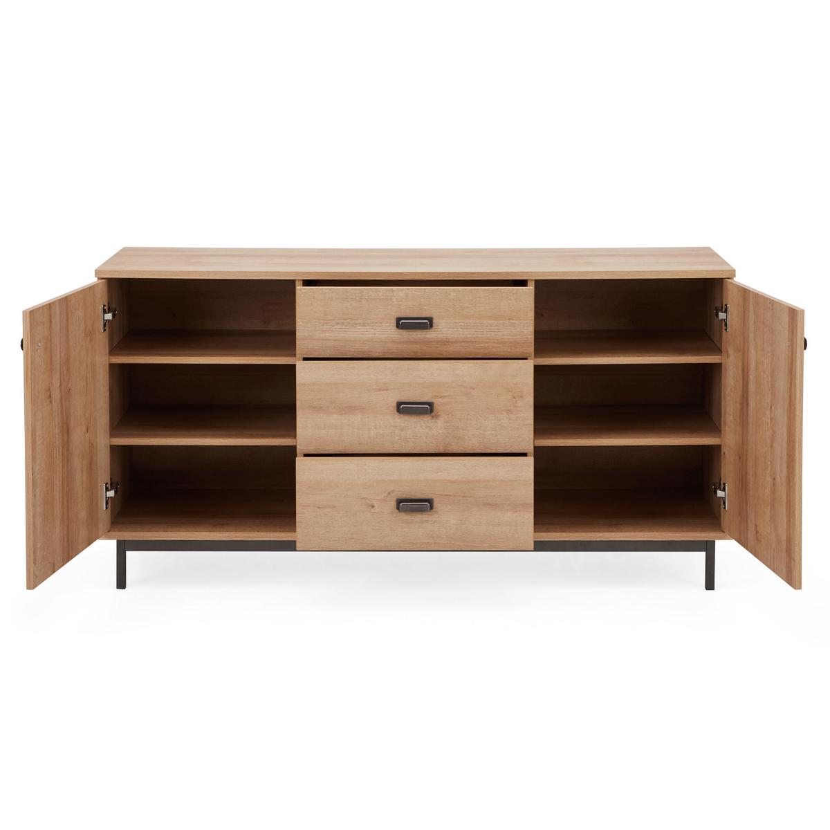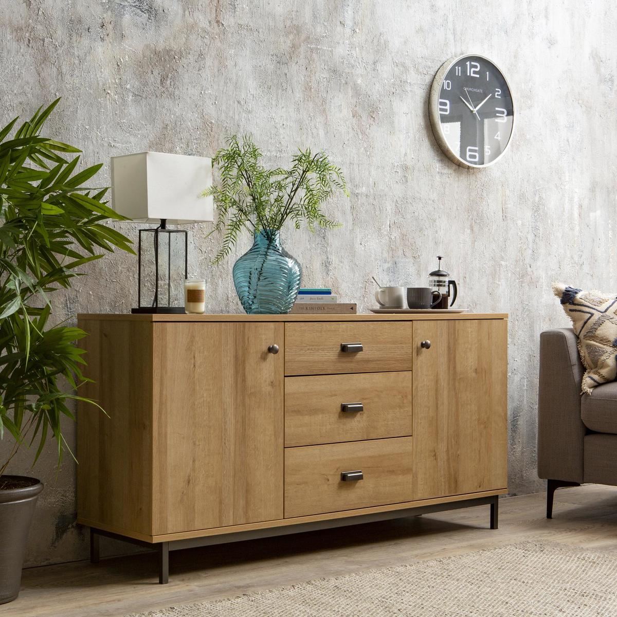Dunelm Exclusive - Designed and Developed by Dunelm. Inspired by contemporary and simplistic styling the Fulton range is a perfect statement piece to any living space. Made from durable materials with a metal tube base and unique matt finish, this self-assembly range features an oak-effect finish with contrasting gun metal handles. Crafted with three ample-sized drawers that glide on smooth metal extension runners with pull-out stop, this large sideboard features two spacious cupboards complete with fixed shelves inside for added convenience. Care Instructions: Only clean using a damp cloth and mild detergent, do not use bleach or abrasive cleaners. From time to time check that there are no loose screws on this unit. Remove any spills immediately to avoid staining and dust regularly with a soft lint free cloth or duster. This product is also available in a. Pine finish.