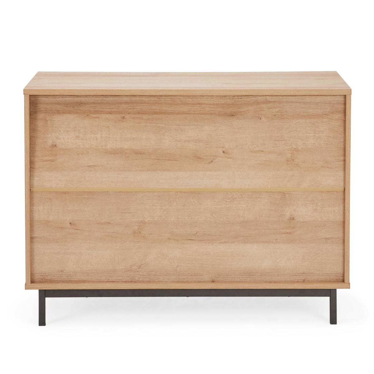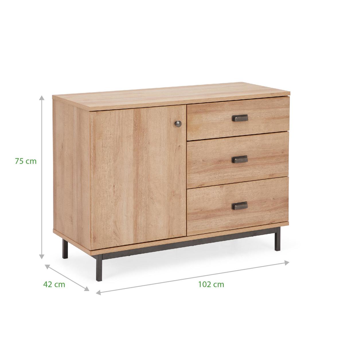 Dunelm Exclusive - Designed and Developed by Dunelm Inspired by contemporary and simplistic styling the Fulton range is a perfect statement piece to any living space. Made from durable materials with a metal tube base and unique matt finish, this self-assembly range features an oak-effect finish with contrasting gun metal handles. Elegantly crafted with a single cupboard equipped with two fixed shelves and adjustable hydraulic buffering hinged door, this stunning sideboard features three ample-sized drawers complete with metal extension runners and pull-out stop. Care Instructions: Only clean using a damp cloth and mild detergent, do not use bleach or abrasive cleaners. From time to time check that there are no loose screws on this unit. Remove any spills immediately to avoid staining and dust regularly with a soft lint free cloth or duster.