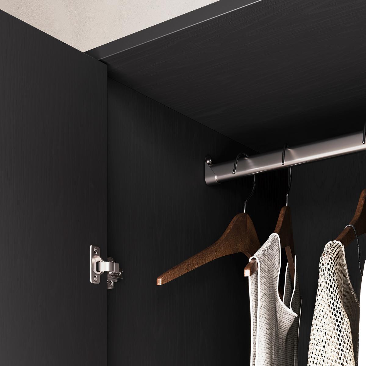 I’m a fan of this black-oak triple wardrobe for its clean, pared-back silhouette and subtle wood grain - it slots straight into modern-Scandi, industrial or minimalist schemes without dominating the room. The raised leg detail keeps the look light and makes under-wardrobe cleaning a doddle. For styling, keep the top simple - a low ceramic vase, a stack of art-books or a small potted plant work well. Inside, use matching hangers and woven baskets on the lower shelf to organise scarves, belts and off-season jumpers. Pair it with a neutral rug and soft-touch linen bedding to balance the dark finish and create a calm, cohesive bedroom.