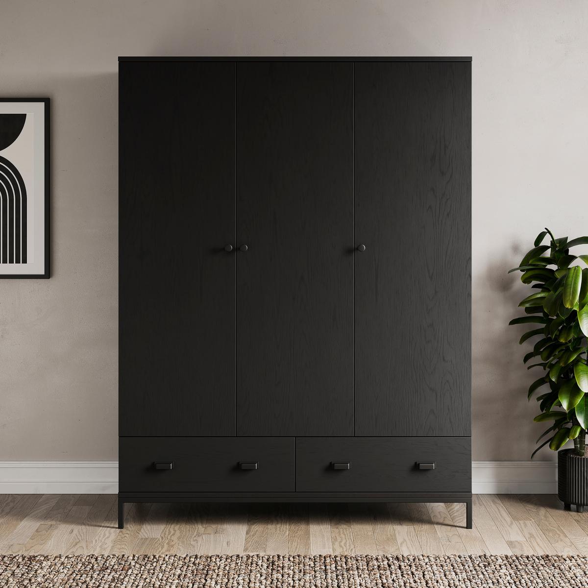 Dunelm Exclusive - Designed and Developed by Dunelm* Stylish 3 door wardrobe* Industrial-inspired design* Hanging rail, 3 spacious shelves, 2 drawers* 2 doors* Magnet door catch Dress yourself up with this iconic wardrobe, featuring a rustic oak effect finish and black metal handles. With 3 spacious shelves and 2 drawers, you’ll be more organised than ever before. This industrial-inspired design makes it the perfect piece for any contemporary interior.