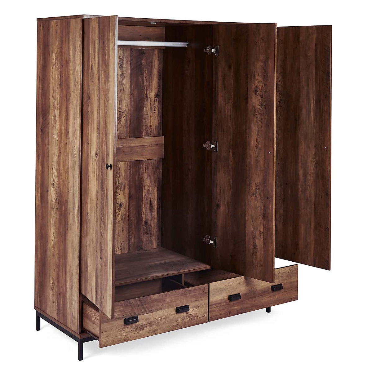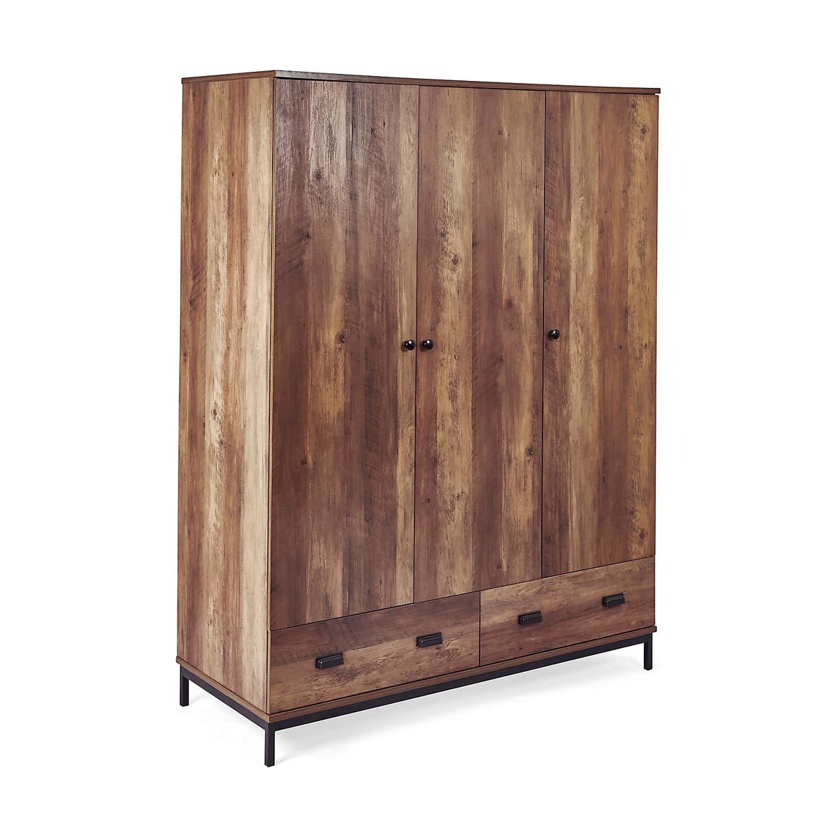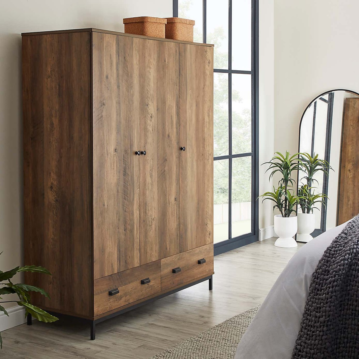 Dunelm Exclusive - Designed and Developed by Dunelm. Inspired by contemporary and simplistic styling the Fulton range is a perfect statement piece to any living space. Made from durable materials with a metal tube base and unique matt finish, this self-assembly range features a rustic pine-effect finish with complementing black handles. Providing plenty of useful storage space, the Fulton triple wardrobe offers with a large hanging space, an additional cupboard space and two ample sized drawers, complete with smooth metal extension runners and a safety pull out stop. Please use the wall attachments provided to prevent overturning.