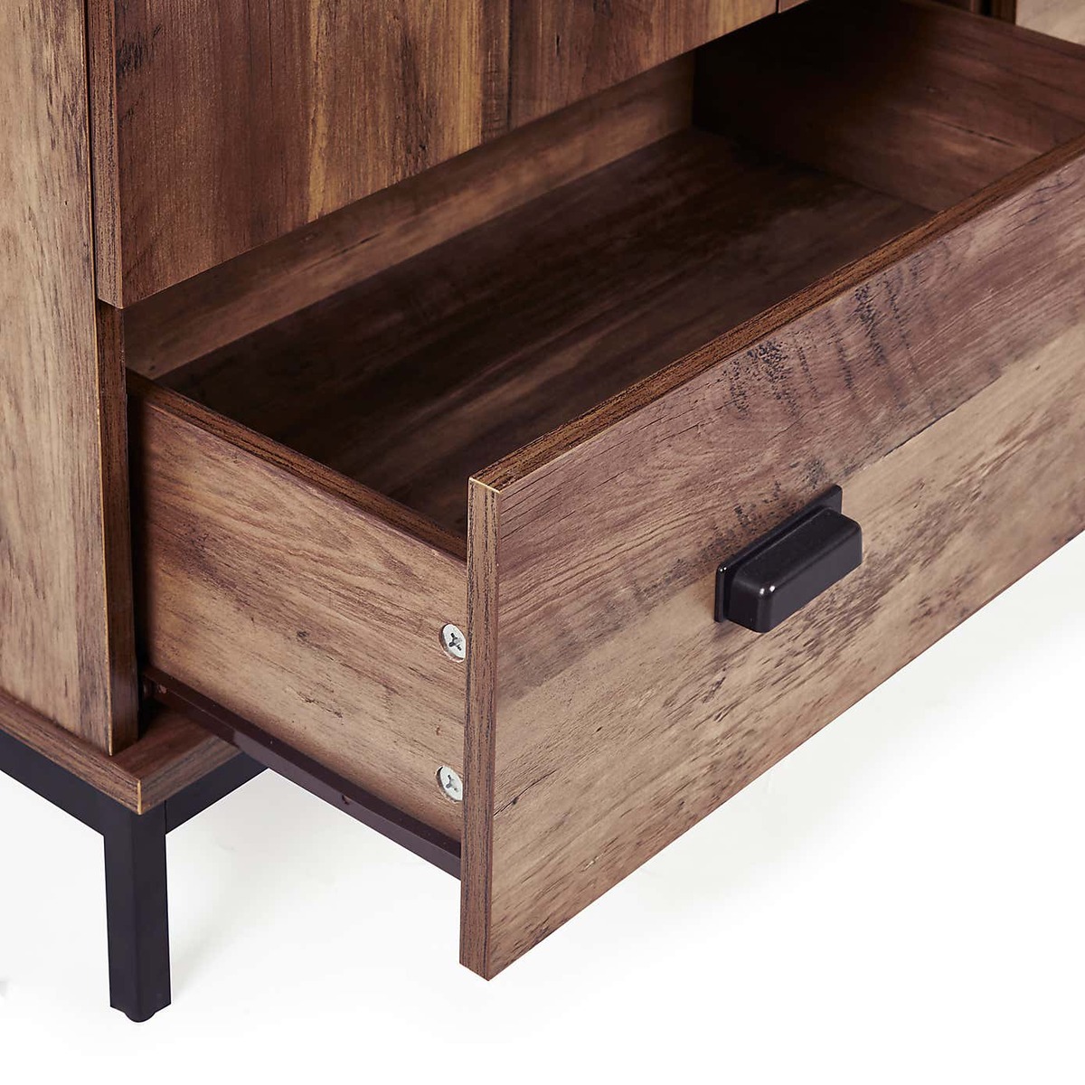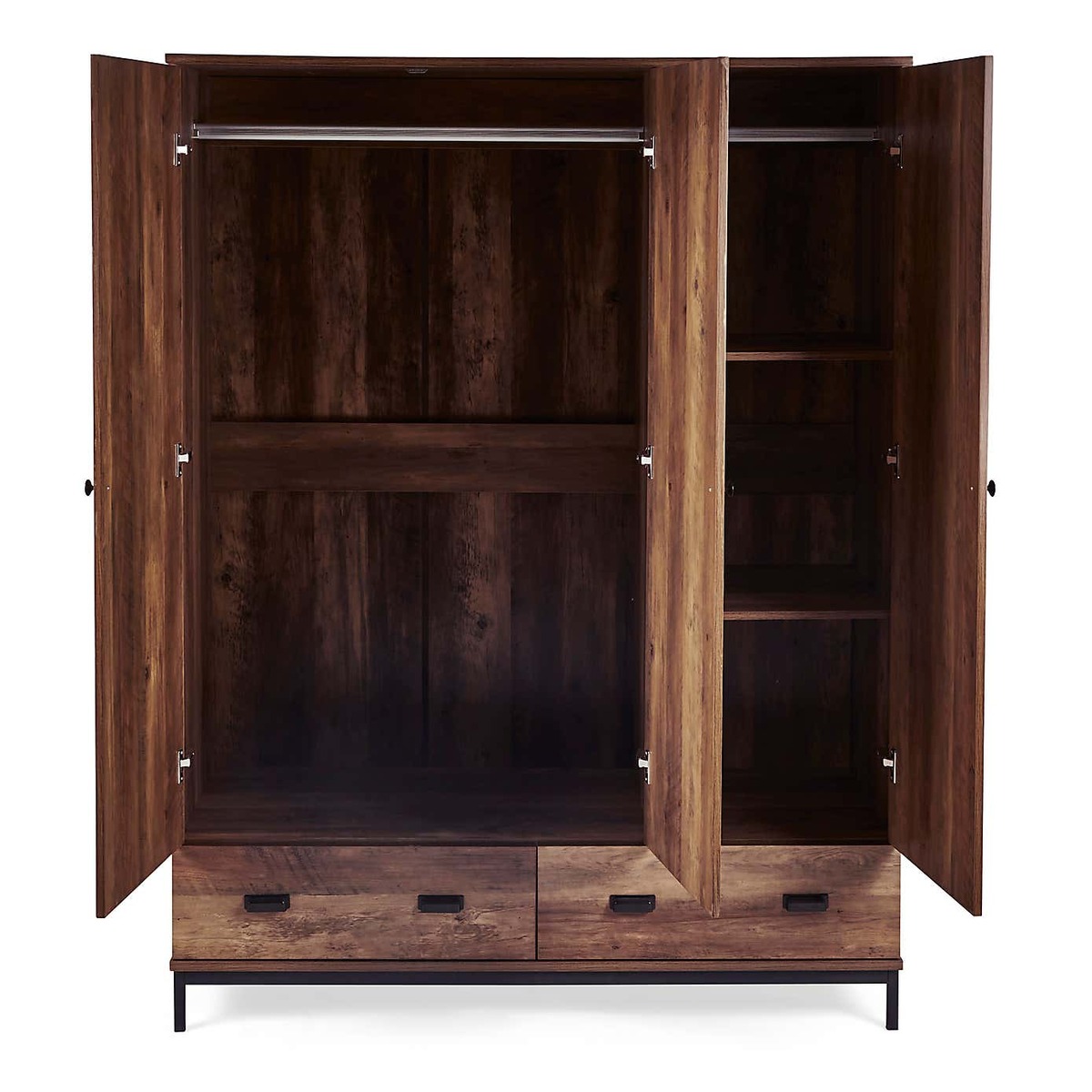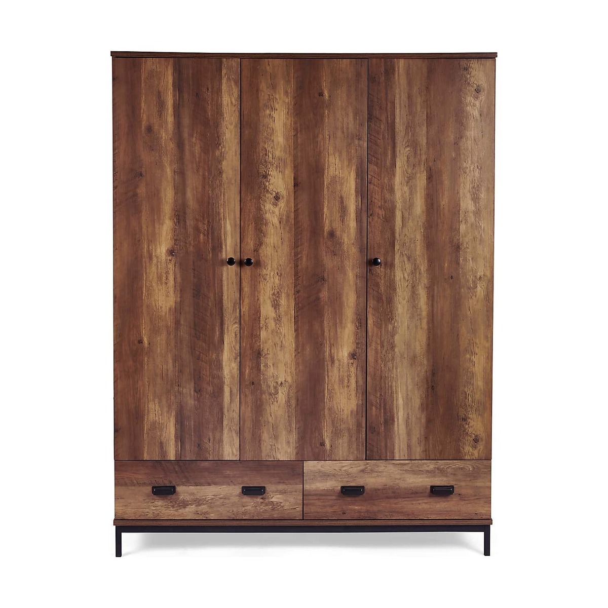 Dunelm Exclusive - Designed and Developed by Dunelm. Inspired by contemporary and simplistic styling the Fulton range is a perfect statement piece to any living space. Made from durable materials with a metal tube base and unique matt finish, this self-assembly range features a rustic pine-effect finish with complementing black handles. Providing plenty of useful storage space, the Fulton triple wardrobe offers with a large hanging space, an additional cupboard space and two ample sized drawers, complete with smooth metal extension runners and a safety pull out stop. Please use the wall attachments provided to prevent overturning.