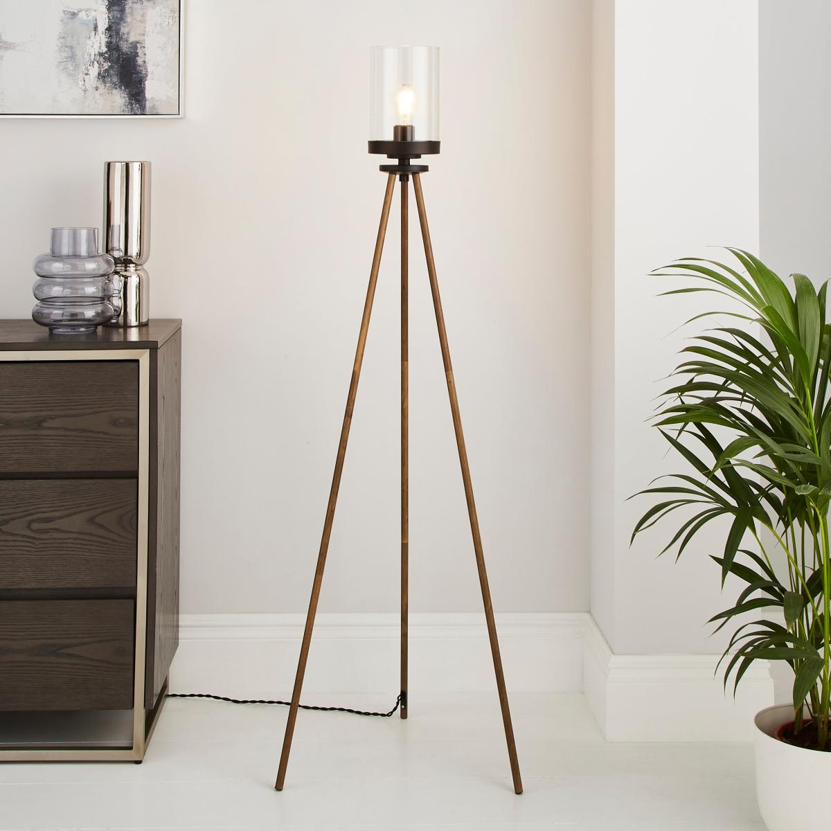 Add a unique style to your home with our Fulton tripod style floor lamp, featuring tripod style legs for a trendy look. It comes complete with a clear glass shade with an exposed bulb for that modern touch and is finished in a rustic Pine coating with an on and off foot switch which is easy to switch on and off whenever you desire.