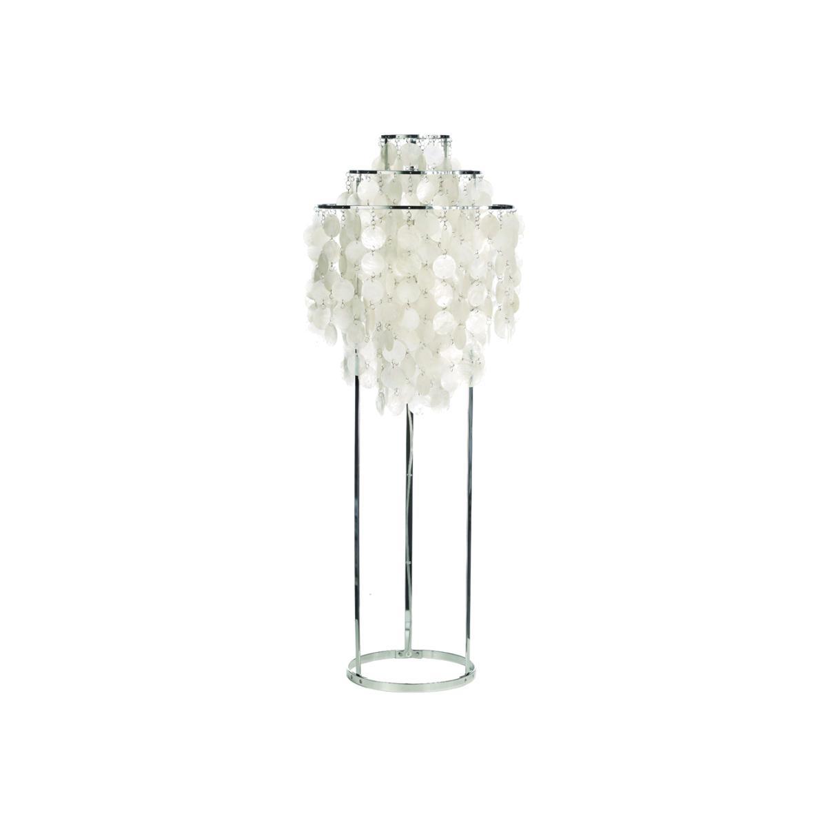 Originally designed by Verner Panton in 1964, the chrome Fun 1ST M Floor Lamp is still crafted by his design house, Verpan, today. A truly statement design piece, this lamp showcases a canopy of mother-of-pearl discs, each carefully suspended from three chrome-plated metal hoops using stainless steel rings. Finished with a switch on its transparent cord and a chrome-plated base, this elegant floor lamp is part of the coveted Fun collection and can be paired with coordinating pendants, table and wall lights. Gifted with a unique sense of colour, shape and light, Verner Panton is renowned across the globe as one of Denmark's most influential designers. Boldly creating furniture and lighting that was completely unlike the work of his contemporaries, Panton's designs are housed in collections at New York's MoMA, Copenhagen's Danish Museum of Art and Design and the Design Museum in London. Requires: 1 x Max 60W E27 bulb (not included)