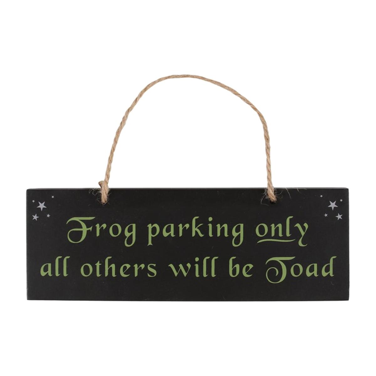 Hanging decorative sign featuring the wording 'Frog Parking Only All Others Will Be Toad'. A great piece for any witch's garden and is sure to raise a smile.