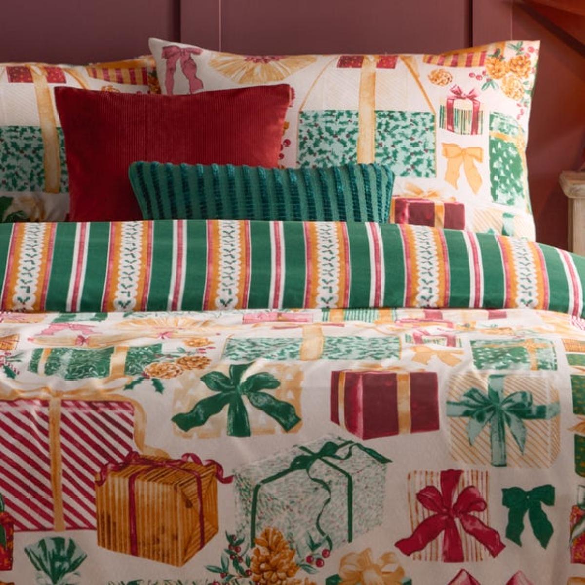 I love this all wrapped up duvet set for its playful, festive vibe and its versatility. It works particularly well in relaxed, cosy interiors like country cottages or contemporary homes that embrace a fun, eclectic style. The vibrant pattern featuring gifts and holiday motifs makes it perfect for adding a pop of colour and personality during the festive season, but it can also be layered with neutral or solid-colour accessories to tone it down when the occasion’s over. Practical styling tips include pairing it with simple, coordinating cushions in textures like velvet or linen, and perhaps a chunky throw at the foot of the bed for extra warmth and visual interest. It’s a great choice if you want to bring a bit of the festive spirit into everyday living without going over the top.
