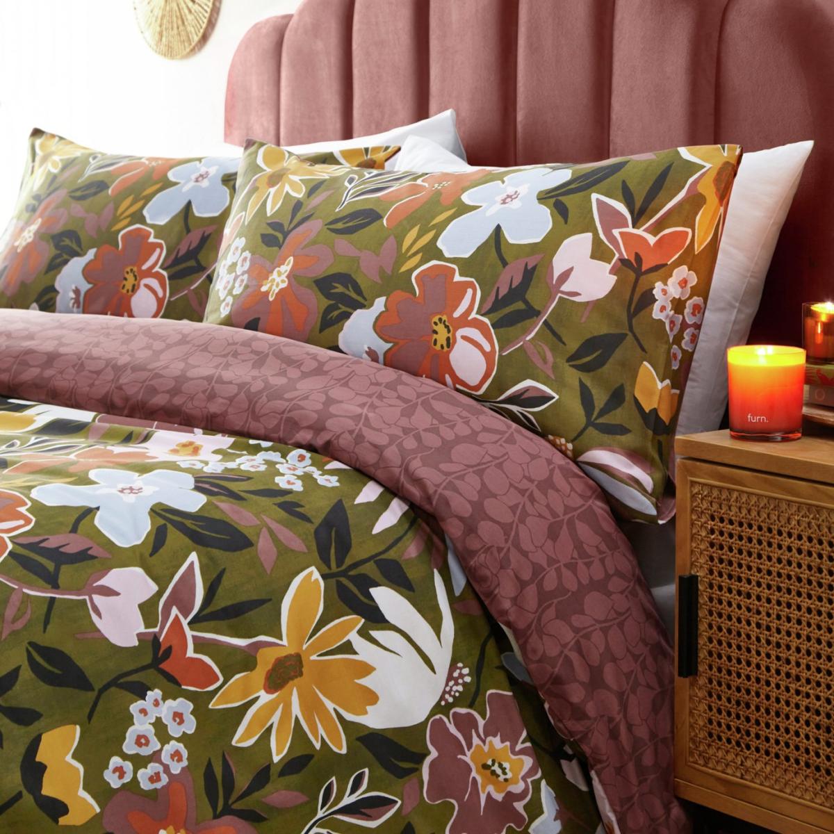 The Asterea duvet cover set is inspired by seasonal changes such as the turning of the leaves. This design, reminiscent of fashionable dress prints, features an autumnal colour palette which cleverly blends the soft florals and foliage. On the reverse, an organic earthy purple tonal print which will make your bedroom feel on-trend and stylish instantly! Featuring autumnal leaves and blending soft florals, set against a botanical moss green background. Complete with an earthy purple tonal floral design on the reverse for a more neutral look. 50% cotton , 50% polyester. 144 thread count. Set includes 1 duvet cover and 2 pillowcases. Bed size: double. Length 200cm, Width 200cm. Reversible. Buttons for fastening. Standard pillowcase (s). Pillow case length 75cm, Width 50cm. Reversible pillowcase (s). Machine washable. Suitable for tumble drying.