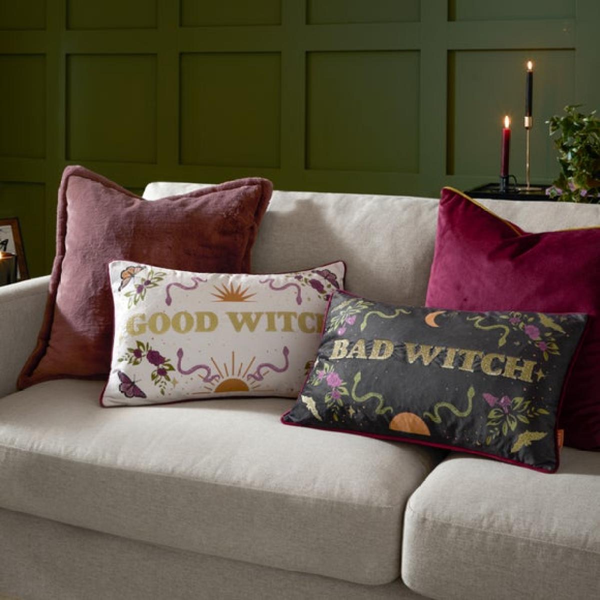 * Perfect for spooky season * Charming piped edging * Soft velvet finish Cast a little charm over your decor with the Bad Witch Black Magic Cushion Cover. Adorned with shimmering metallic embroidery of snakes, bats and mystical florals, it's a design that whispers enchantment. Crafted from plush velvet on both sides, it brings a rich, luxurious feel to your space. The piped trim adds a polished edge, making this cushion as striking as it is spellbinding. Perfect for conjuring up a cosy corner with a touch of dark magic.