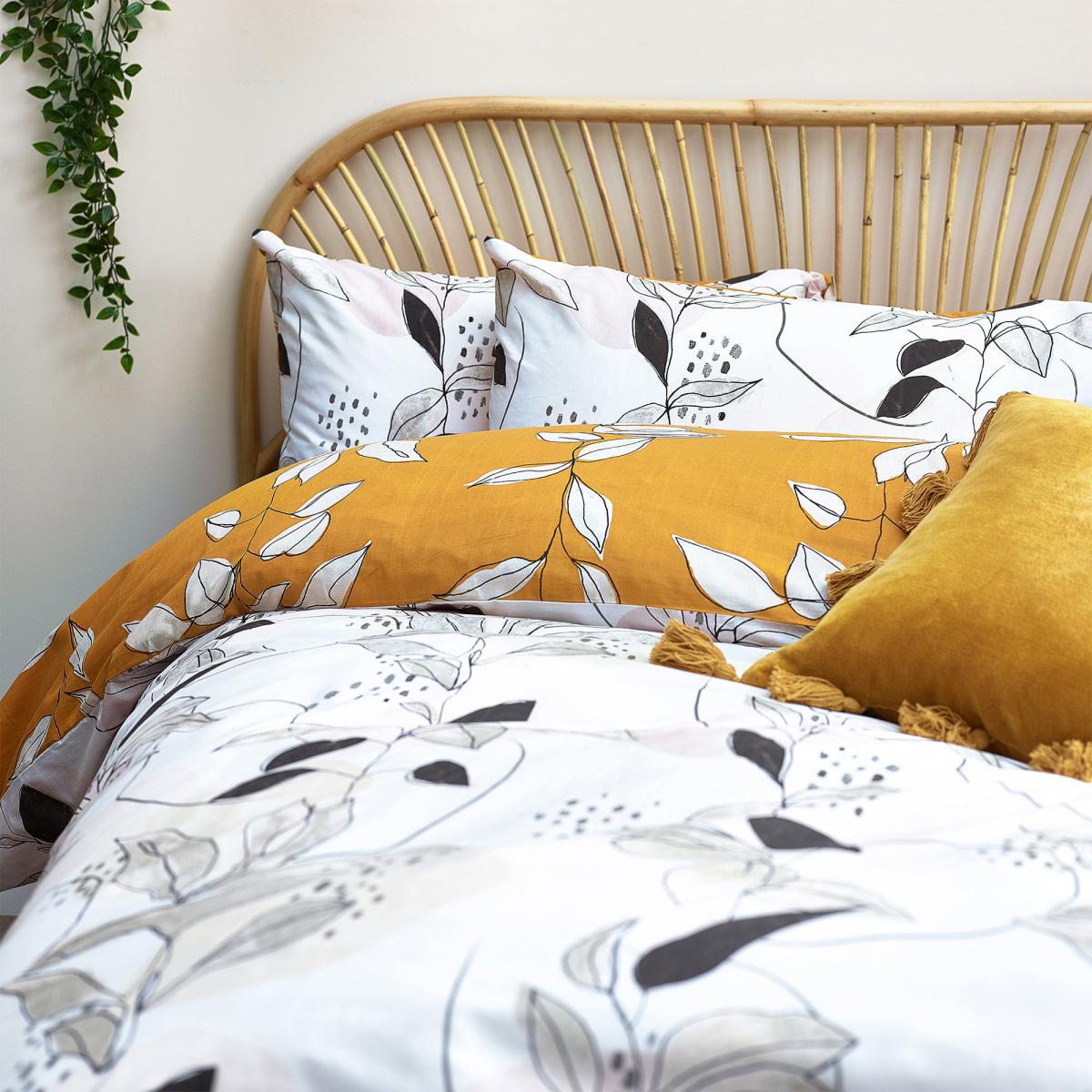 I really like the Caliko duvet set in ochre for its warm, earthy tone that adds a welcoming feel to a bedroom. Its neutral, botanical print makes it versatile for various interiors, from Scandi-inspired spaces to more eclectic or bohemian styles. For styling tips, pair it with crisp white or neutral bedding to let the ochre pop, and introduce layered textures through cushions or throws in complementary tones like greys, blacks, or soft browns. It works well in bedrooms where you want a cosy yet modern look, and the colour can be used as a foundation for adding in other accent colours, such as deep reds or forest greens, to create a personalised and stylish space.