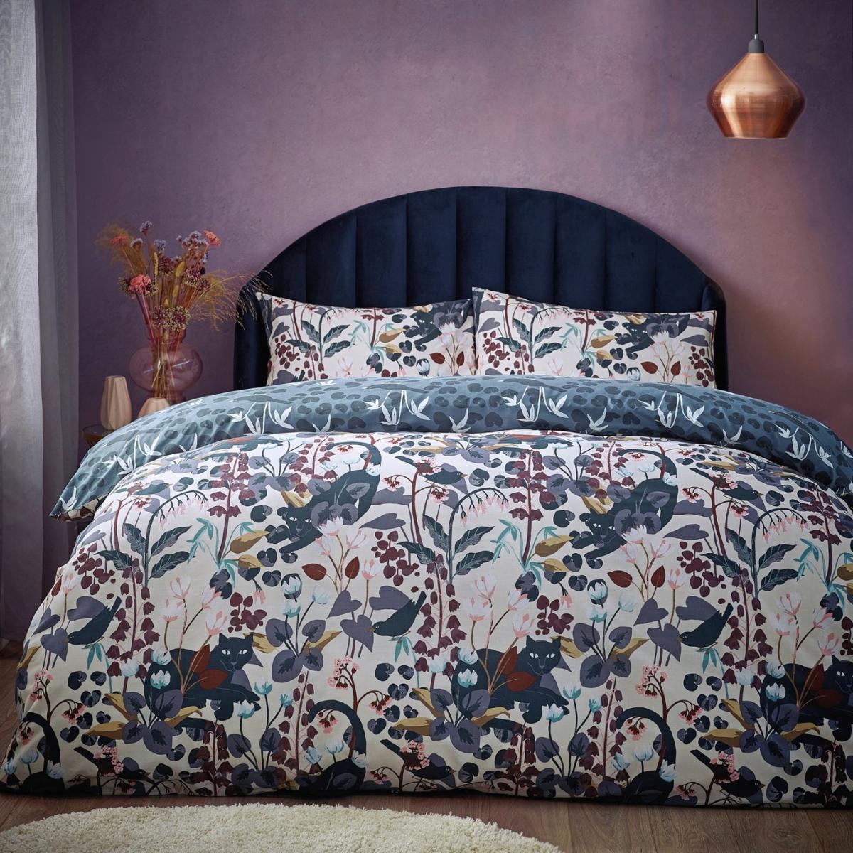 Inspired by a romantic and moody palette, this enchanting scene is a peak into the wild. Look closely and you will see some feline friends stretching and lazing under the moonlight. The Midnight Panther duvet cover set is complete with a charming reverse of exotic botanics, and blackbirds perched in song. This design is perfect for those who love eclectic interior styles. Featuring an enchanting design of midnight-blue coloured panthers hiding within the exotic jungle botanics. Complete with a moody yet romantic reverse of blackbirds perched in song. 50% cotton , 50% polyester. 144 thread count. Set includes 1 duvet cover and 2 pillowcases. Bed size: double. Length 200cm, Width 200cm. Reversible. Buttons for fastening. Standard pillowcase (s). Pillow case length 75cm, Width 50cm. Reversible pillowcase (s). Machine washable. Suitable for tumble drying.