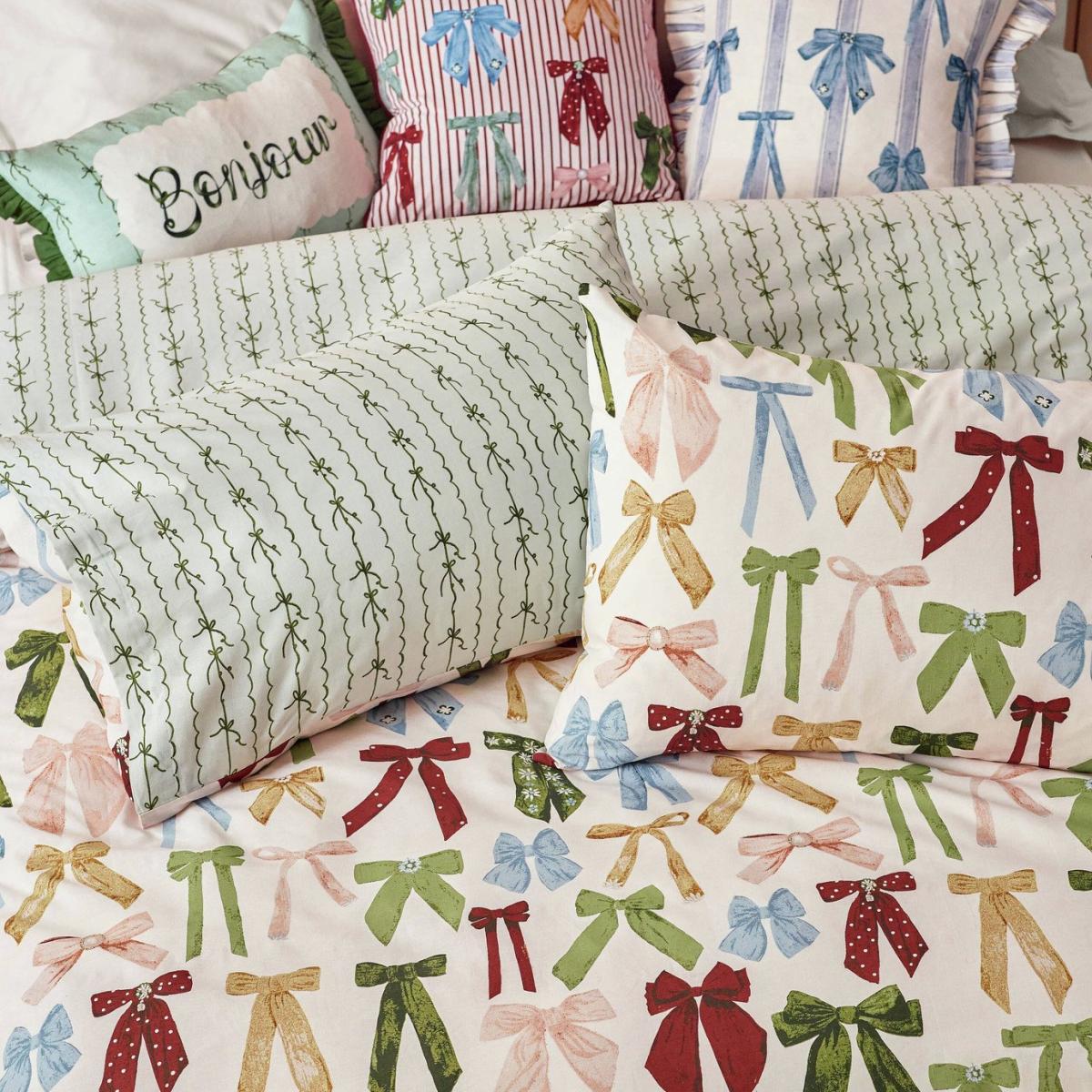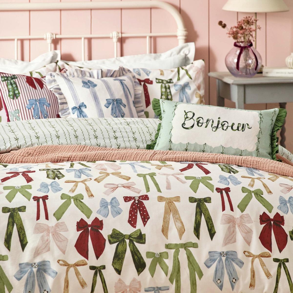 I love this noortje bow bedding set for its playful yet refined pattern, making it a versatile choice for both cosy bedrooms and more cheerful, eclectic spaces. Its charming bows in soft colours work well in bedrooms with pastel schemes or neutral palettes, adding a subtle dash of colour and personality. For styling, consider pairing it with simple, solid-coloured cushions and throws to let the pattern stand out, or go all-in with coordinating accessories in similar hues for a cohesive look. It's also practical due to its versatile king size, which makes it suitable for larger beds and provides a comfortable, polished finish.