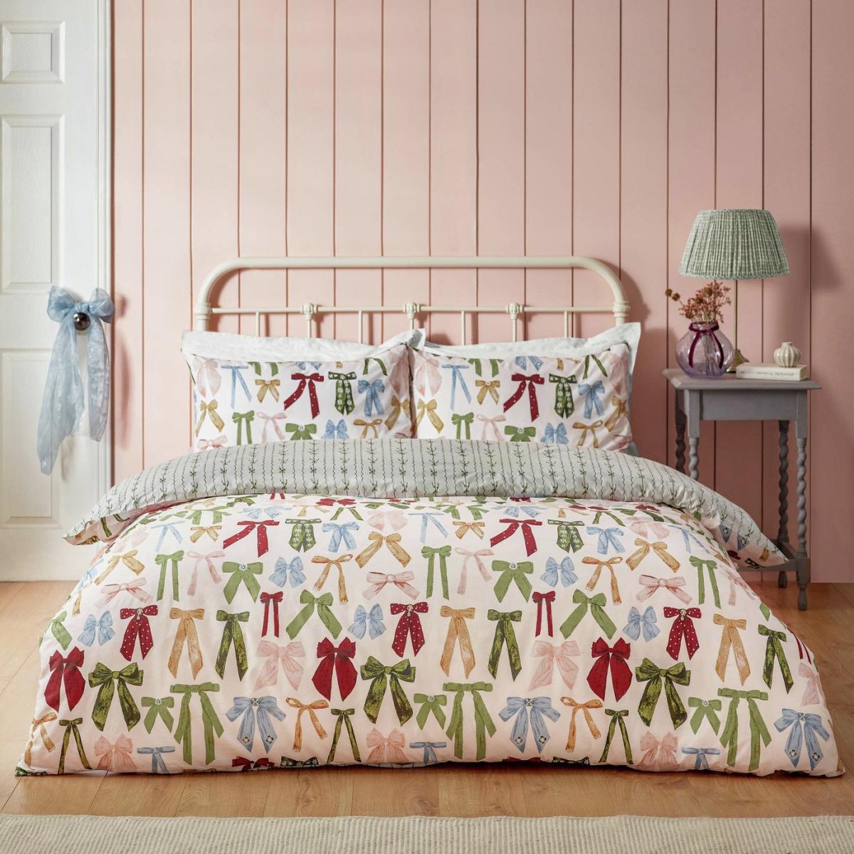 Featuring a trending design of bows in all shapes and sizes inspired by Parisian style. Complete with an alternative patterned reverse, perfect for a midweek refresh. 50% polyester, 50% cotton. 144 thread count. Set includes 1 duvet cover and 2 pillowcases. Bed size: king size. Length 220cm, Width 230cm. Reversible. Buttons for fastening. Standard pillowcase (s). Pillow case length 75cm, Width 50cm. Reversible pillowcase (s). Machine washable at 30 C. Suitable for tumble drying.