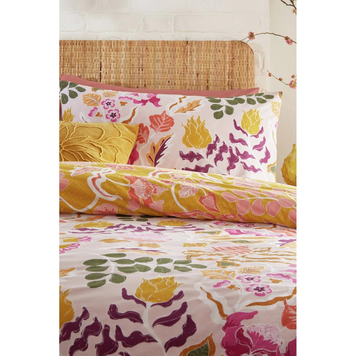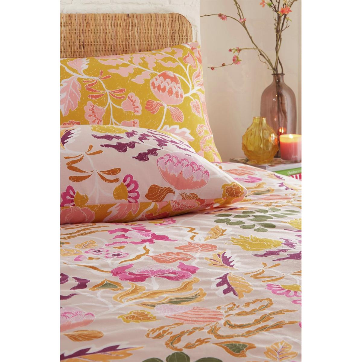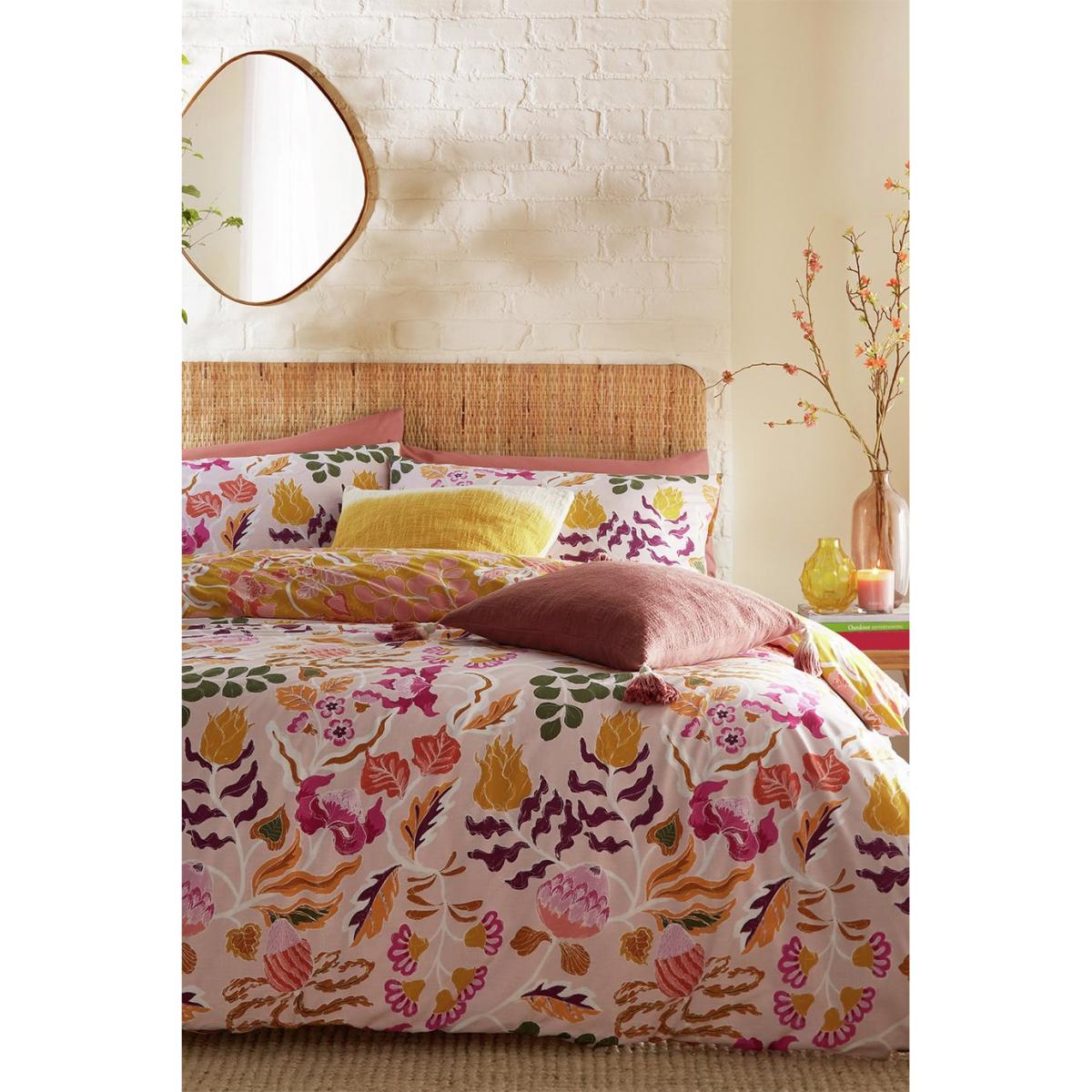 The Protea duvet cover set is a return to holidaying and escapes which are filled with romantic and dreamy textures, colours and prints, as we fall in love with exotic surroundings once more. Flower filled scenes, architectural shapes, with peach, clay and violet hues bringing new interest to this serene pastel setting. The contrast patterned reverse has a deep, earthy light green natural background, which exudes warmth and creates an inviting ambience into your bedroom for a relaxing night's sleep. Featuring funky abstract florals set against a fresh light pink background. Knife edge finish. Finish: percale. Set includes 1 duvet cover and 2 pillowcases. Bed size: single. Length 200cm, Width 135cm. Reversible. Buttons for fastening. Standard pillowcase (s). Pillow case length 75cm, Width 50cm. Reversible pillowcase (s). Machine washable. Suitable for tumble drying.