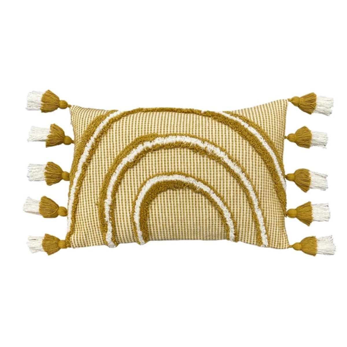 * Textured, Tufted Rainbow Design * Made from 100% Soft Cotton * Plump Polyester Fibre Filling * Tasselled Edge Detailing Brighten your space with the furn. Rainbow Tuft Cotton Rectangle Cushion. Featuring a textured tufted rainbow design on a woven base, this cushion is finished with tasselled edges for a fun, playful touch.