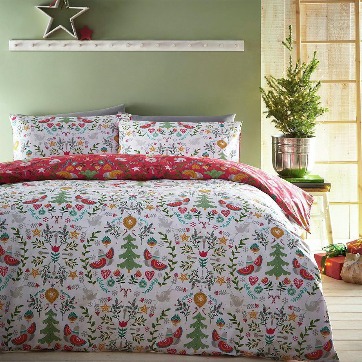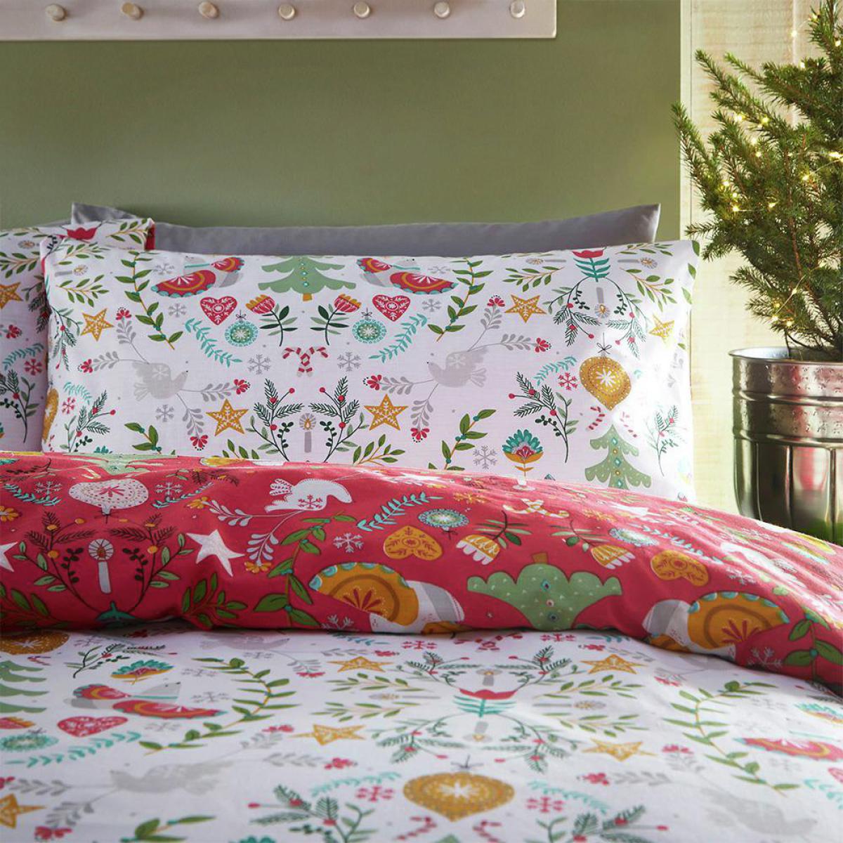 Add a fun festive touch to your home this winter with this stylish Scandinavian inspired duvet set. This design features a modern take on Scandinavian Christmas classics; wreaths made of pine leaves, rustic ornaments, and Christmas doves. Completing this fun bedding with a bold reverse.