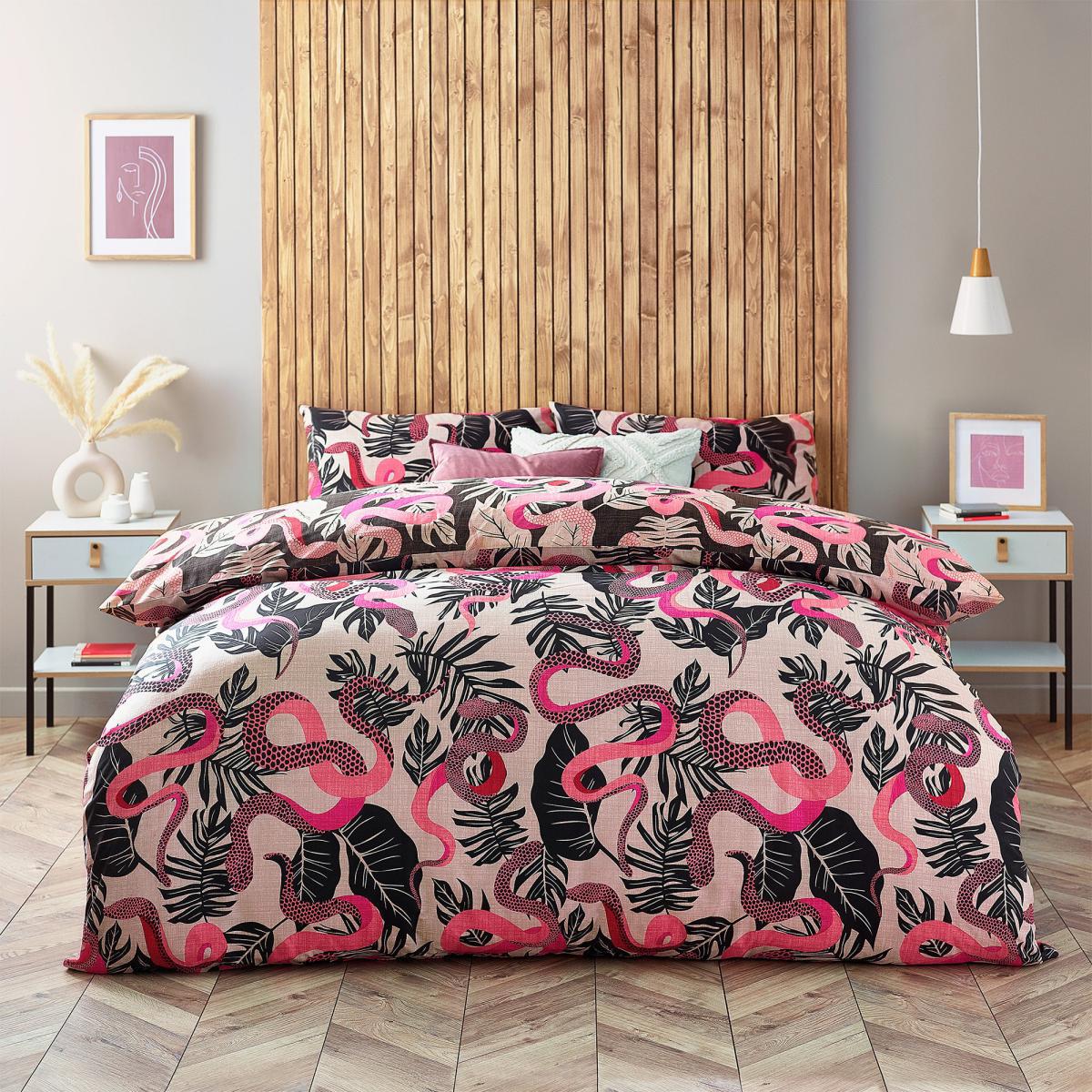 I love this pink duvet set for adding a burst of colour and vitality to a bedroom. The Serpentine Ruby Pink design works well in eclectic, boho or contemporary interiors where bold patterns and vibrant hues are key features. It’s versatile enough to pair with neutral bedding or accessories to let the pinks and animal motifs be the focal point, or with darker tones for a striking contrast. For styling, consider balancing its lively pattern with more restrained, solid-coloured cushions or throws, and keep the surrounding decor minimal to let the duvet set stand out. It’s a great choice for anyone wanting to introduce a playful yet sophisticated pop of colour into their space.