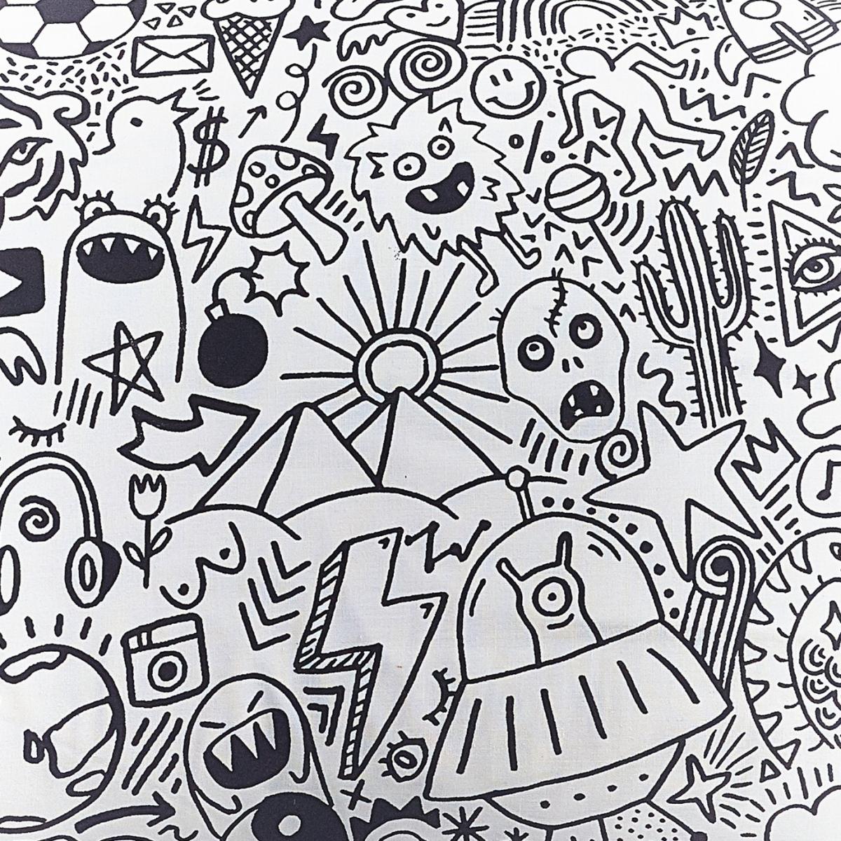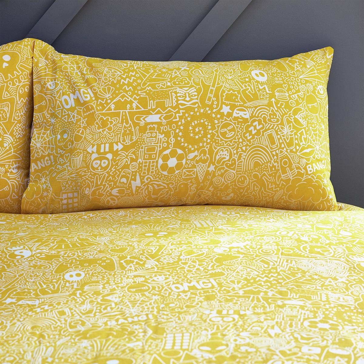 Express your creativity with this doodle duvet set. Featuring exciting notebook doodles of aliens, monsters, and spaceships. The excitement continues to the reverse a coordinating design on a yellow base so you can switch the look when you need to. Featuring exciting notebook doodles. Set comprises of 1 duvet cover and 2 pillowcases. Black and white Abstract pattern. Size L200 x W200cm. Pillow case length 75cm, Width 50cm. Standard pillowcase (s). Reversible pillowcase (s). Reversible. Buttons for fastening. Machine washable. Suitable for tumble drying. 50% polyester, 50% cotton. 144 thread count.