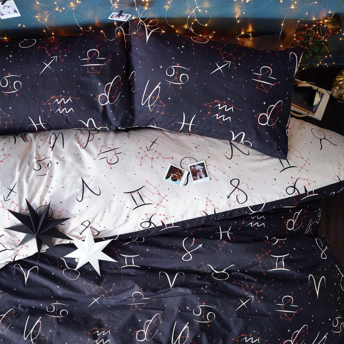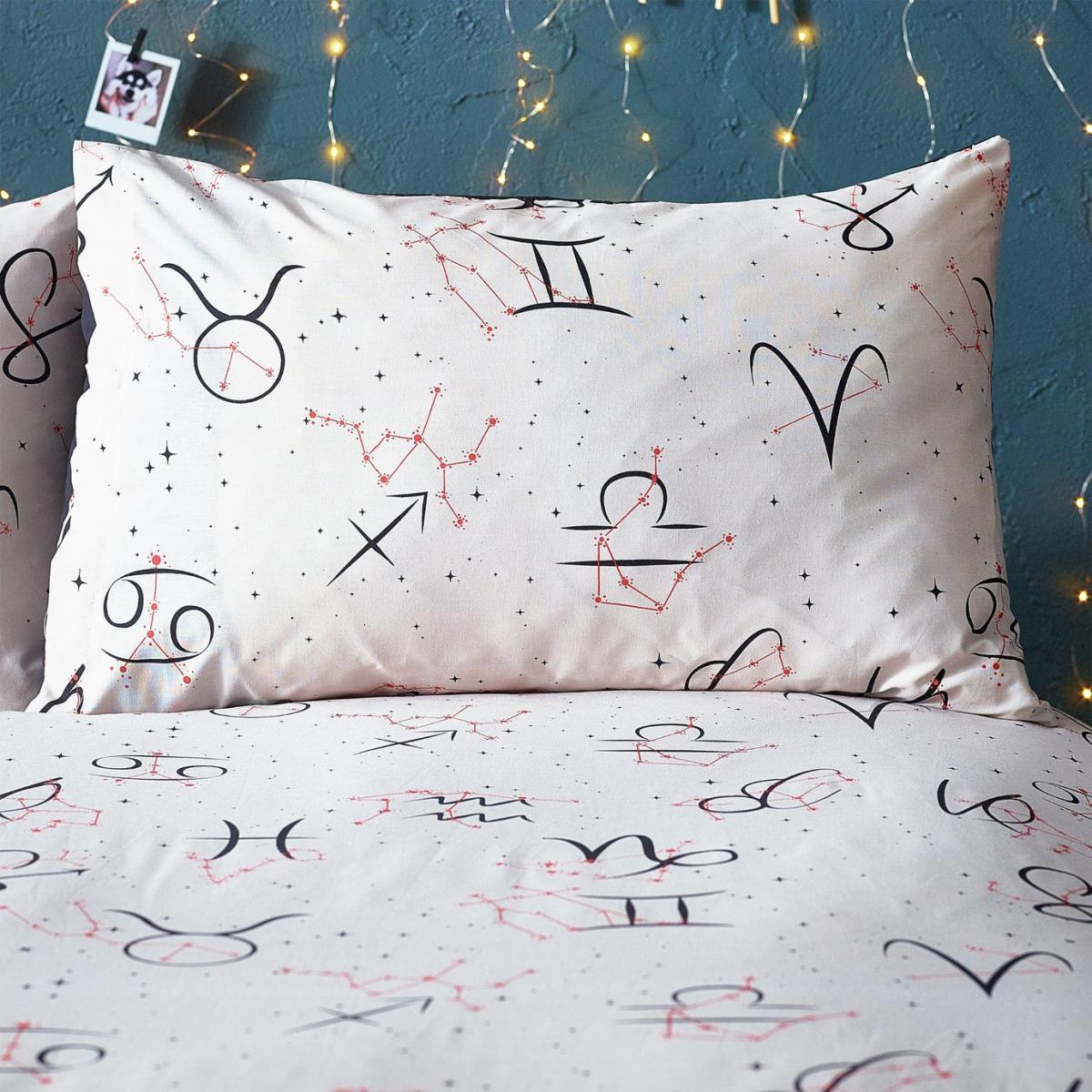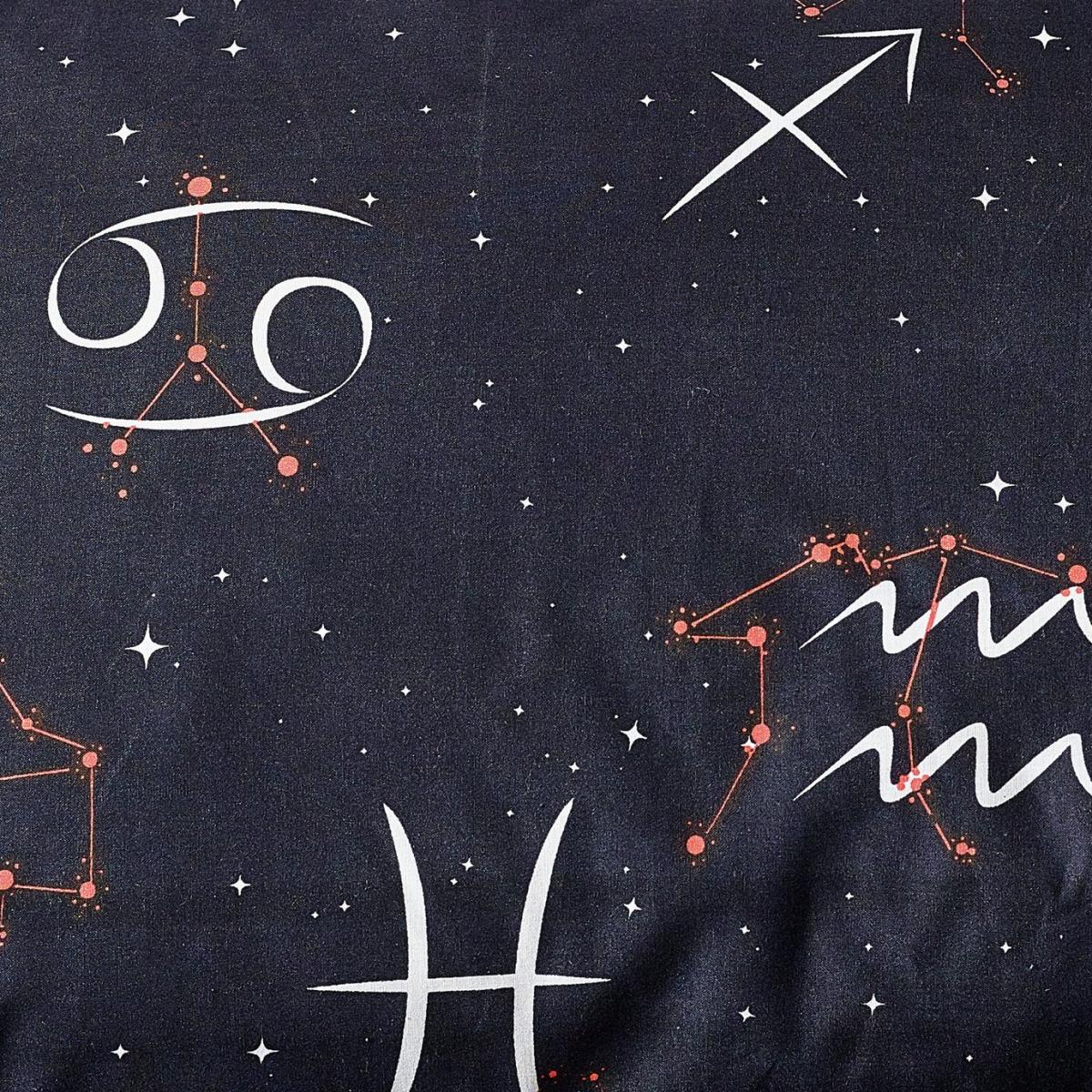 What is your zodiac sign? This zodiac inspired duvet set featuring all the zodiac signs surrounded by star constellations. The design continues to the reverse on a neutral base so you can switch the look when you need to. Have the best night's sleep with this celestial-themed duvet set. Featuring all the zodiac signs surrounded by star constellations. Set comprises of 1 duvet cover and 2 pillowcases. Navy Abstract pattern. Size L200 x W200cm. Pillow case length 75cm, Width 50cm. Standard pillowcase (s). Reversible pillowcase (s). Reversible. Buttons for fastening. Machine washable. Suitable for tumble drying. 50% polyester, 50% cotton. 144 thread count.