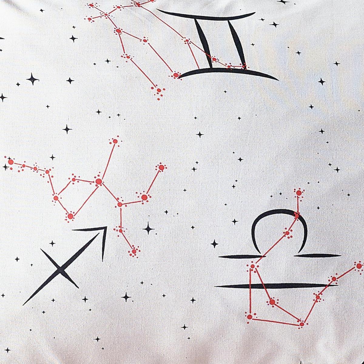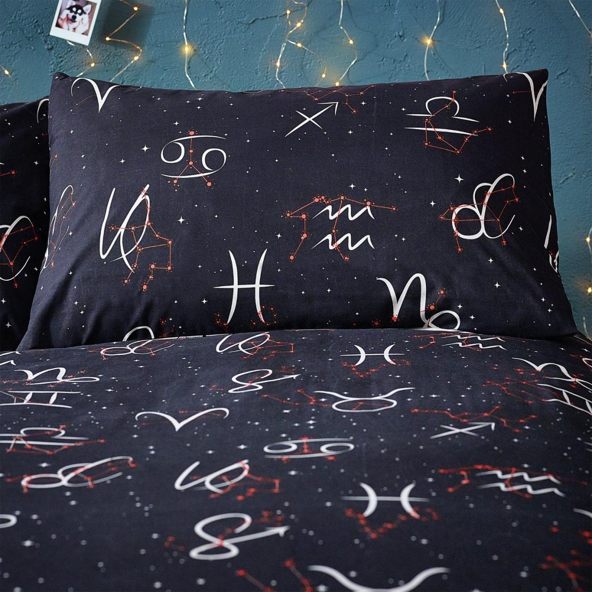 What is your zodiac sign? This zodiac inspired duvet set featuring all the zodiac signs surrounded by star constellations. The design continues to the reverse on a neutral base so you can switch the look when you need to. Have the best night's sleep with this celestial-themed duvet set. Featuring all the zodiac signs surrounded by star constellations. Set comprises of 1 duvet cover and 1 pillowcase. Navy Abstract pattern. Size L200 x W137cm. Pillow case length 75cm, Width 50cm. Standard pillowcase (s). Reversible pillowcase (s). Reversible. Buttons for fastening. Machine washable. Suitable for tumble drying. 50% polyester, 50% cotton. 144 thread count.