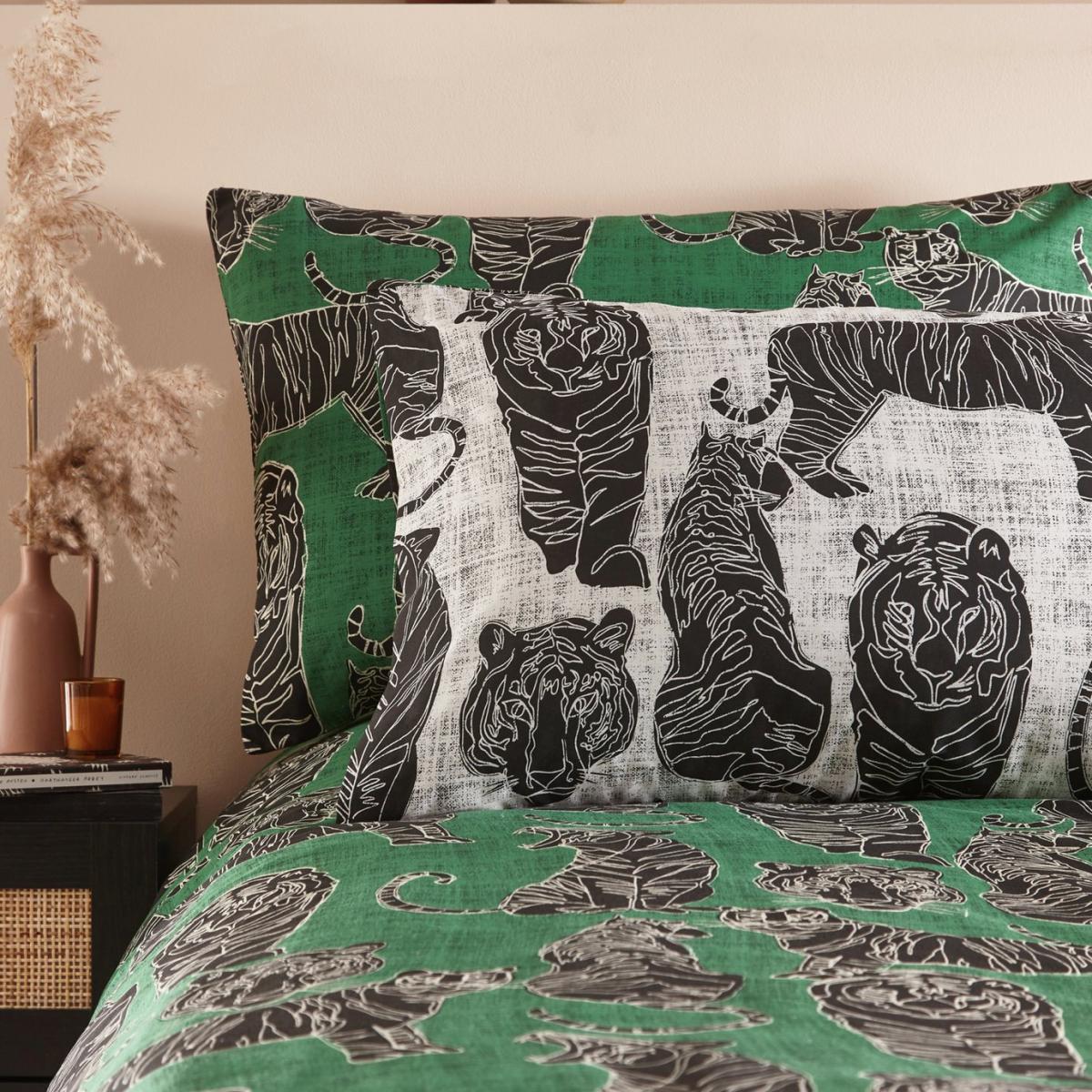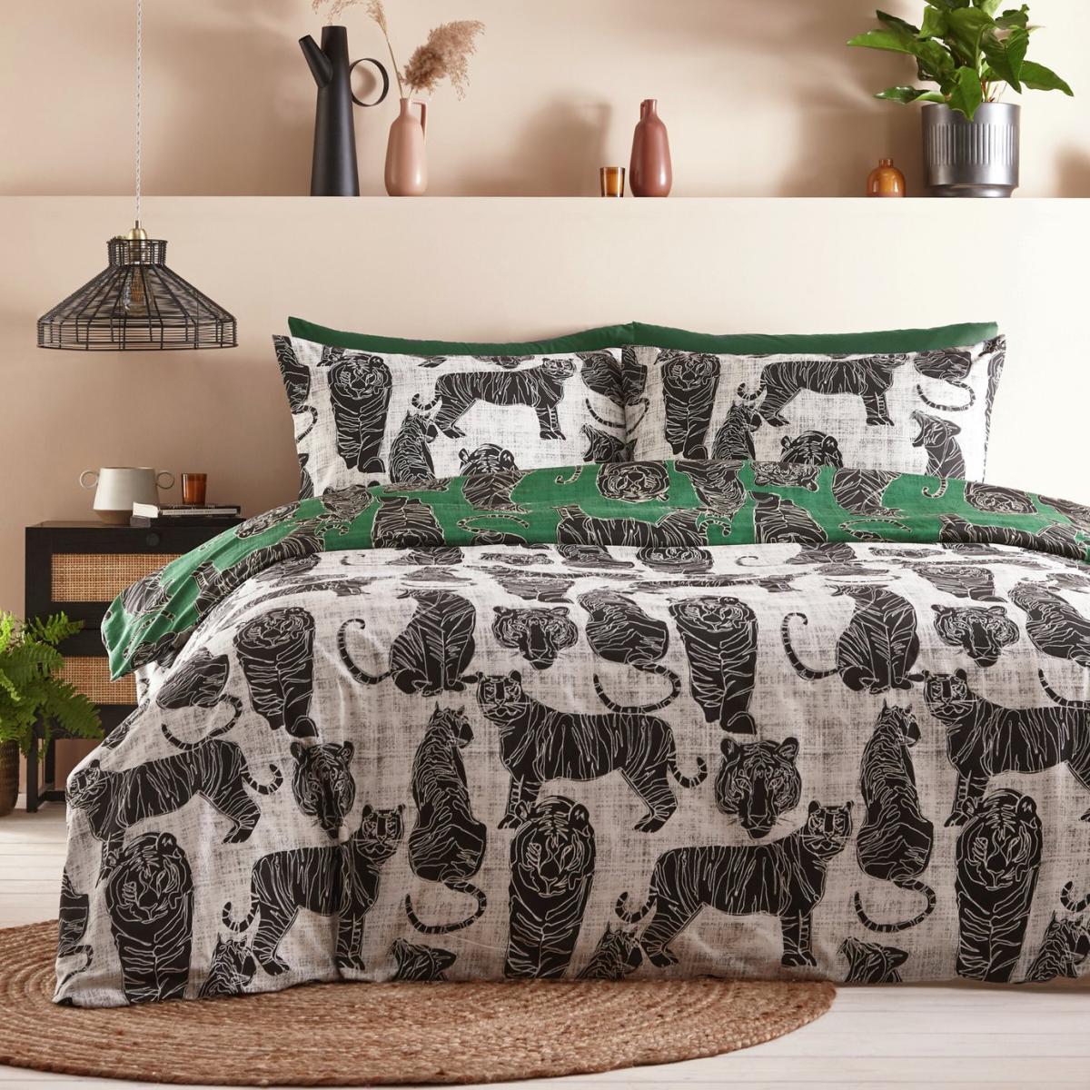 Take a walk on the wild side with this amazingly designed duvet cover set, which blends natural-look textures and bold graphics to create a unique tribal jungle design. Featuring artistic monochrome depictions of lions, tigers and leopards, who pose, prowl and show off against a solid jewel toned green tones. On the reverse the wild cats are displayed against a clean white background for a more relaxing vibe. The choice is yours! Featuring bold graphics printed on natural look textures for a unique tribal jungle design, and set on a jewel toned green background. Complete with an alternative reverse design with the wildcats set against a clean, white background for a more relaxed look. 50% cotton , 50% polyester. 144 thread count. Set includes 1 duvet cover and 1 pillowcase. Bed size: single. Length 200cm, Width 135cm. Reversible. Buttons for fastening. Standard pillowcase (s). Pillow case length 75cm, Width 50cm. Reversible pillowcase (s). Machine washable. Suitable for tumble drying.