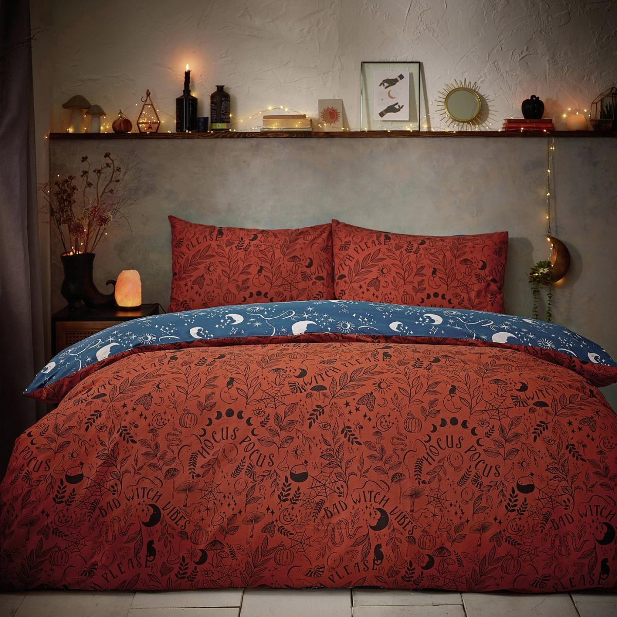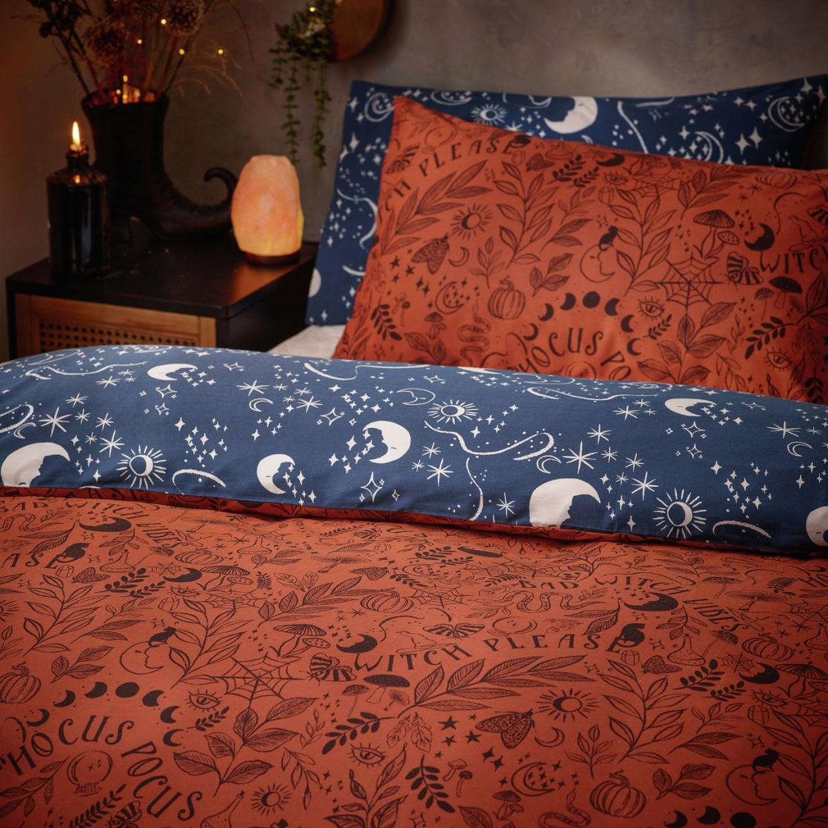 Hubble, bubble toil and trouble! The spellbindingly luxurious Witchy Vibes duvet cover set adds modern Halloween magic to your bedroom! Designed with eye of newt, stalk of mushroom and head of snake, this set is sure to cast a sleep spell on all who lay in it! Choose from a front design of spellbound icons, botanicals, witchy expressions set on a warm, spicy orange toned background. For two vivid looks in one, the reverse is complete with a midnight sky scene. A quirky seasonal addition for all you budding witches and wizards out there! Featuring spellbound icons, creatures and moons set on a warm, spicy-toned background. Complete with a celestial reverse for two looks in one! 50% cotton , 50% polyester. 144 thread count. Set includes 1 duvet cover and 1 pillowcase. Bed size: single. Length 200cm, Width 135cm. Reversible. Buttons for fastening. Standard pillowcase (s). Pillow case length 75cm, Width 50cm. Reversible pillowcase (s). Machine washable. Suitable for tumble drying.