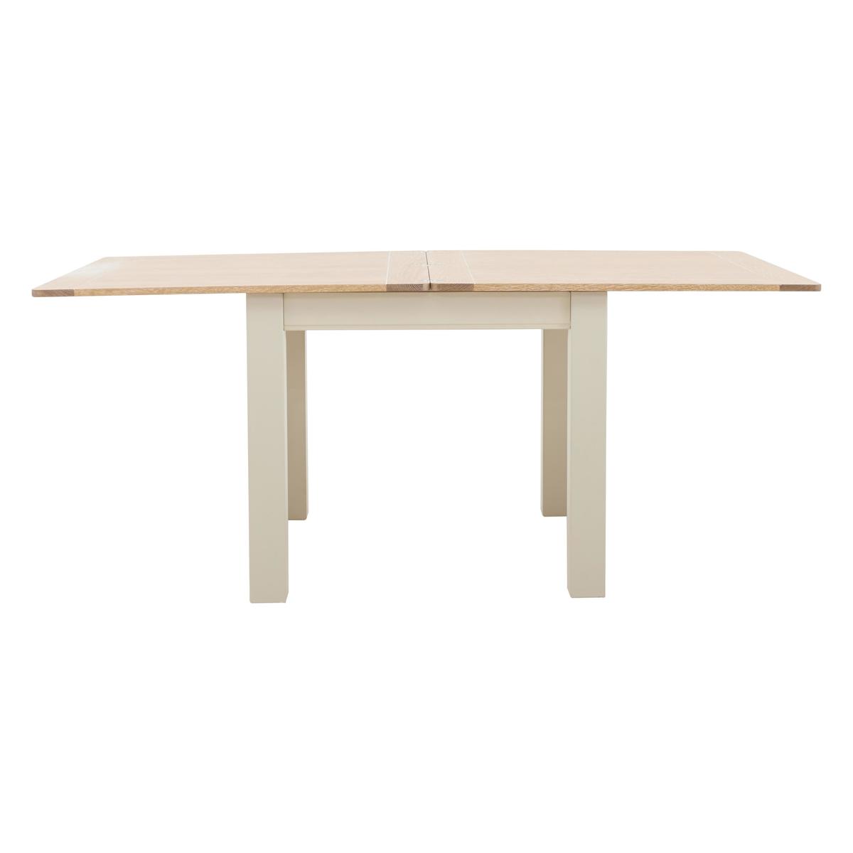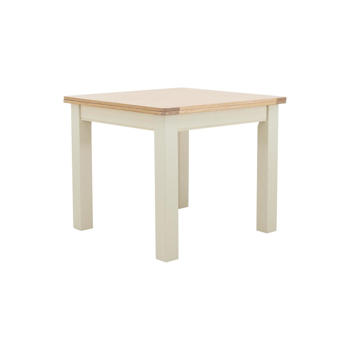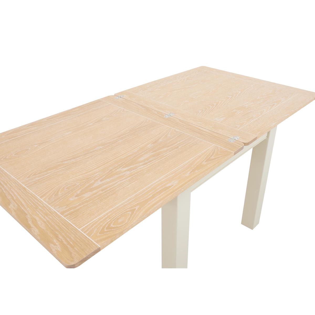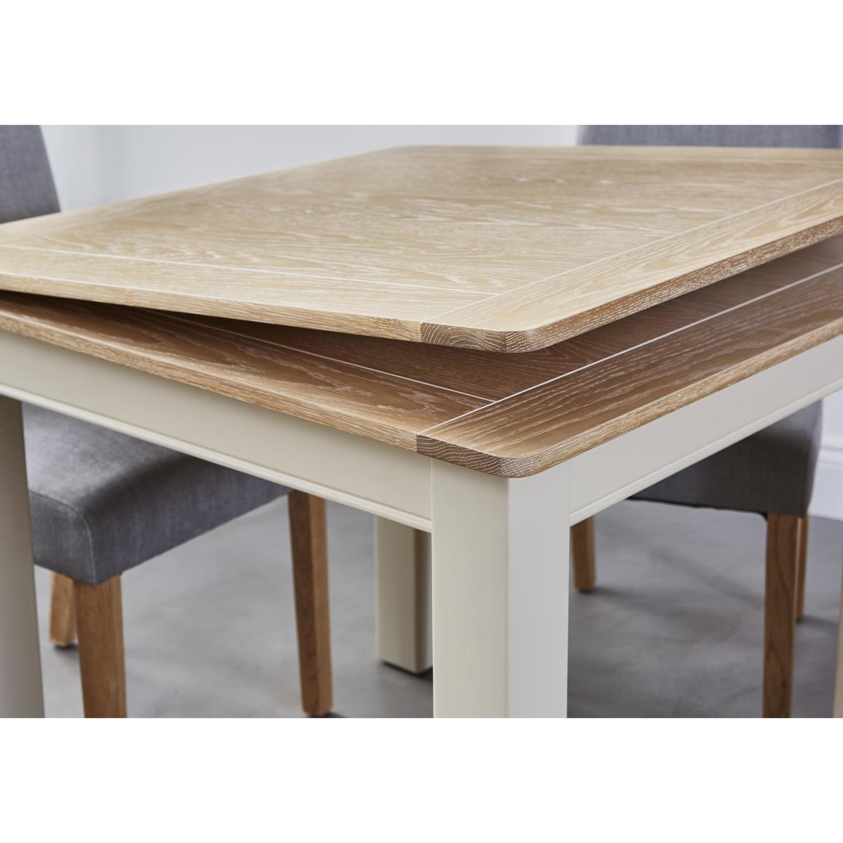 Ideal for the smaller dining space, the Angeles flip top extending dining table starts life as a perfectly proportioned square dining table and then quickly converts to a six-seater rectangular dining table with a smooth hinge and slide extension system. But whatever size your dining room, you’ll love its simple relaxed style and gorgeous real wood construction. The hand-finished solid oak and oak veneer top has a bevelled edge and features a stylish wash which highlights the wood’s natural tone and texture. The base is made of solid pine, has squared legs and is painted a subtle off-white. Versatile and practical, the Angeles flip top extending dining table is part of the extensive Angeles living and dining collection. Choose from three styles of dining chair and complete the look with useful storage, like the Angeles small sideboard or the Angeles glazed display cabinet. A Furniture Village exclusive. Natural wood has unique grain, knots and markings. Every piece is different.