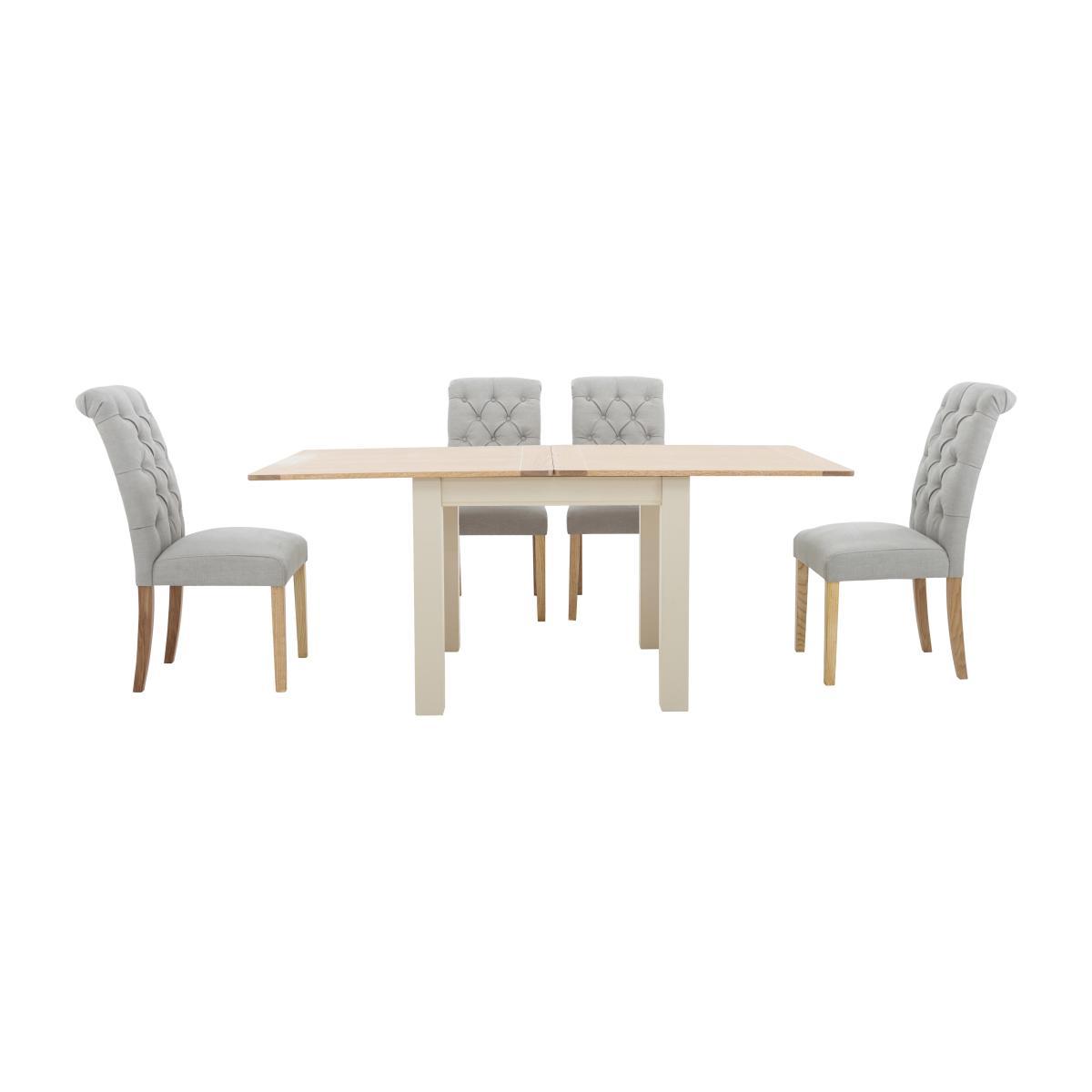 Versatile, stylish and beautifully finished, Angeles has something for every home. With its clean-lined, modern country style, this extensive range includes three different extending dining tables and three different dining chairs, so you can mix and match to create your perfect dining room. Complete the look with sideboards or a glazed hutch, and then introduce Angeles’ relaxed contemporary style into your living space with a wide selection of occasional tables and storage units. The Angeles flip top extending dining table and 4 button back dining chairs set is a study in creative and versatile designer style. The gorgeous dining table extends from a compact square dining table, seating four, to a larger rectangular table, seating six, with a smooth hinge and slide system. It’s sturdily constructed with a solid oak and oak veneer top, hand finished with a wash that’s brings out the wood grain. The square legs are solid pine painted a subtle off-white. The four button back chairs are fully upholstered in a linen-look fabric in your choice of ten lovely colours, and feature neat rows of buttoning, gently rolled tops and oak legs. Hardwood frames and serpentine sprung seats mean that they’re exceptionally comfortable, too. The Angeles flip top extending dining table and 4 button back dining chairs set is part of the incredibly well-priced Angeles furniture collection. A Furniture Village exclusive. Natural wood has unique grain, knots and markings. Every piece is different.