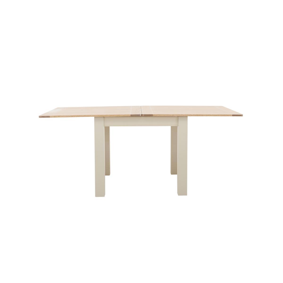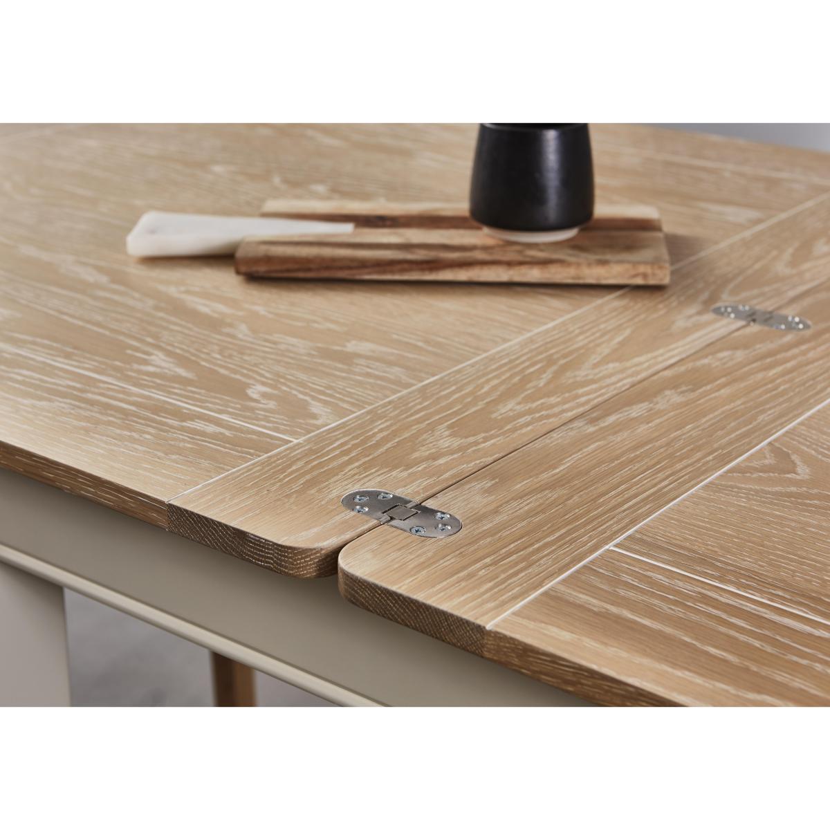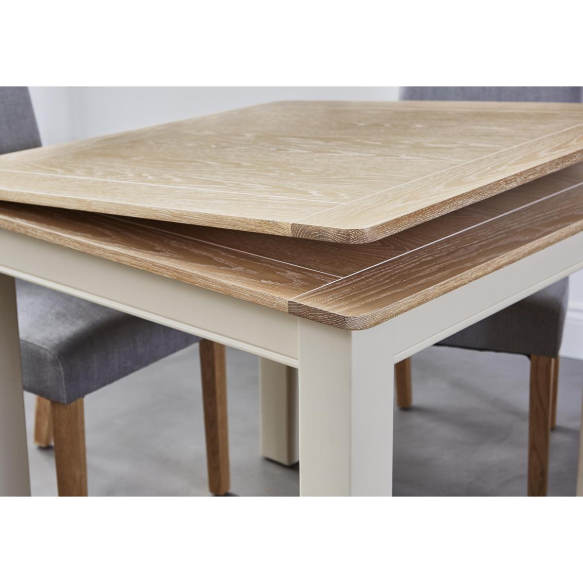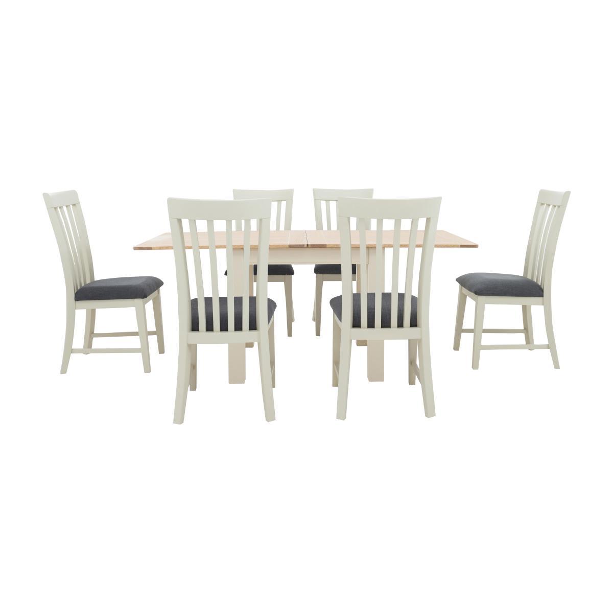 Versatile, stylish and beautifully finished, Angeles has something for every home. With its clean-lined, modern country style, this extensive range includes three different extending dining tables and three different dining chairs, so you can mix and match to create your perfect dining room. Complete the look with sideboards or a glazed hutch, and then introduce Angeles’ relaxed contemporary style into your living space with a wide selection of occasional tables and storage units. Seat them all in style with the Angeles flip top extending dining table and 6 wooden dining chairs set. This dining set comprises a square dining table that converts to a six-seater rectangular dining table with a smooth hinge and slide mechanism. It features a solid oak and oak veneer top and solid pine legs; the top has bevelled edges and is hand finished with a stylish wash that brings out the gorgeous oak grain, and the legs are painted off-white. It’s paired with six wooden dining chairs with slatted dining backs are made of solid pine, painted off white. Chairs have deep top rails and seat pads upholstered in a smoke grey linen-effect fabric. The Angeles flip top extending dining table and 6 wooden dining chairs set is part of the versatile and affordable Angeles furniture collection for both dining rooms and living spaces. Exclusive to Furniture Village. Natural wood has unique grain, knots and markings. Every piece is different.