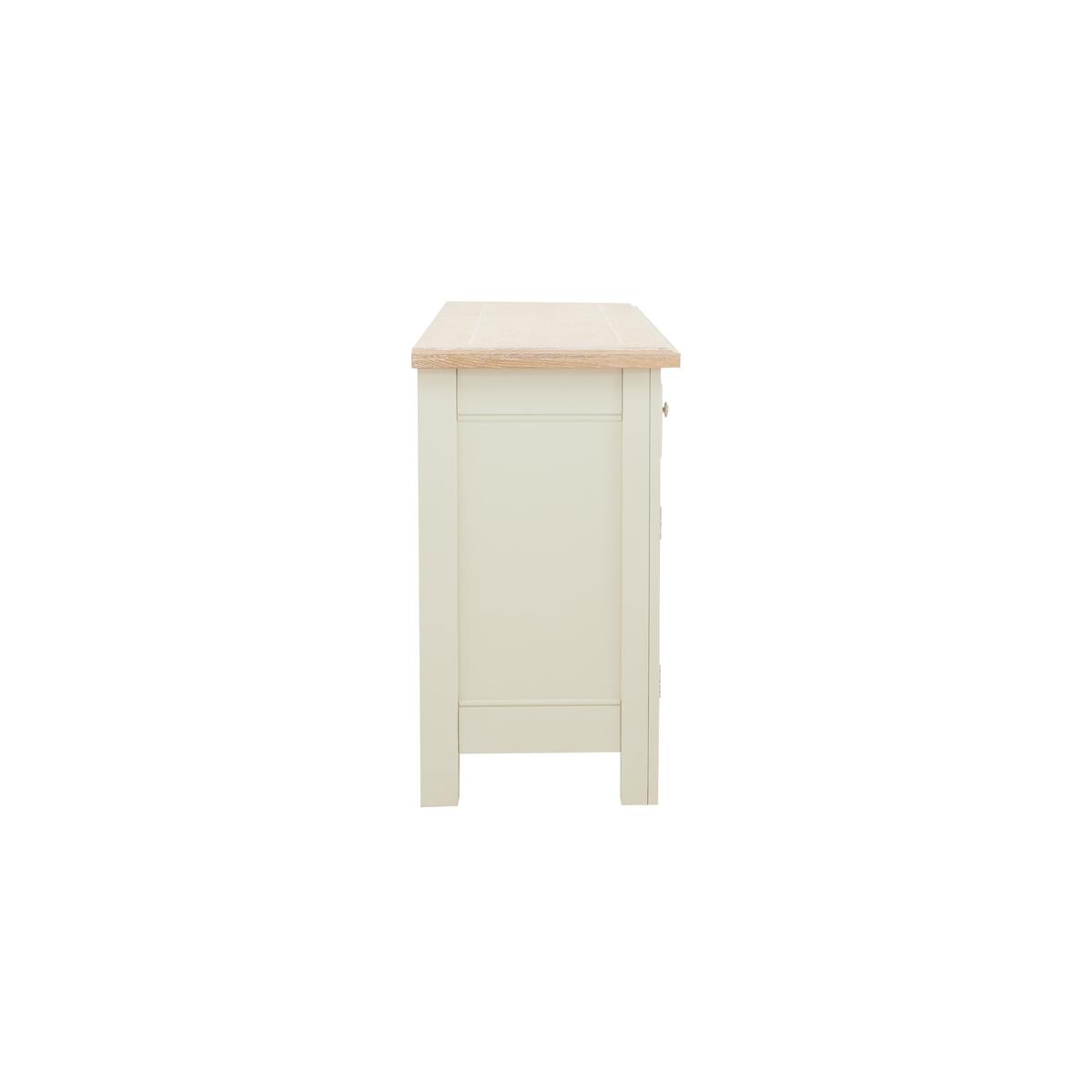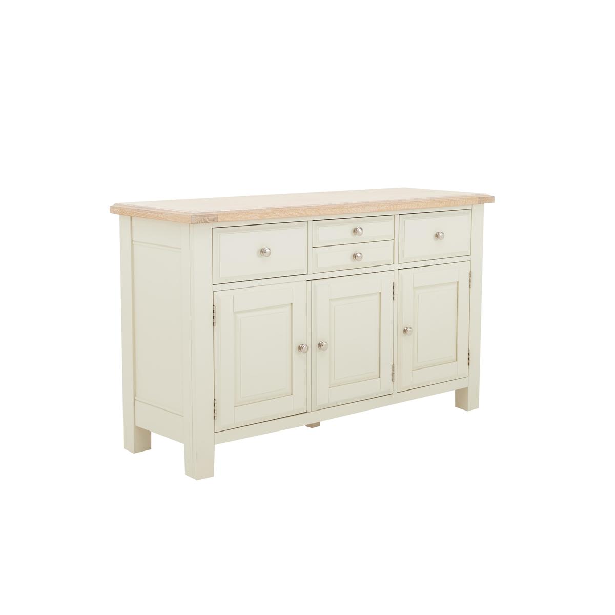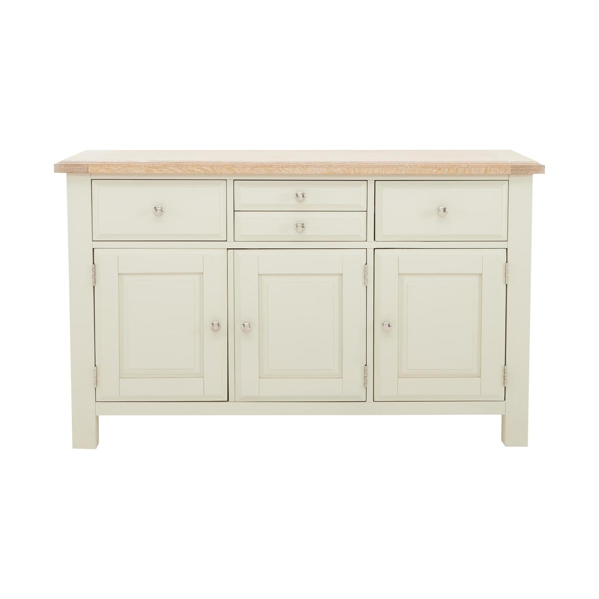Offering superb storage, the Angeles large sideboard is yours at an incredible price. Clean lines, squared edges and interesting details characterise this piece. Its solid oak and oak veneer top has an overhanging bevelled edge and is hand-finished with a wash that enhances the wood’s natural grain. The base is made of solid pine, painted a subtle off-white. Cupboard doors and drawer edges are bevelled, and are finished with round metal handles. There’s one double door cupboard and one single-door cupboard, each with 1 adjustable shelf, plus two deep drawers and two slim drawers for cutlery. The Angeles large sideboard is part of the great-value Angeles living and dining collection. As well as a choice of storage pieces – the range also includes a display cabinet, a TV cabinet, a small sideboard and a bookcase – you’ll find three different styles of extending dining table and dining chairs. Only at Furniture Village. Tip: Natural wood has unique grain, knots and markings. Every piece is different.