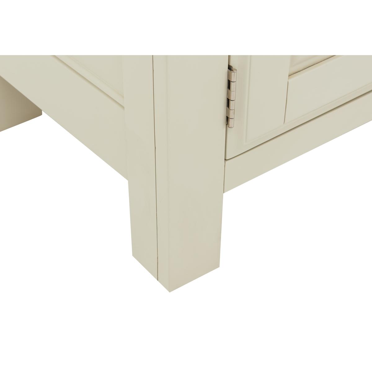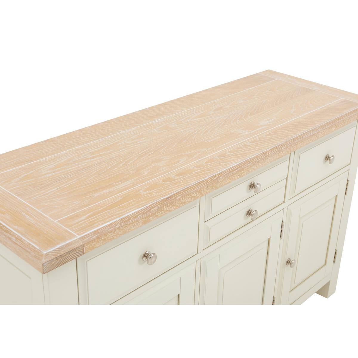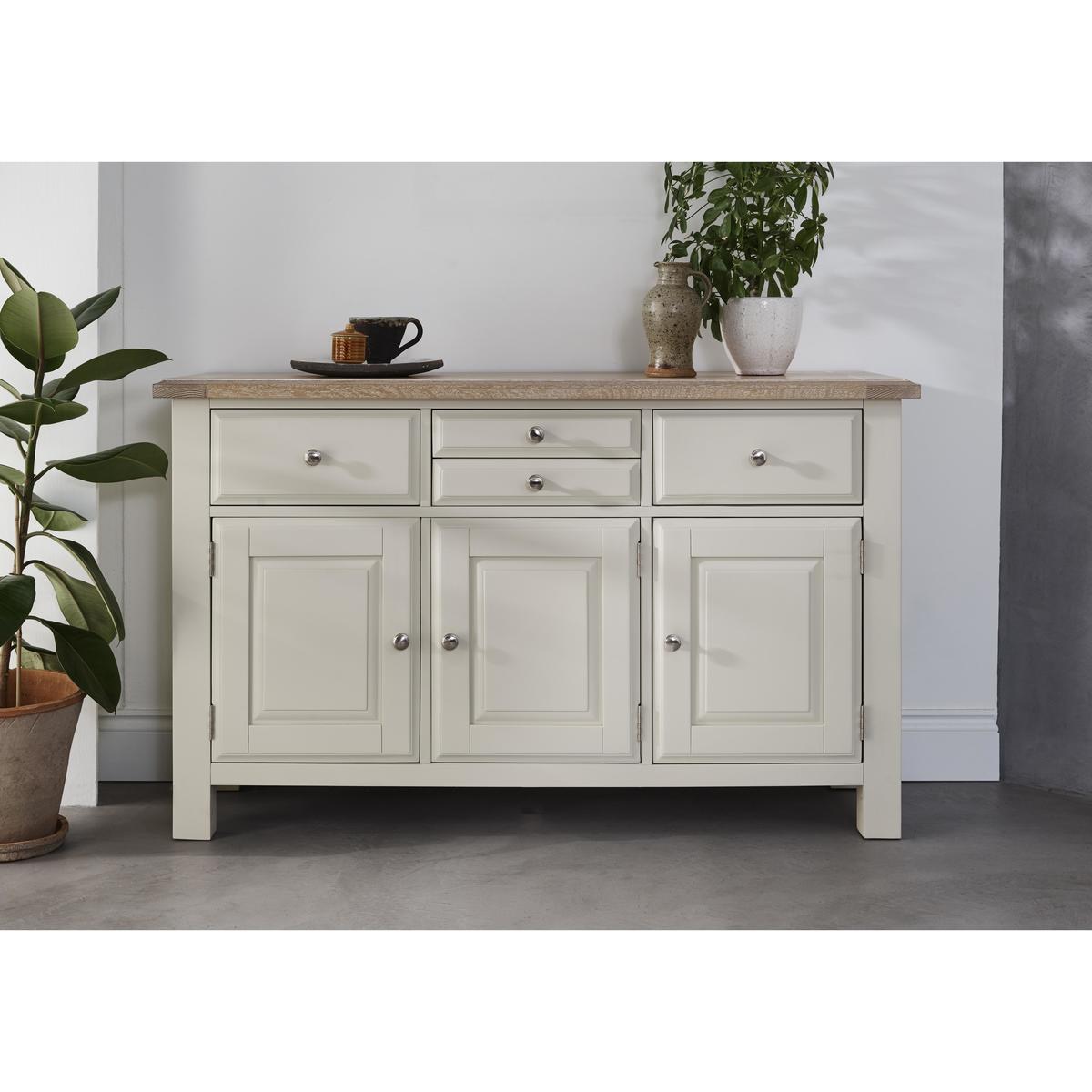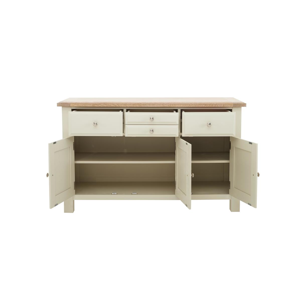 Offering superb storage, the Angeles large sideboard is yours at an incredible price. Clean lines, squared edges and interesting details characterise this piece. Its solid oak and oak veneer top has an overhanging bevelled edge and is hand-finished with a wash that enhances the wood’s natural grain. The base is made of solid pine, painted a subtle off-white. Cupboard doors and drawer edges are bevelled, and are finished with round metal handles. There’s one double door cupboard and one single-door cupboard, each with 1 adjustable shelf, plus two deep drawers and two slim drawers for cutlery. The Angeles large sideboard is part of the great-value Angeles living and dining collection. As well as a choice of storage pieces – the range also includes a display cabinet, a TV cabinet, a small sideboard and a bookcase – you’ll find three different styles of extending dining table and dining chairs. Only at Furniture Village. Tip: Natural wood has unique grain, knots and markings. Every piece is different.