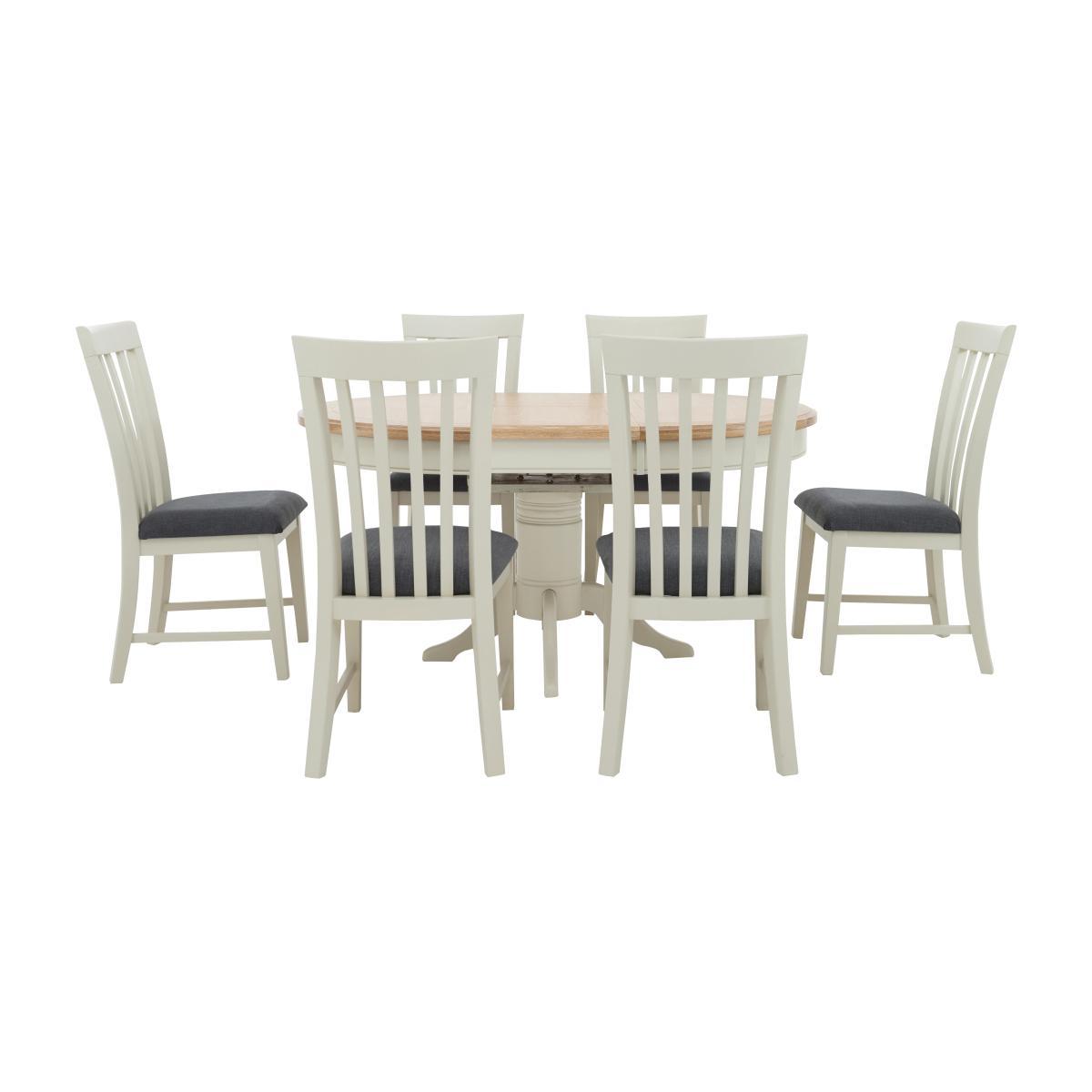 Versatile, stylish and beautifully finished, Angeles has something for every home. With its clean-lined, modern country style, this extensive range includes three different extending dining tables and three different dining chairs, so you can mix and match to create your perfect dining room. Complete the look with sideboards or a glazed hutch, and then introduce Angeles’ relaxed contemporary style into your living space with a wide selection of occasional tables and storage units. Stylish and inviting, the Angeles round extending dining table and 6 wooden dining chairs set is the perfect dining set for a relaxed kitchen or dining room. Extending to seat six with a butterfly mechanism, the circular dining table is thoughtfully designed and beautifully crafted. The top is solid oak and oak veneer and has a bevelled edge. It’s hand finished with a wash, which adds to the contemporary feel while enhancing the oak’s wood grain. It rests on a pedestal base made of solid pine and painted an understated off-white. The six accompanying wooden dining chairs are made of solid pine with an off-white painted finish and have slatted backs, deep top rails and comfortable seat pads upholstered in a smoky-grey linen-effect fabric. A contemporary version of casual country style, the affordably-priced Angeles round extending dining table and 6 wooden dining chairs set is part of the Furniture Village-exclusive Angeles furniture collection. Natural wood has unique grain, knots and markings. Every piece is different.