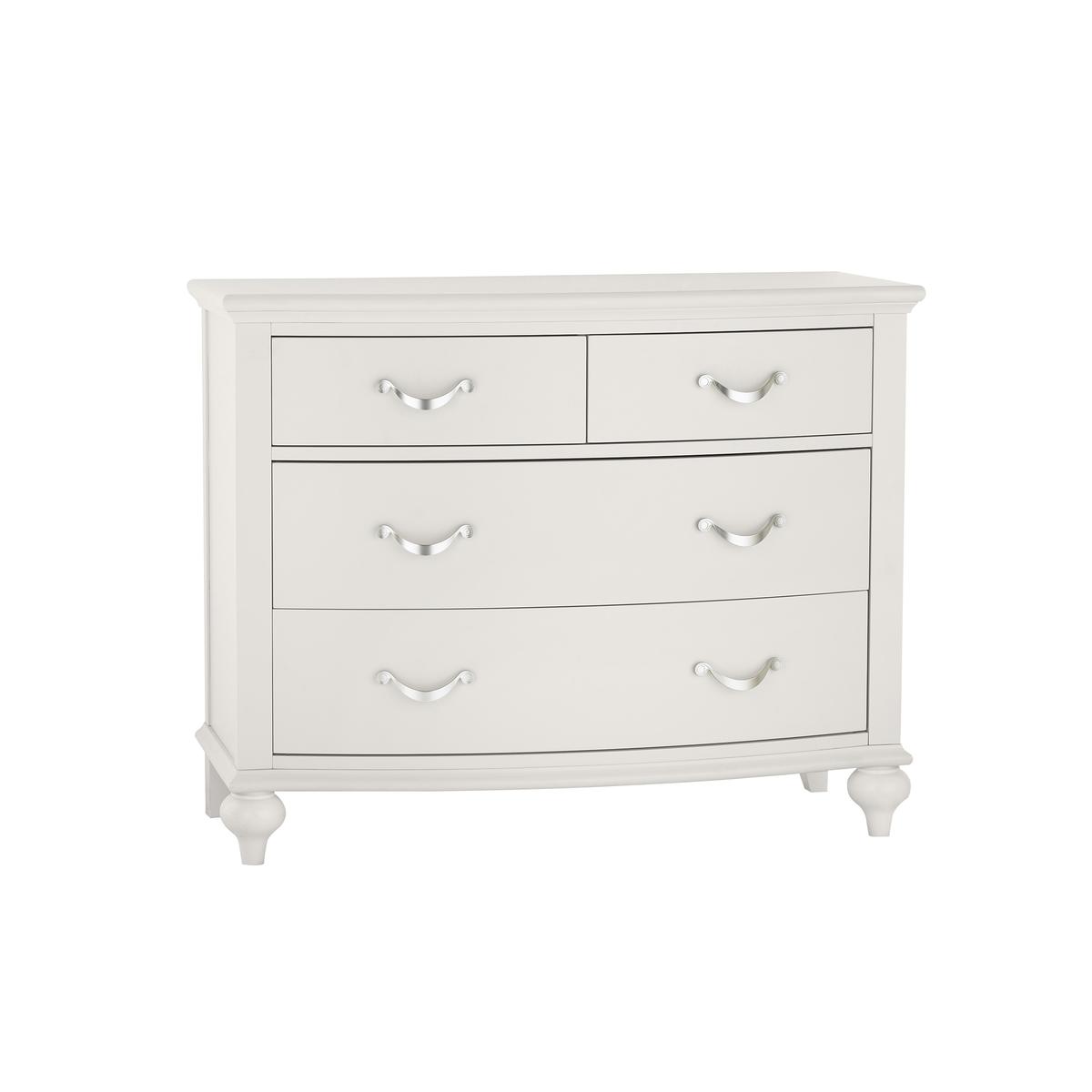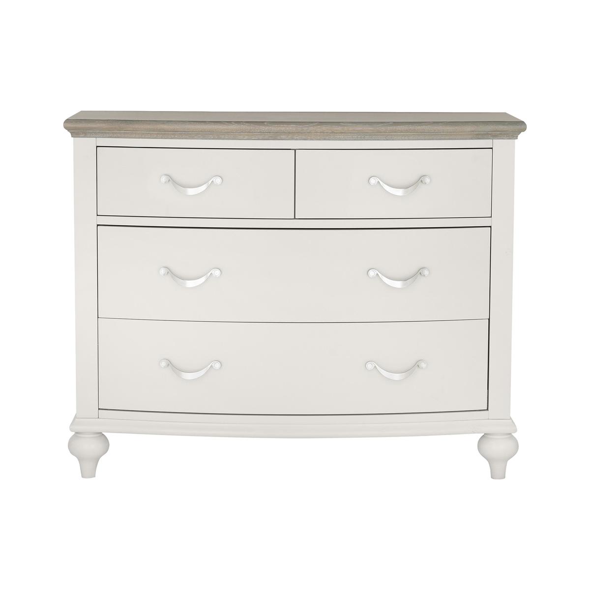 The Annecy bedroom collection is relaxed and quietly elegant. Soft grey painted-finish bases are complemented by either grey painted or grey washed oak tops, with solid edges and exquisite marquetry pattern veneers. Classic detailing includes turned and tapered table legs, bow fronts on the cabinets, Blum soft close drawers and curved satin finish handles. Fresh, elegant chest of drawers. Soft grey painted finish. Grey washed oak top has exquisite marquetry pattern veneers. Four soft close drawers with satin finish handles. Beautiful bow front and classic turned ball feet. Timeless style suits both modern and classic décor. Did you know?. Oak is natural with characterful knots and markings, every piece of furniture is unique. WARNING!. Furniture can tip over unexpectedly and cause injury. This item shall be fixed to a wall using the anti-tip kit provided with the furniture. Be sure to use the correct wall fixings suitable for the walls in your home.