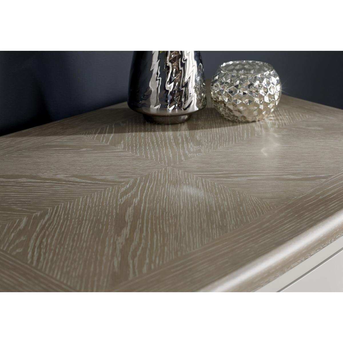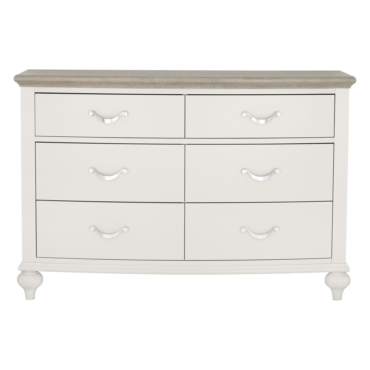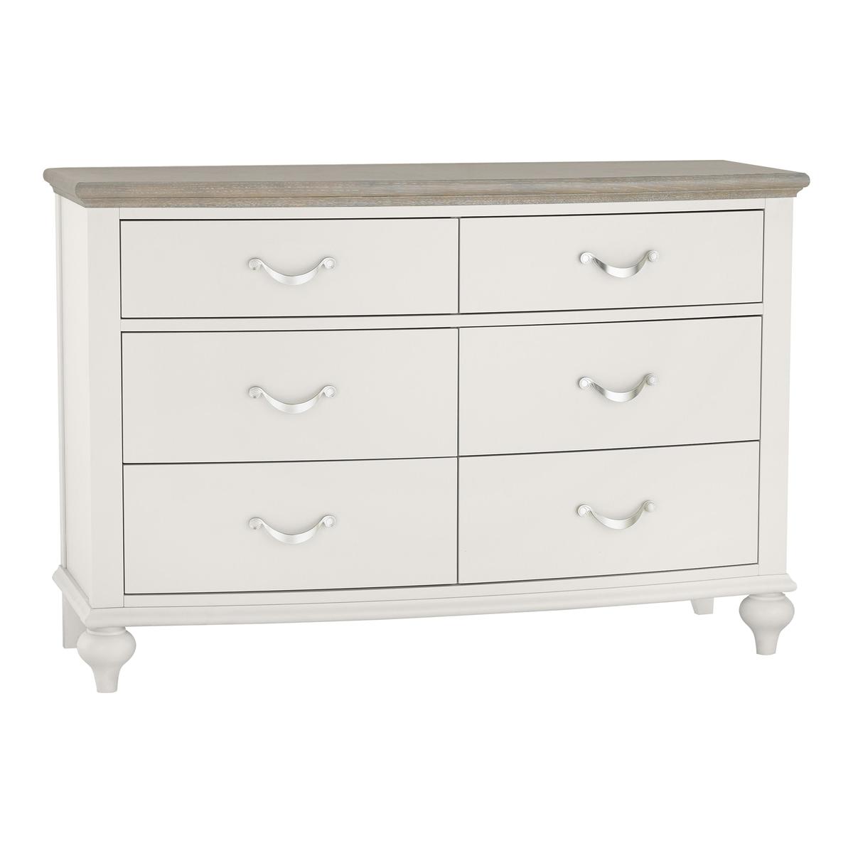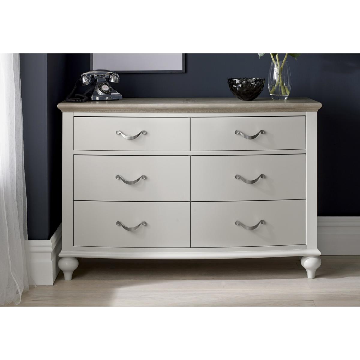The Annecy bedroom collection is relaxed and quietly elegant. Soft grey painted-finish bases are complemented by either grey painted or grey washed oak tops, with solid edges and exquisite marquetry pattern veneers. Classic detailing includes turned and tapered table legs, bow fronts on the cabinets, Blum soft close drawers and curved satin finish handles. Fresh, elegant six drawer chest of drawers. Soft grey painted finish. Grey washed oak top has exquisite marquetry pattern veneers. Six soft close drawers with satin finish handles. Beautiful bow front and classic turned ball feet. Timeless style suits both modern and classic décor. Did you know?. Oak is natural with characterful knots and markings, every piece of furniture is unique. WARNING!. Furniture can tip over unexpectedly and cause injury. This item shall be fixed to a wall using the anti-tip kit provided with the furniture. Be sure to use the correct wall fixings suitable for the walls in your home.