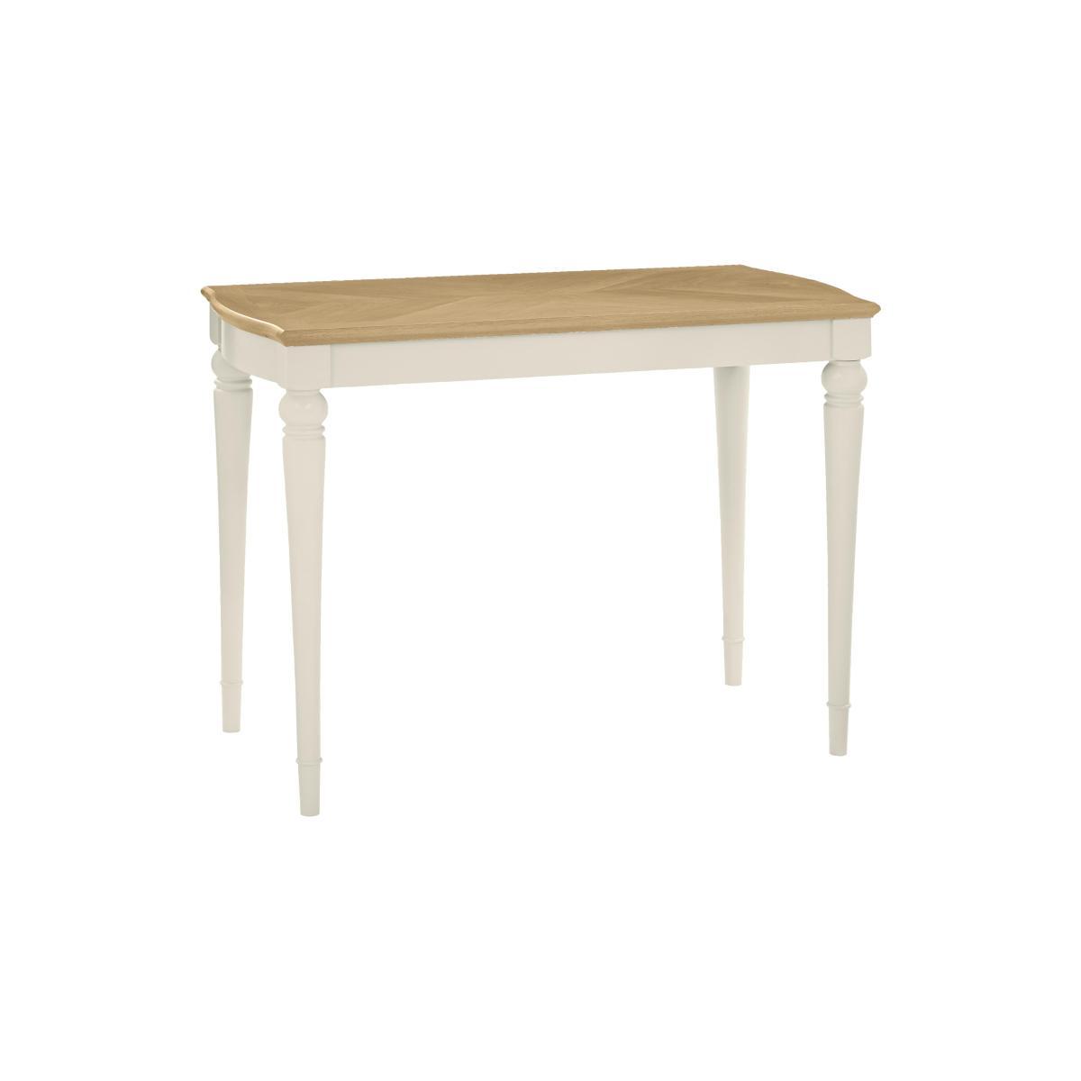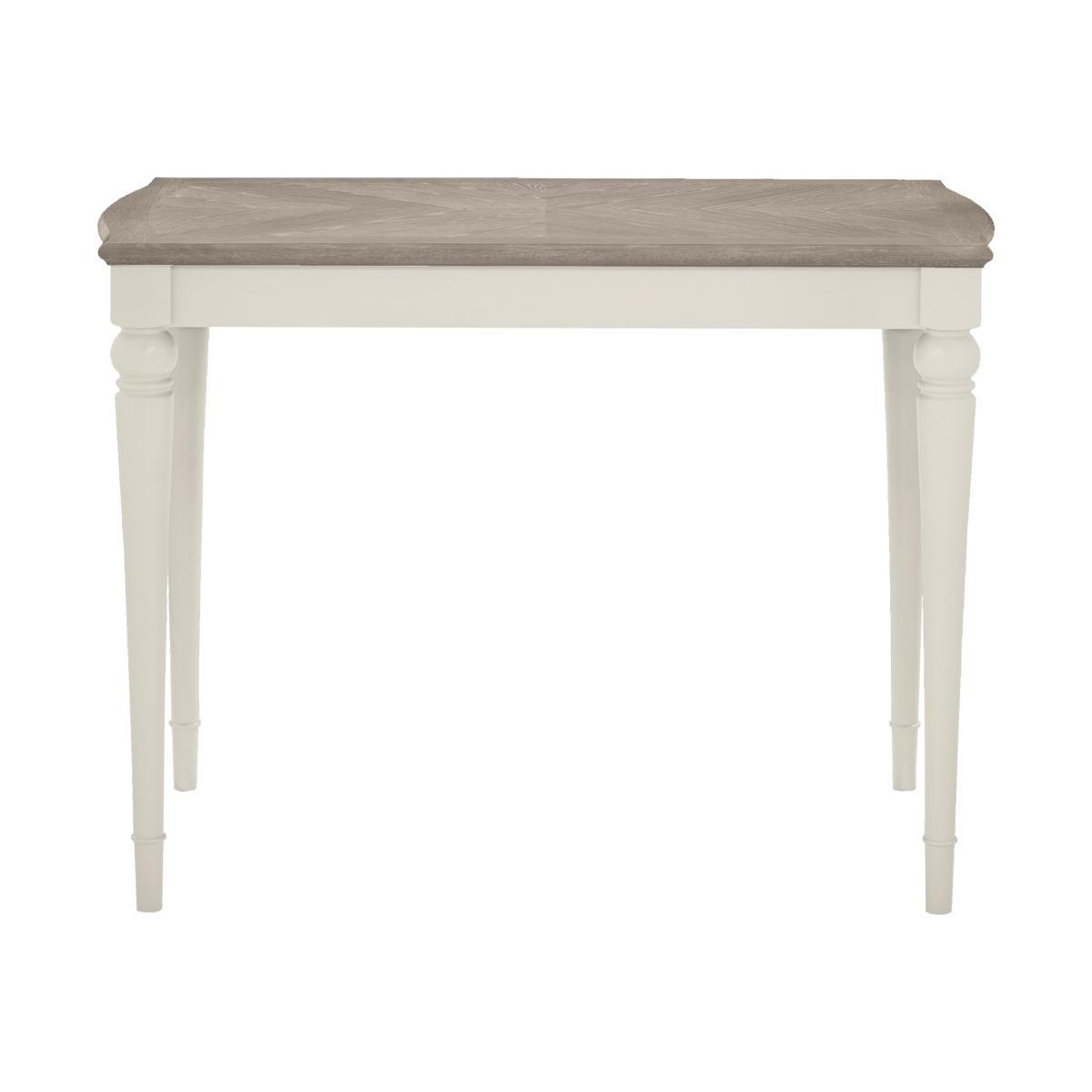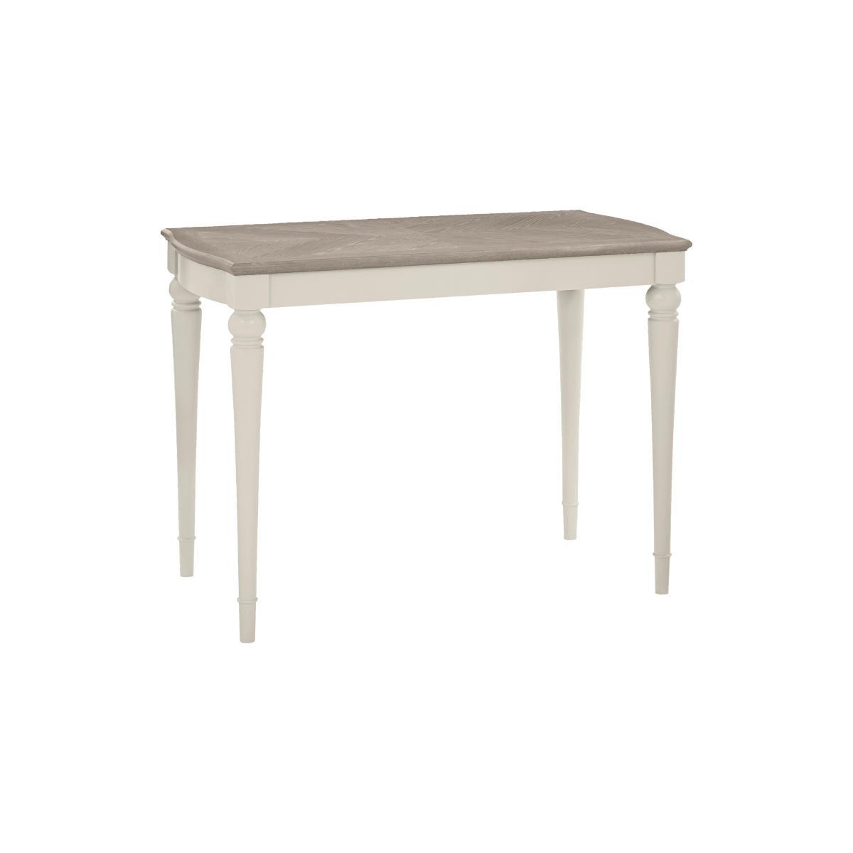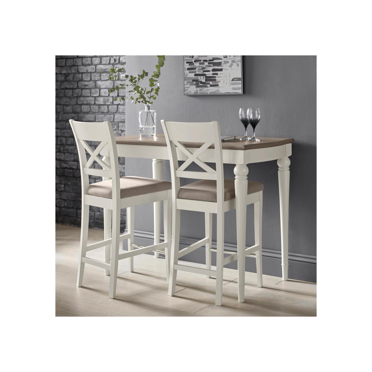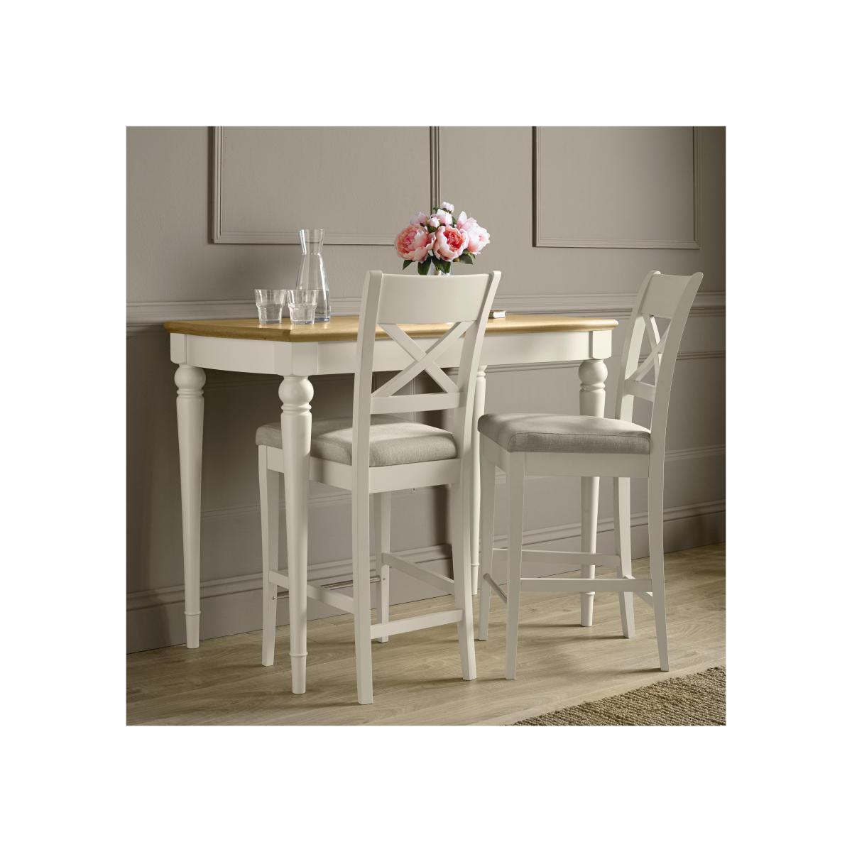 The Annecy dining collection is beautifully elegant in the dining room, and quietly relaxed in the kitchen. Soft grey or antique white painted-finish bases are complemented by grey washed oak or pale oak tops, finished with exquisite marquetry pattern veneers. Classic detailing includes turned and tapered table legs, bow fronts, soft close drawers and curved satin finish handles. With two styles of dining chair. Compact and stylish, the Annecy bar table is a perfectly elegant solution for kitchen dining. Every detail is exquisite. The table top, with gently curved ends and a solid edge, is inlaid with exquisite marquetry patterned veneers. The tapered legs are beautifully turned. The frame and legs are solid beech, wonderfully sturdy and well crafted. Choose from two different but equally stylish looks – a grey washed oak table top with soft grey painted frame and legs, or pale natural oak top with antique-white painted frame and legs. Part of the Annecy collection of dining and occasional furniture, the Annecy bar table is designed to pair with the Annecy pair of faux leather cross back bar stools or the Annecy pair of faux leather roll back bar stools. Both styles are also available with soft fabric upholstery, and in a choice of colours. Did you know?. Oak is natural with characterful knots and markings, every piece of furniture is unique.