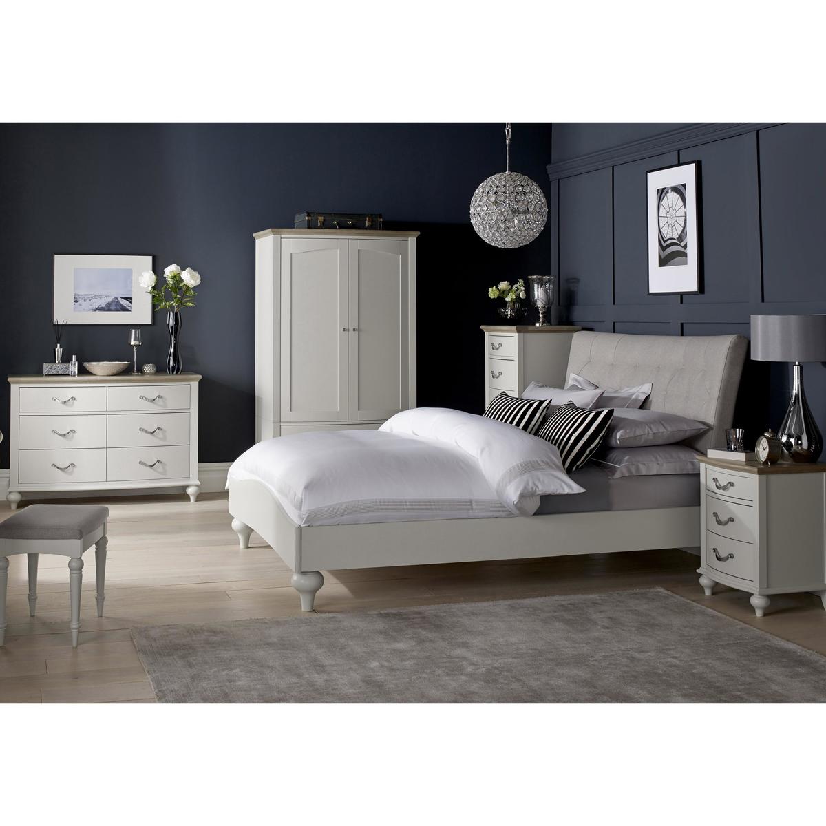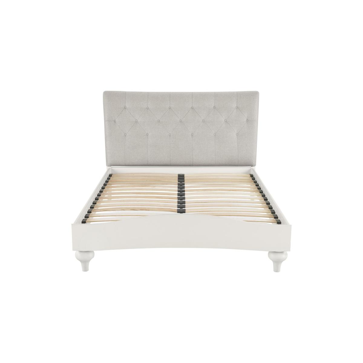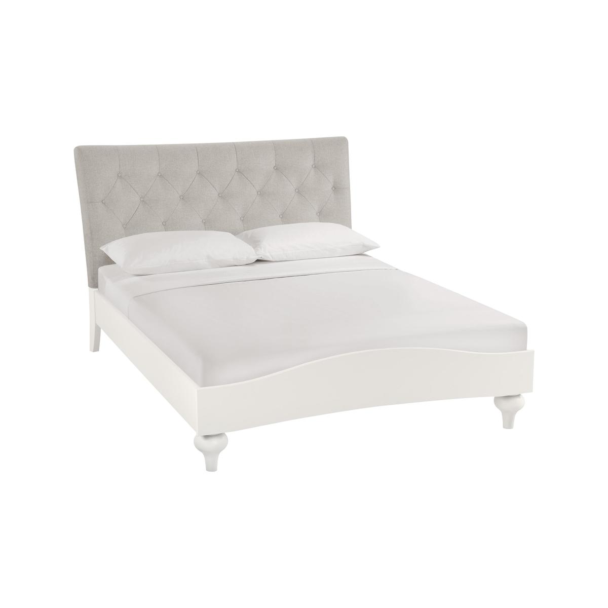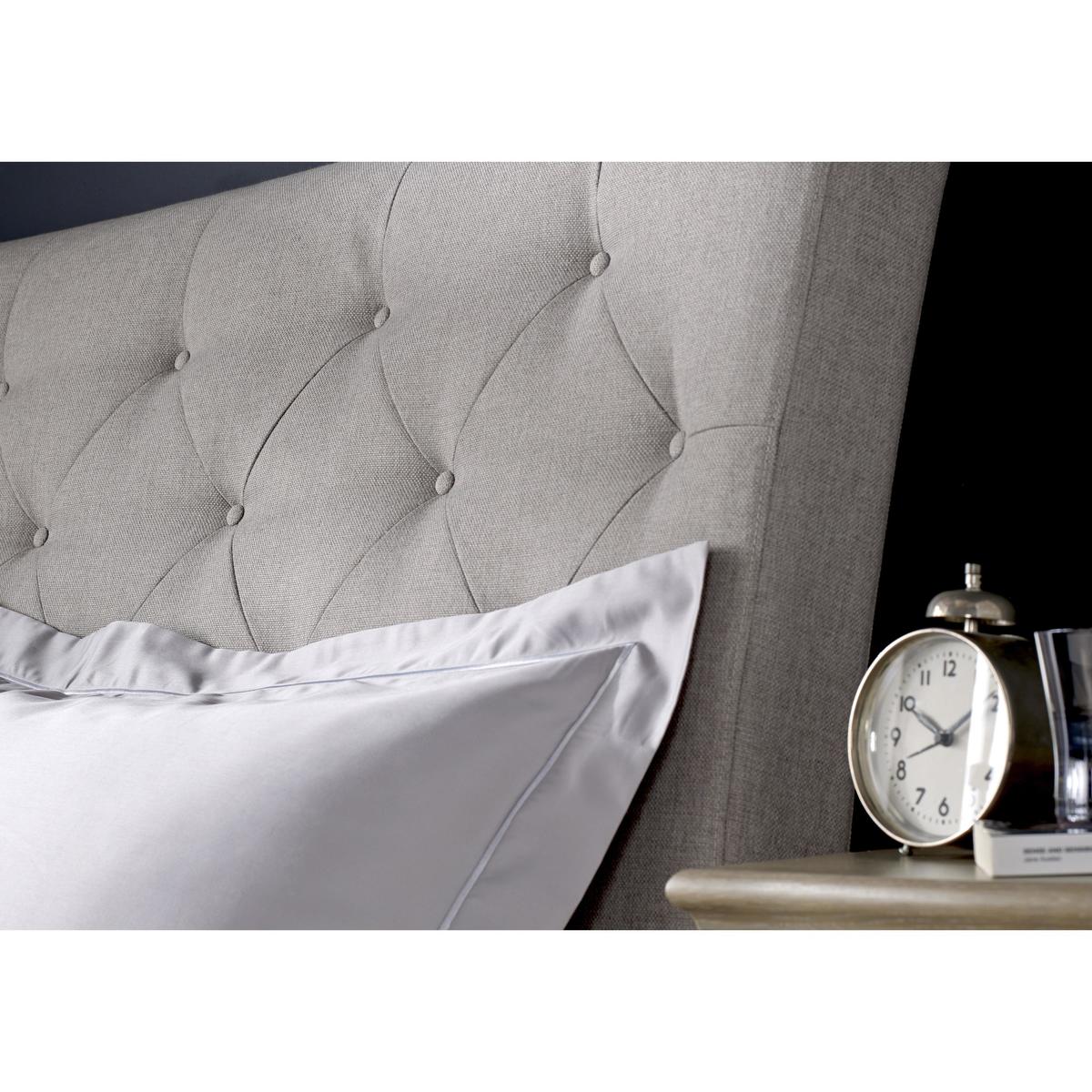 Headboard comes as one single piece. Luxurious bedstead upholstered in grey fabric. Base painted soft grey. Beech sprung slats. Classic turned ball feet. Buttoned, cushioned headboard creates an opulent focal point. Headboard features diamond stitch. Timeless style suits both modern and classic décor. Mattress available separately