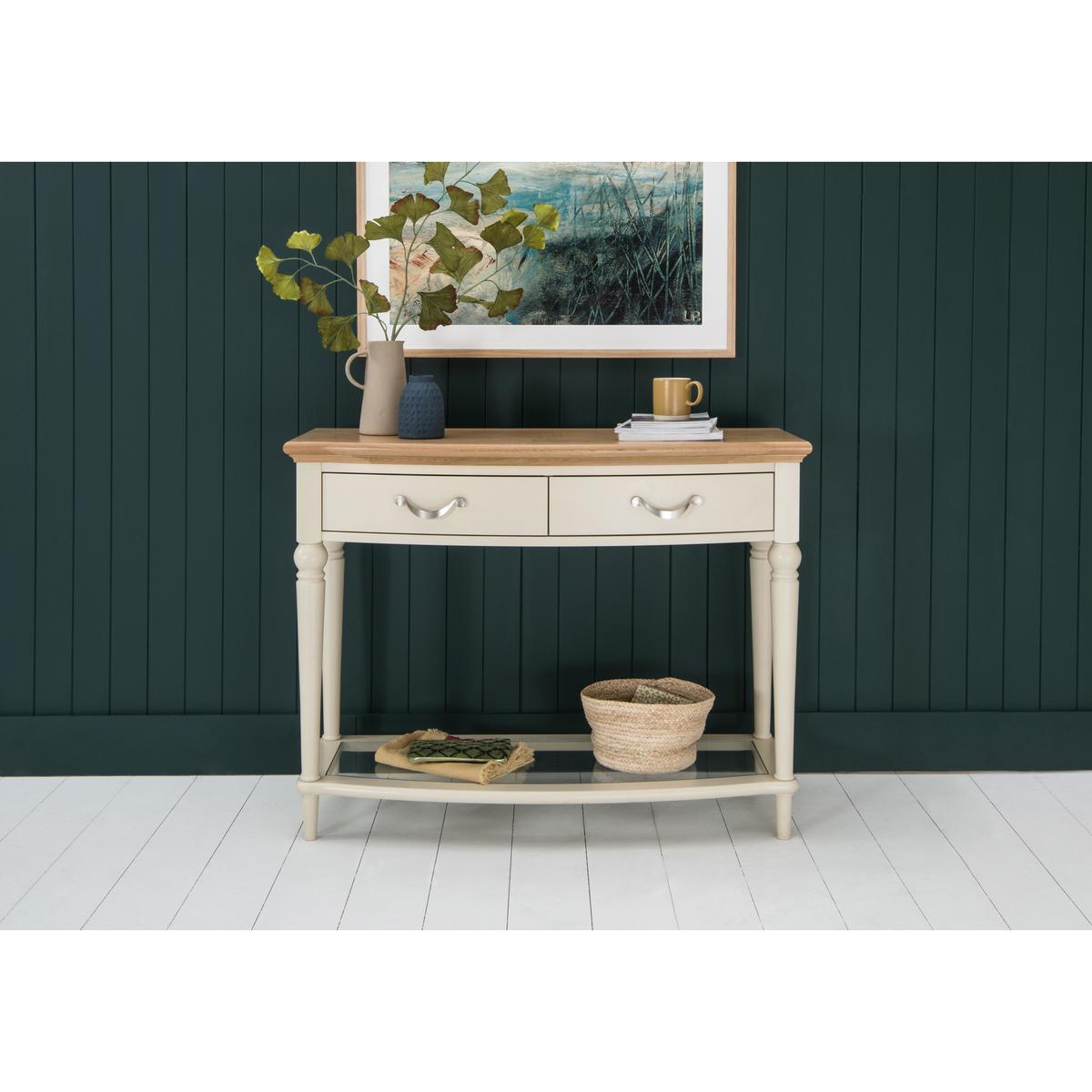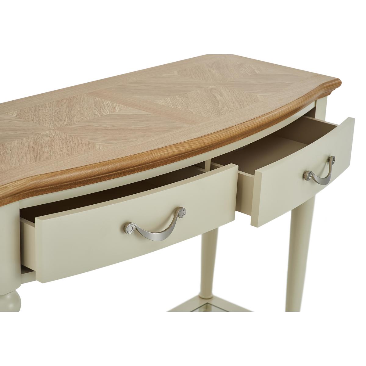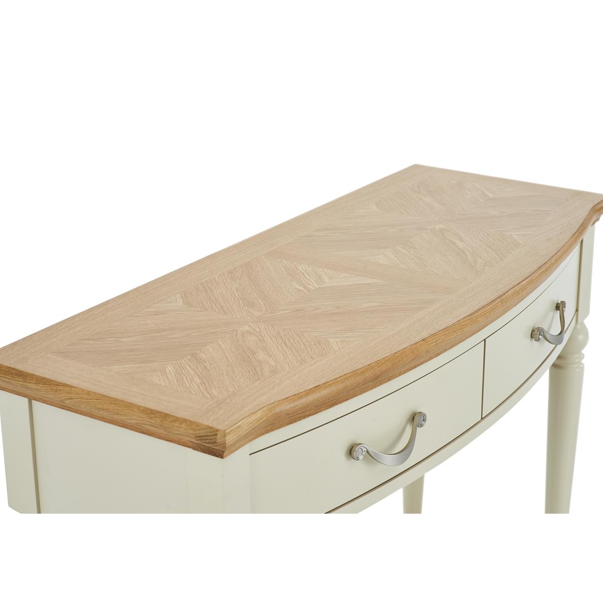 The Annecy dining collection is beautifully elegant in the dining room, and quietly relaxed in the kitchen. Soft grey or antique white painted-finish bases are complemented by grey washed oak or pale oak tops, finished with exquisite marquetry pattern veneers. Classic detailing includes turned and tapered table legs, bow fronts, soft close drawers and curved satin finish handles. With two styles of dining chair. Perfect for a living room, hallway or dining room, the Annecy console table combines functionality with a fresh finish. Tops have exquisite inlaid marquetry patterned veneers. The front is gently bowed, legs are turned and tapered, and the satin-finish metal drawer handles are elegantly curved. It’s also a useful storage piece, with two soft-close drawers, a spacious top surface for display, and a large lower glazed shelf. The Annecy console table is part of the Annecy range of dining room furniture and living room storage and occasional pieces. From a large extending dining tables to compact lamp table, this two-tone range lets you furnish your whole living spaces in charming and elegant style. Did you know?. Oak is natural with characterful knots and markings, every piece of furniture is unique.