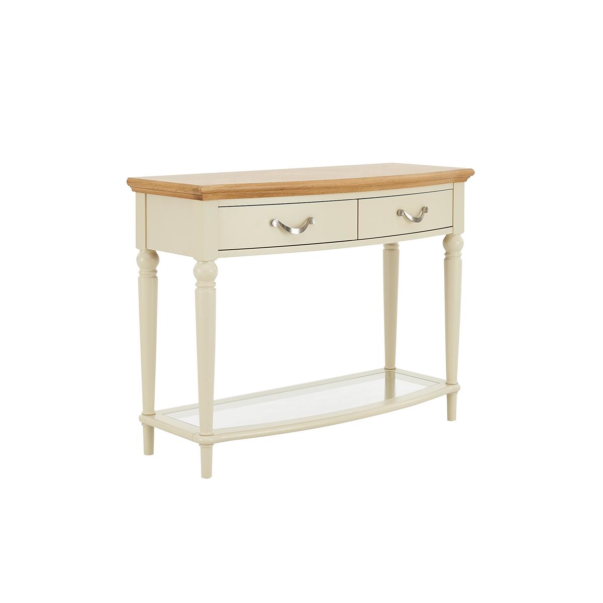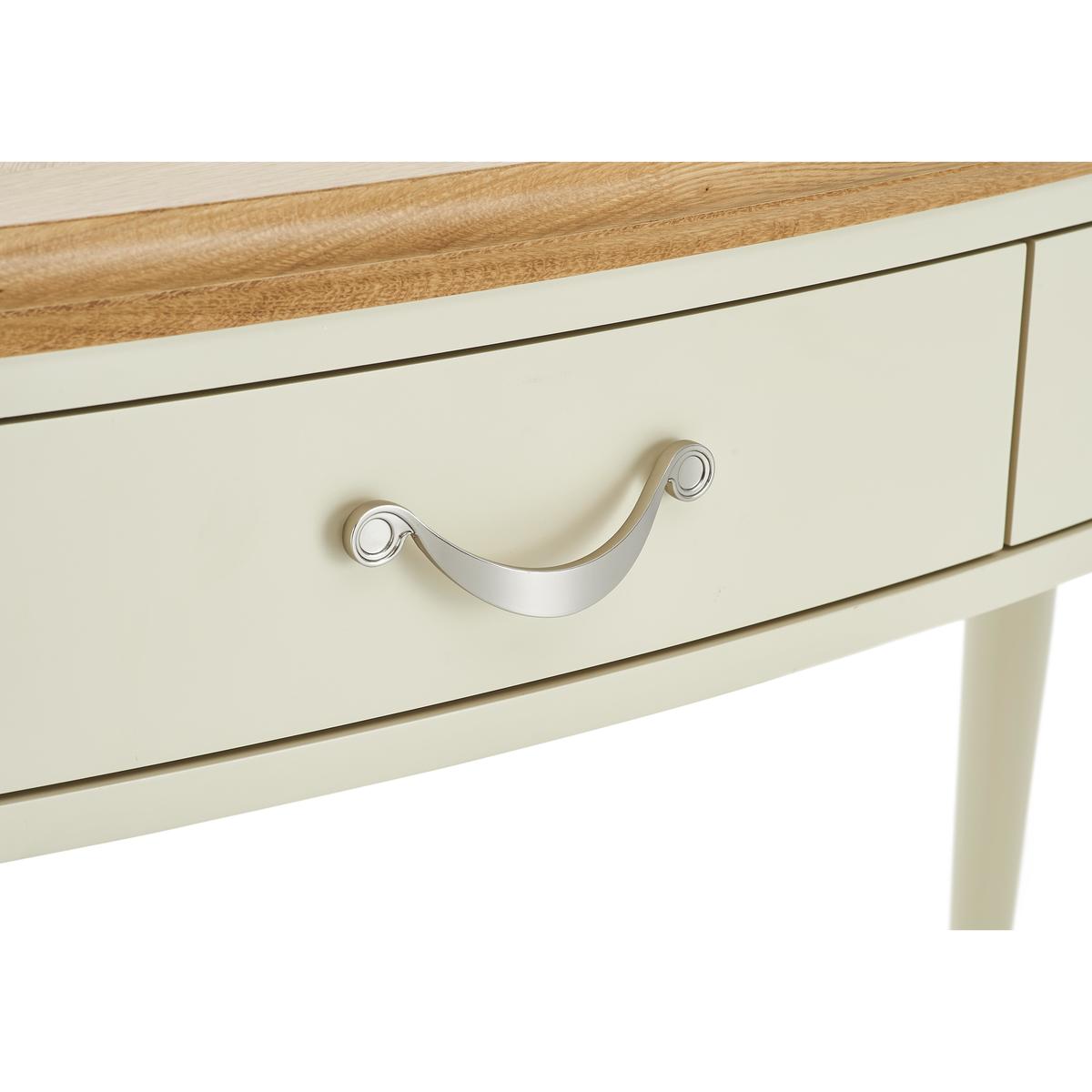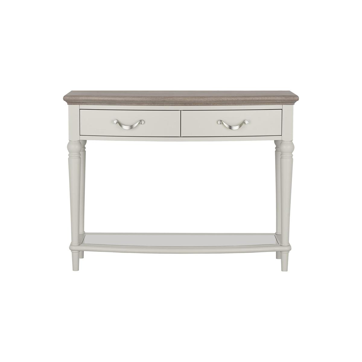 The Annecy dining collection is beautifully elegant in the dining room, and quietly relaxed in the kitchen. Soft grey or antique white painted-finish bases are complemented by grey washed oak or pale oak tops, finished with exquisite marquetry pattern veneers. Classic detailing includes turned and tapered table legs, bow fronts, soft close drawers and curved satin finish handles. With two styles of dining chair. Perfect for a living room, hallway or dining room, the Annecy console table combines functionality with a fresh finish. Tops have exquisite inlaid marquetry patterned veneers. The front is gently bowed, legs are turned and tapered, and the satin-finish metal drawer handles are elegantly curved. It’s also a useful storage piece, with two soft-close drawers, a spacious top surface for display, and a large lower glazed shelf. The Annecy console table is part of the Annecy range of dining room furniture and living room storage and occasional pieces. From a large extending dining tables to compact lamp table, this two-tone range lets you furnish your whole living spaces in charming and elegant style. Did you know?. Oak is natural with characterful knots and markings, every piece of furniture is unique.