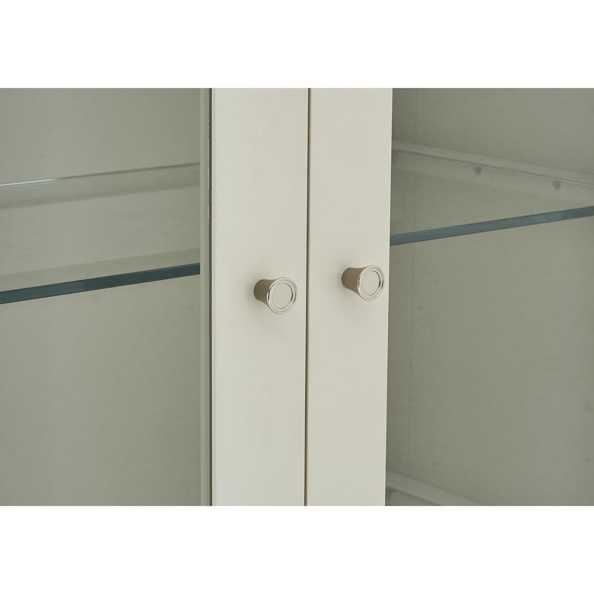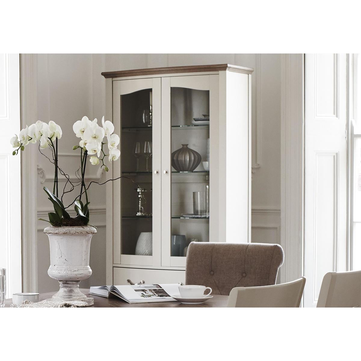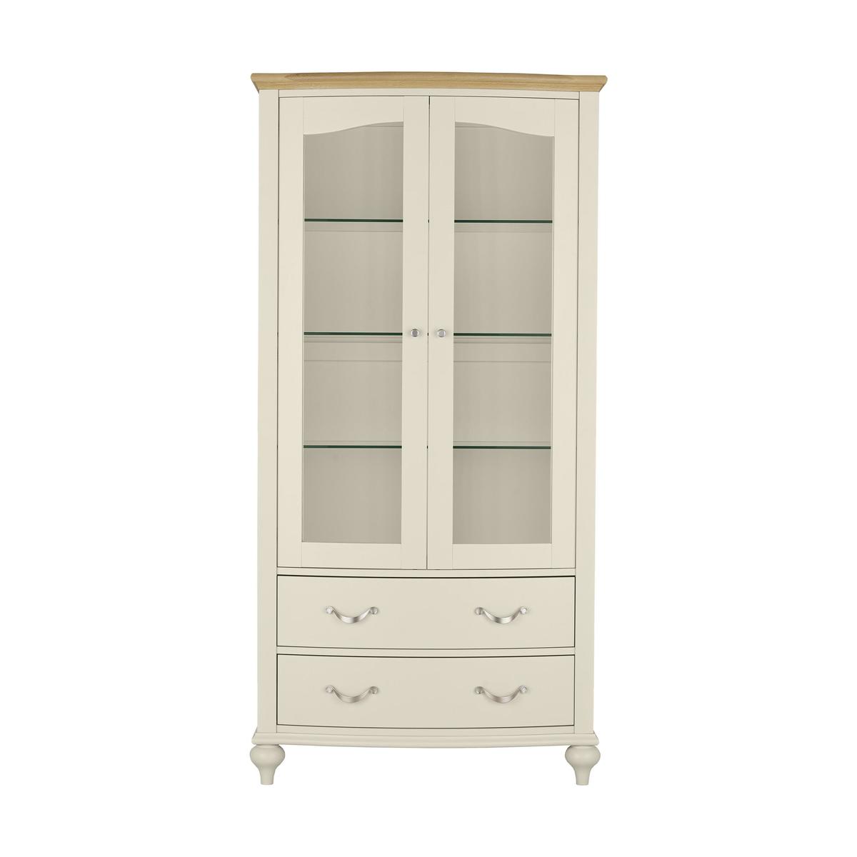 Show off your favourite things in style with the Annecy display cabinet. With its lovely two-tone finish and stunning traditional details, it’s the perfect showcase for ornaments, framed photos and books. Creatively updating classic details, this piece features an overhanging top, bowed front and turned ball front feet. The glass-fronted cupboard has x fixed glass shelves, and two roomy lower soft-close drawers provide useful extra storage space. Cupboards and drawers have satin-finish metal shelves. Crafted from solid beech with a solid oak top, this display cabinet is available in a choice of two modern finishes – antique white painted frame with pale oak top and soft grey painted frame with grey washed oak top. Part of the Annecy collection of dining room furniture and living room storage and occasional pieces, the Annecy display cabinet perfectly coordinates with the Annecy console table and the Annecy wide sideboard. Did you know? Oak is natural with characterful knots and markings, every piece of furniture is unique.