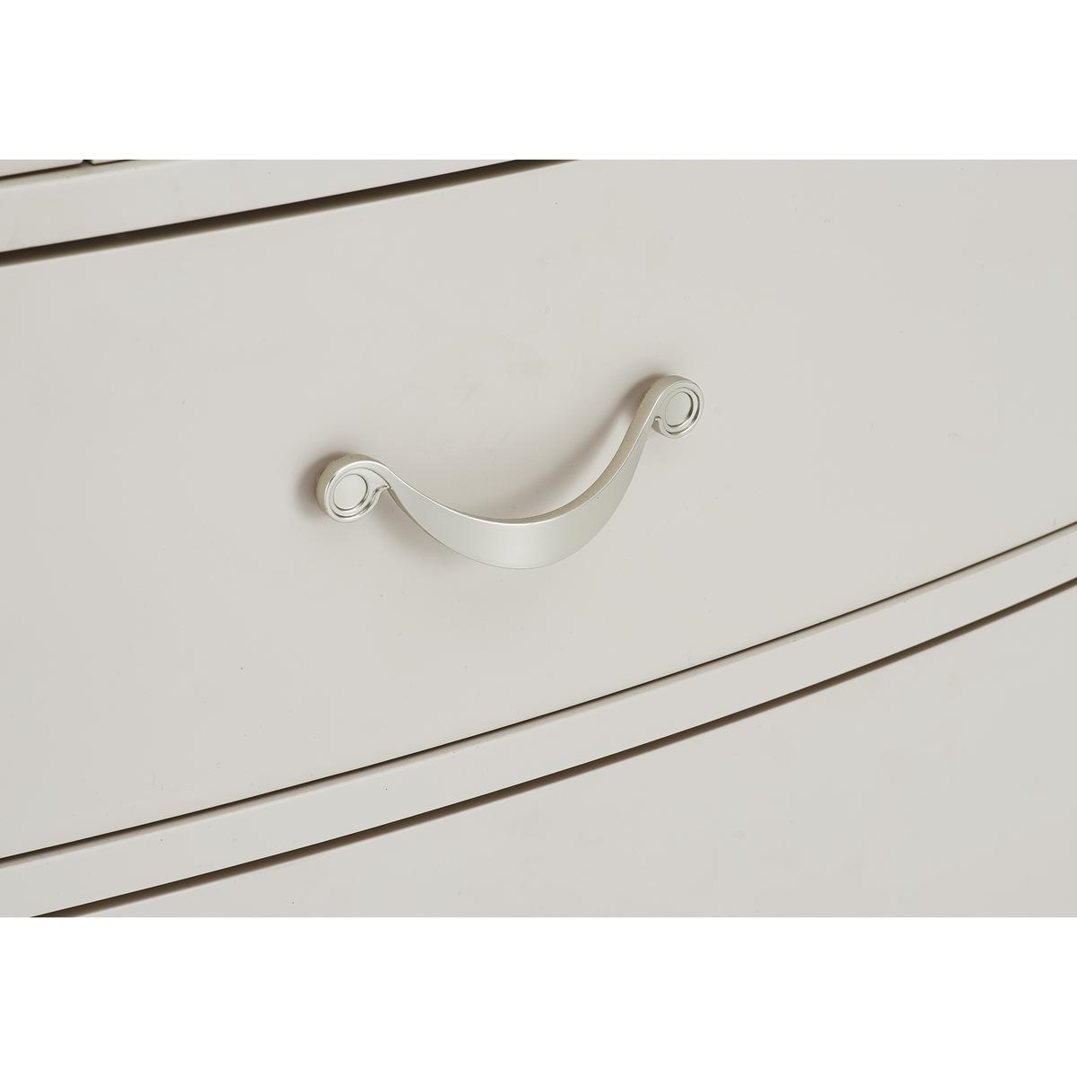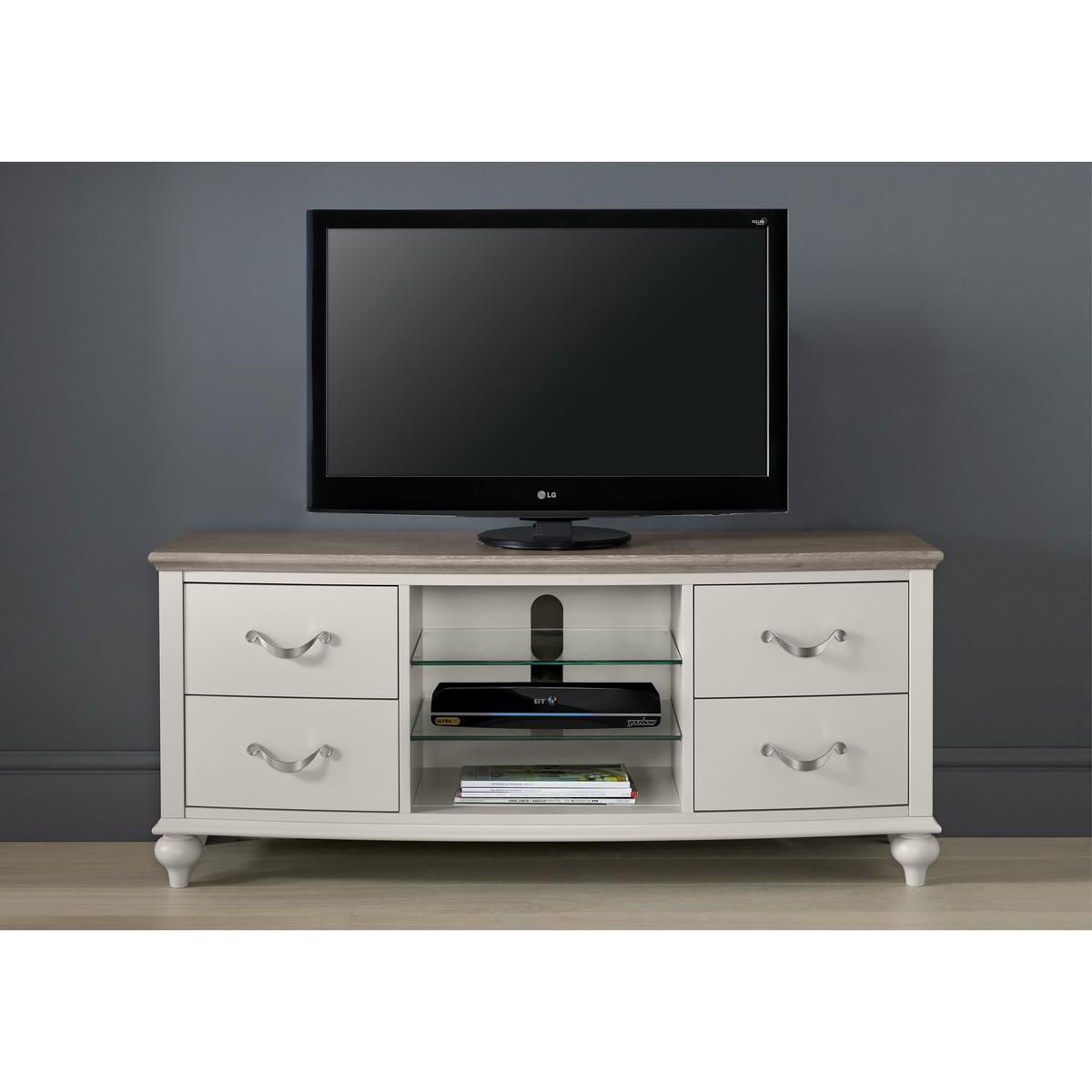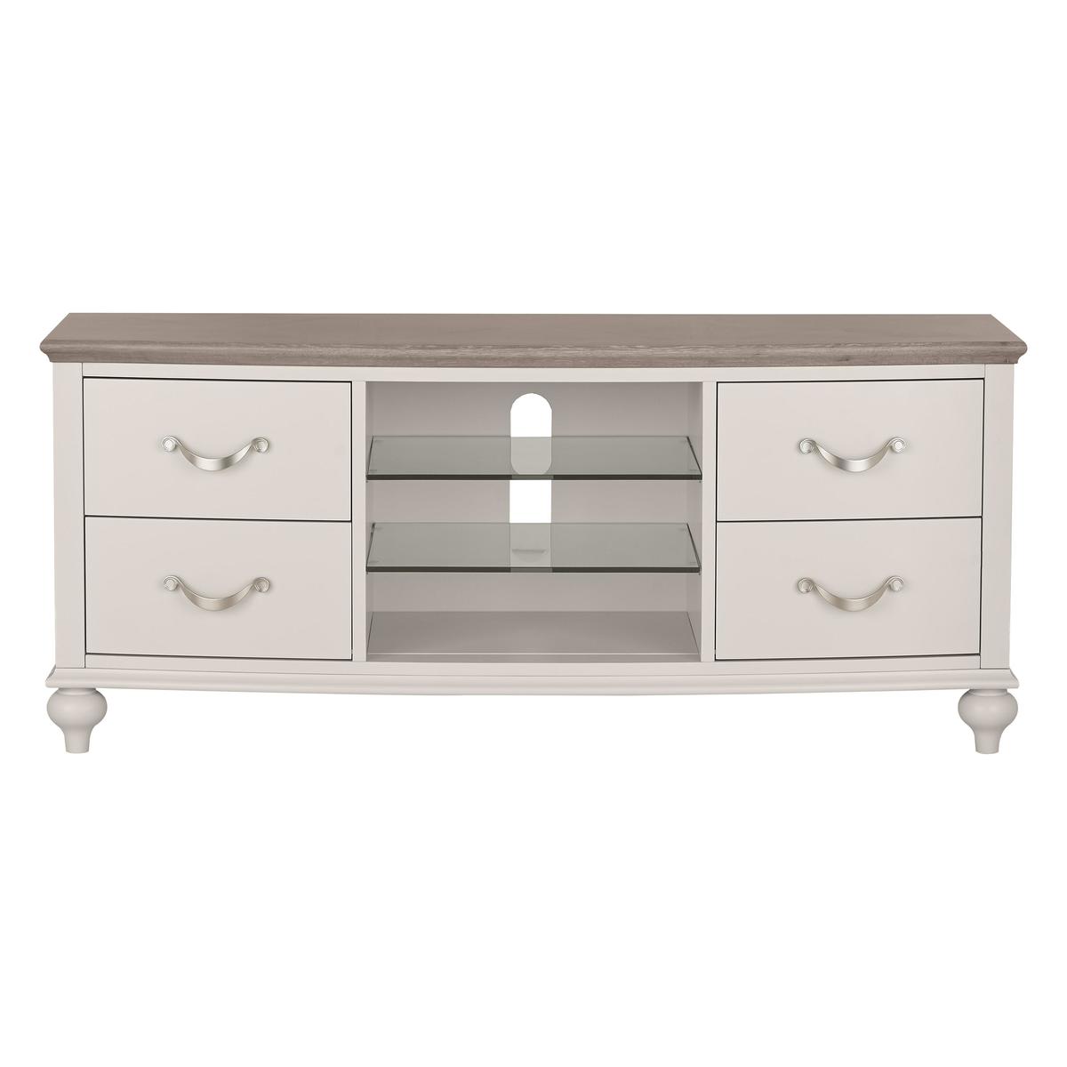 A contemporary finish with classic details characterises the spacious Annecy entertainment unit. Highly functional, this stylish piece is wide enough to support even a very large TV. It has two pairs of deep drawers on either side of a glass- shelved open storage area thats perfect for larger media components. Drawers have satin- finish metal handles and soft- close mechanisms. Cable cut- outs at the back allow you to keep leads tidy. With its bowed front and turned ball feet, this solid beech and oak sideboard references traditional design with a fresh and modern look. The solid edge top has exquisite inlaid marquetry pattern veneers. The Annecy entertainment unit is part of the Annecy range and pairs well with the Annecy coffee table which has drawer and shelf storage. Did you know? Oak is natural with characterful knots and markings, every piece of furniture is unique.