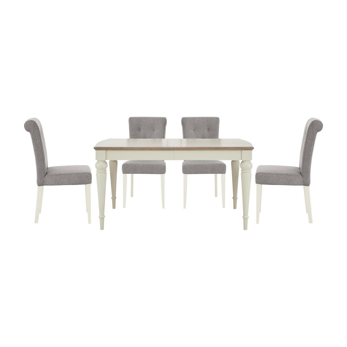 The Annecy dining collection is beautifully elegant in the dining room, and quietly relaxed in the kitchen. Soft grey or antique white painted-finish bases are complemented by grey washed oak or pale oak tops, finished with exquisite marquetry pattern veneers. Classic detailing includes turned and tapered table legs, bow fronts, soft close drawers and curved satin finish handles. With two styles of dining chair. Your guests will want to linger at the beautiful Annecy dining table. This dining set, inspired by the French style, suits both classic and contemporary décor. Why you’ll love it. Elegant French style extending dining table with 4 chairs. The table extends to seat 8 with a hidden internal leaf. Exquisite inlaid marquetry patterned oak veneer top. Turned and tapered legs in painted antique white or soft grey. 4 fabric upholstered roll back dining chairs. Suits both classic and modern interiors. Part of the elegant Annecy dining and occasional collection. What you need to know. The table is made from solid beech and solid oak with inlaid oak veneers. The dining chairs have solid beech frames and soft touch fabric upholstery. Wood has natural markings, knots and colour variations, every piece is unique. Annecy dining sets are available with large and small extending dining tables. Annecy is also available as a bedroom furniture collection.