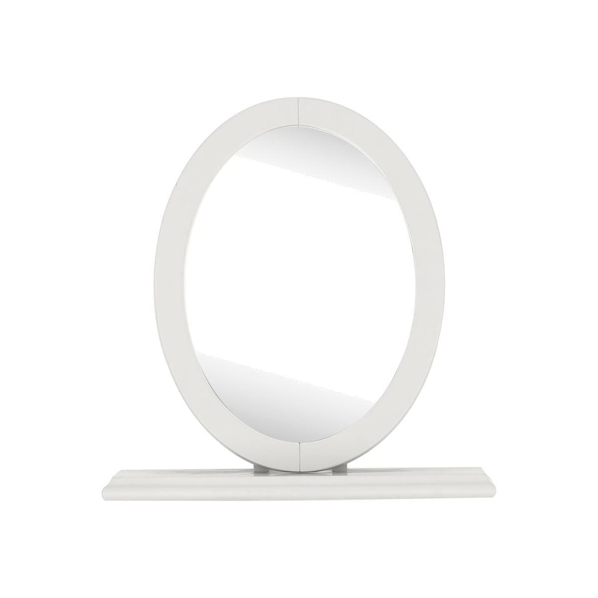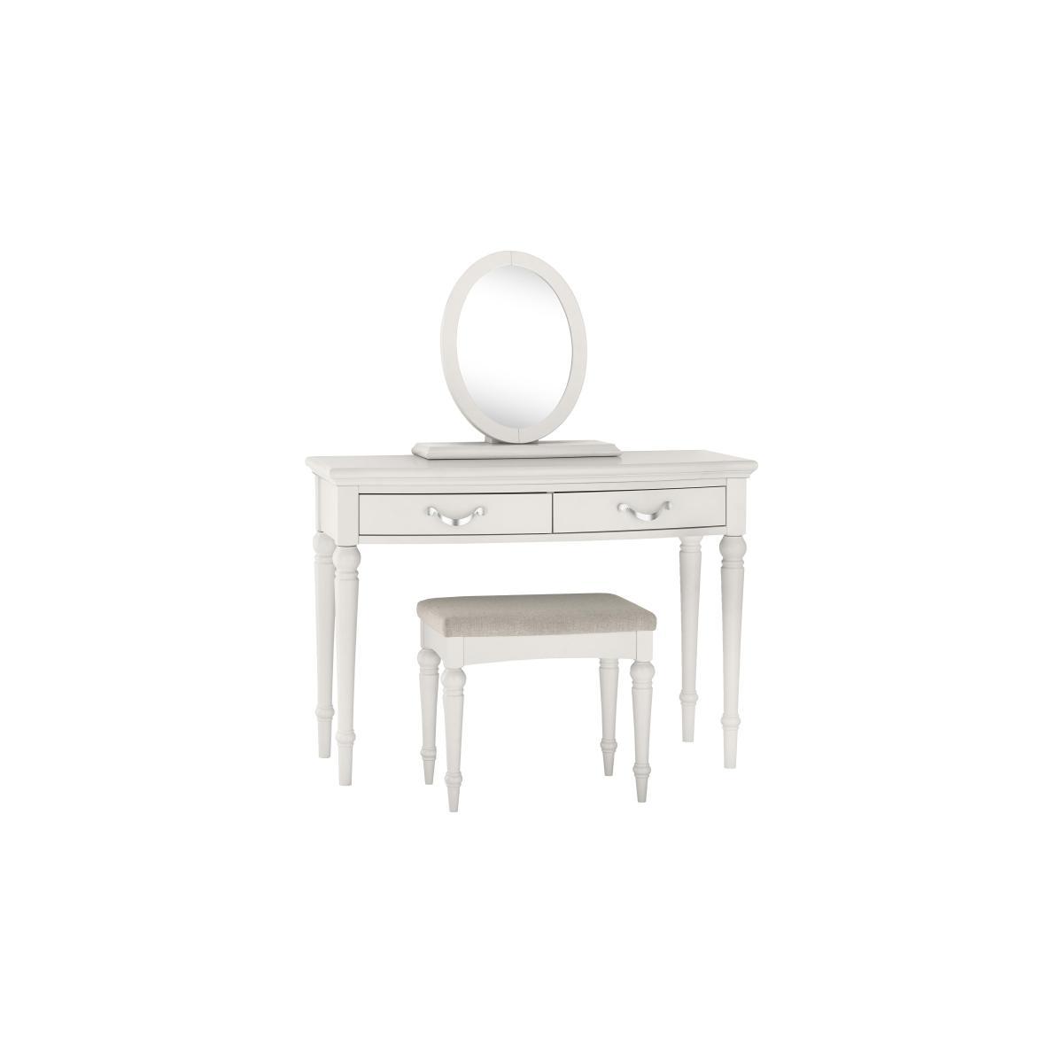 The Annecy bedroom collection is relaxed and quietly elegant. Soft grey painted-finish bases are complemented by either grey painted or grey washed oak tops, with solid edges and exquisite marquetry pattern veneers. Classic detailing includes turned and tapered table legs, bow fronts on the cabinets, Blum soft close drawers and curved satin finish handles. This simply but exquisitely designed fixed oval vanity mirror complements the Annecy dressing table beautifully. Classic, painted French style for your bedroom. Why you’ll love it. Elegant French style oval vanity mirror. Solid beech frame and plinth, painted antique white or soft grey. The mirror sits, slightly tilted, on the simple wooden plinth. Perfectly complements the classic, bow-fronted Annecy dressing table. Part of the Annecy painted and wood bedroom collection. What you need to know. Mirror frame and plinth are solid beech. Cushioned top is upholstered in polyester fabric. The cushion is polyurethane foam filled. Annecy is also available as a dining and occasional furniture collection.