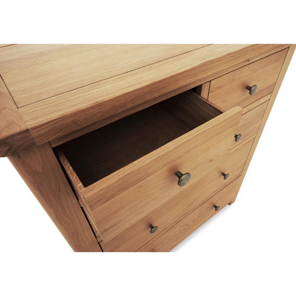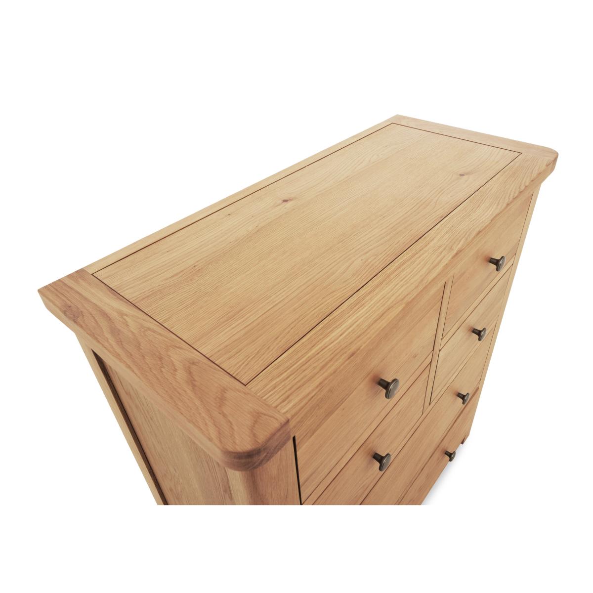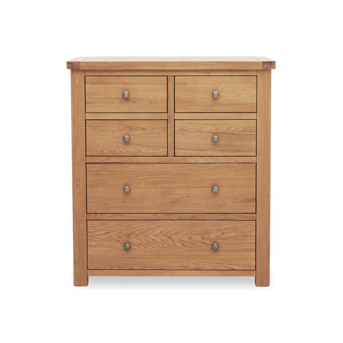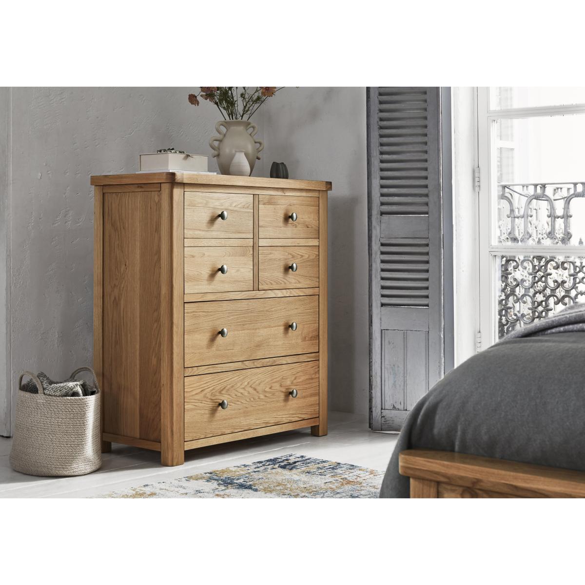 Beautifully crafted with a solid oak frame and metal drawer pulls, the Augusta six-drawer chest is exactly what we love about oak bedroom furniture. It’s characterful, versatile and always in style. Why you'll love it You’ll feel at home with oak bedroom furniture from the Augusta range. Exceptional quality and craftsmanship at a great price. Characterful modern country style. This 4+2-drawer chest of drawers is made of solid oak and oak veneer. A clear lacquer finish protects and enhances the wood. Timeless design with sturdy lines and an overhanging top with curved corners. Exclusively available at Furniture Village. This 4+2-drawer chest of drawers is part of the Furnitureland Augusta range. What you need to know Made from oak and oak veneer. No two pieces of wood or veneer are the same. Variations in colour will occur. Avoid placing in direct sunlight or close to a heat source. We recommend using coasters and placemats at all times. Wipe clean with a damp cloth and then dry using a soft duster. Do not use silicon-based furniture polish or abrasive cleaners. Shop the Augusta range for a huge choice of bedroom, living room and dining room furniture. WARNING! Item code: AUGU42DR--001