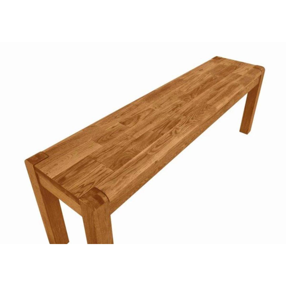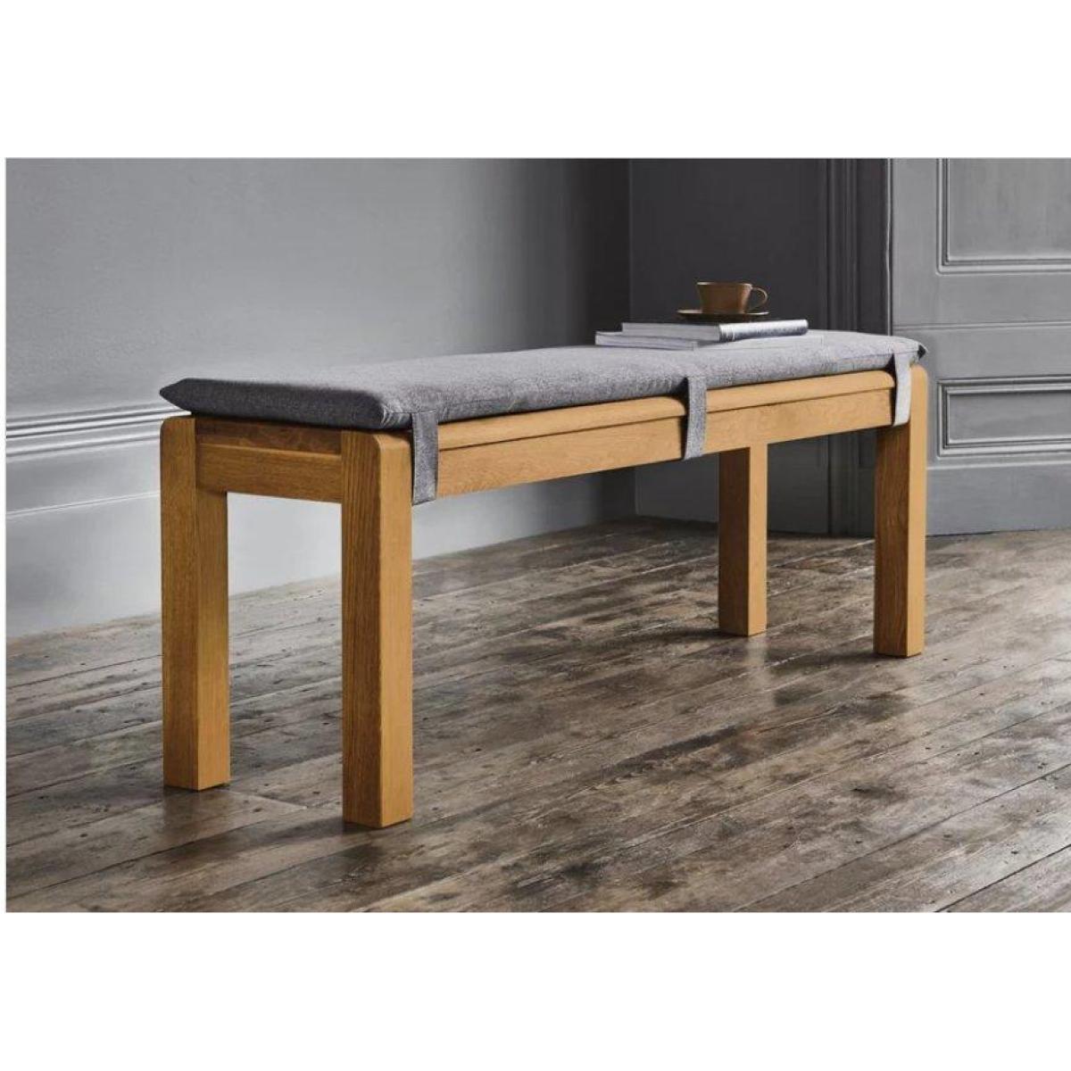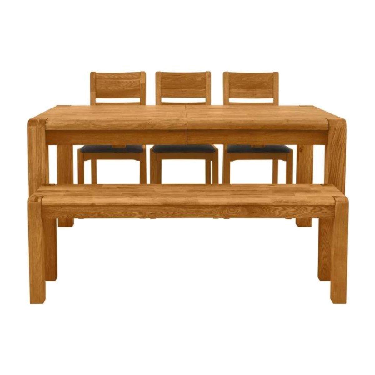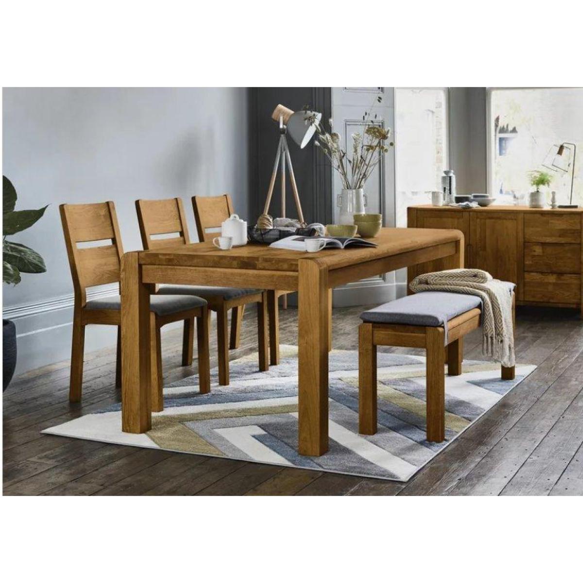 This solid oak dining table, with its striking butcher block-effect top, seats eight and extends to seat ten. For maximum versatility, we’ve paired it with three dining chairs and a dining bench, all made of solid oak. It’s the perfect set for larger dining spaces and bigger families. Why you’ll love it Solid oak dining set is beautifully crafted and great value. Casual contemporary style suits all interiors. Table has a striking butcher block-style top. Dining chairs have broad horizontal slats, and padded seats with dark grey upholstery. Dining table and bench legs curve neatly into the rounded edges of the surface. The table’s butterfly extension mechanism is so easy to use. It’s made of real wood so each set will be different and unique. What you need to know Wood has natural markings, knots and colour variations. Easy to clean wood finish – simply wipe with a non-abrasive cloth. There’s a wide choice of Bakerloo dining sets, or mix and match tables, chairs and benches to make your own. You can add an upholstered dining bench pad for extra comfort. Please note:As shown below, this piece has small gaps where the legs meet the top. This is a design feature, not a manufacturing fault.