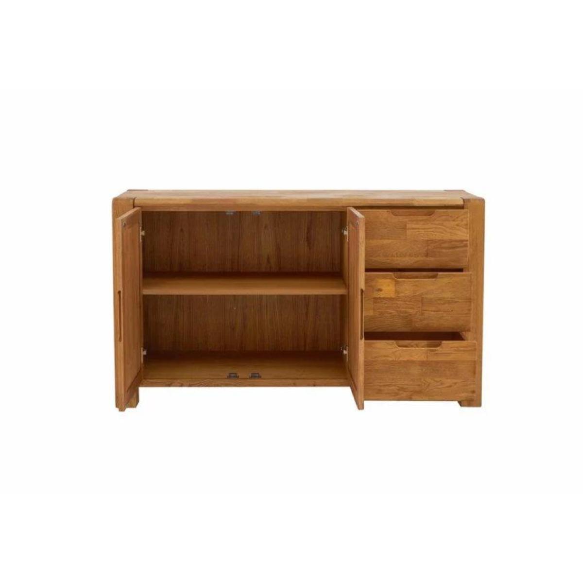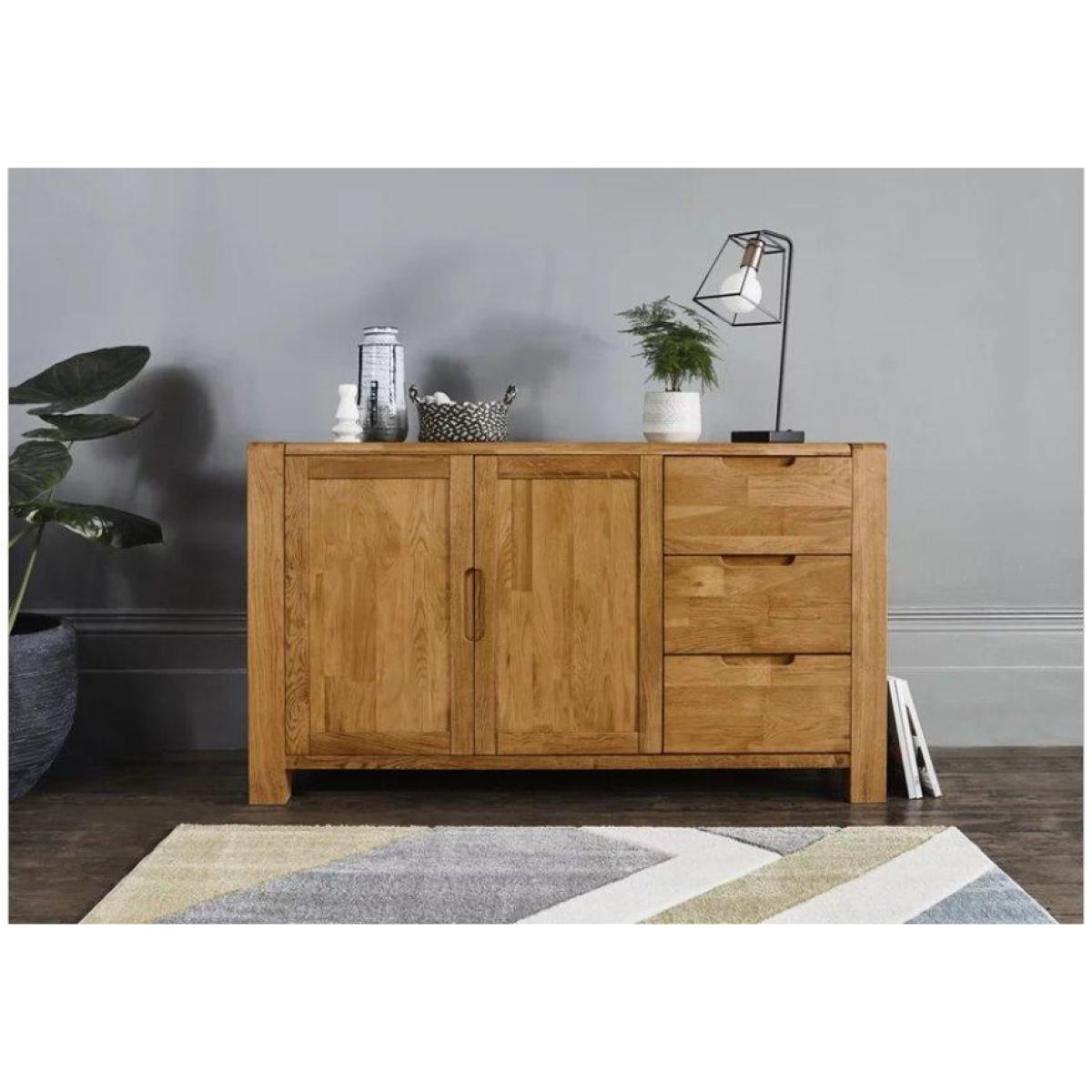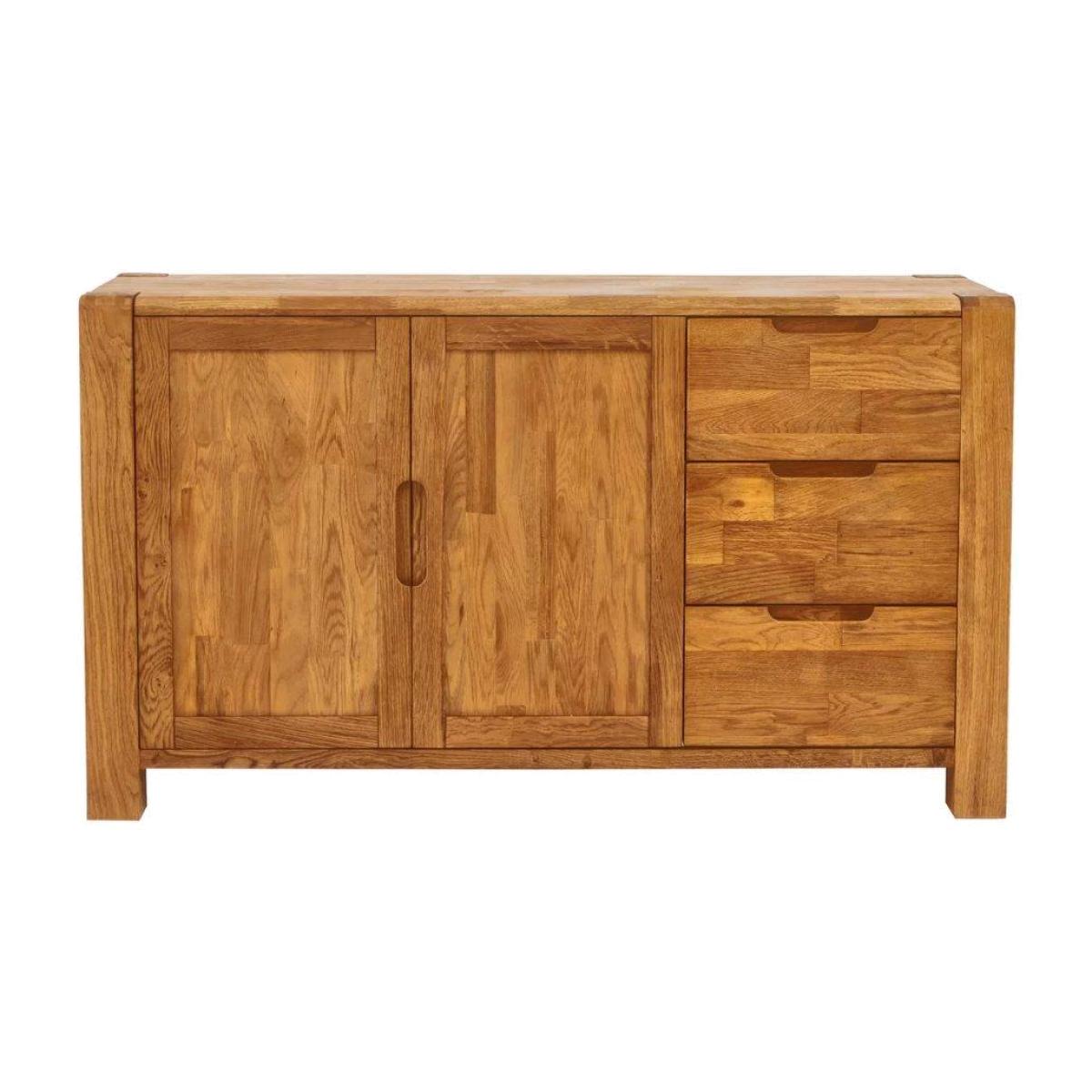 Style meets practicality in this well-crafted oak sideboard with butcher block-effect finish. With both cupboard and drawer space, it’s easy to keep dinnerware, wine glasses and utensils out of sight. Why you’ll love it Oak sideboard is beautifully crafted and great value. Casual contemporary style suits all interiors. Striking butcher block-style finish on the top and cupboard door fronts. Legs smoothly curve into the rounded edges of the top. Doors and drawers have curved recessed handles. Versatile mix of cupboard and drawer space. It’s made of real wood so each sideboard will be different and unique. What you need to know Solid oak top and frame. Side and back panels have an oak veneer finish. Wood has natural markings, knots and colour variations. 3 drawers and a double door cupboard with a single shelf. Easy to clean – simply wipe with a non-abrasive cloth. The Bakerloo range also includes a TV unit, two sizes of dining table and dining sets. Please note:As shown below, this piece has small gaps where the legs meet the frame. This is a design feature, not a manufacturing fault. WARNING! Furniture can tip over unexpectedly and cause injury. This item must be fixed to a wall using the anti-tip kit provided. Be sure to use the correct wall fixings suitable for the walls in your home. Furniture Village is not able to fix anti-tip devices for you. Seek professional advice if you are unsure.