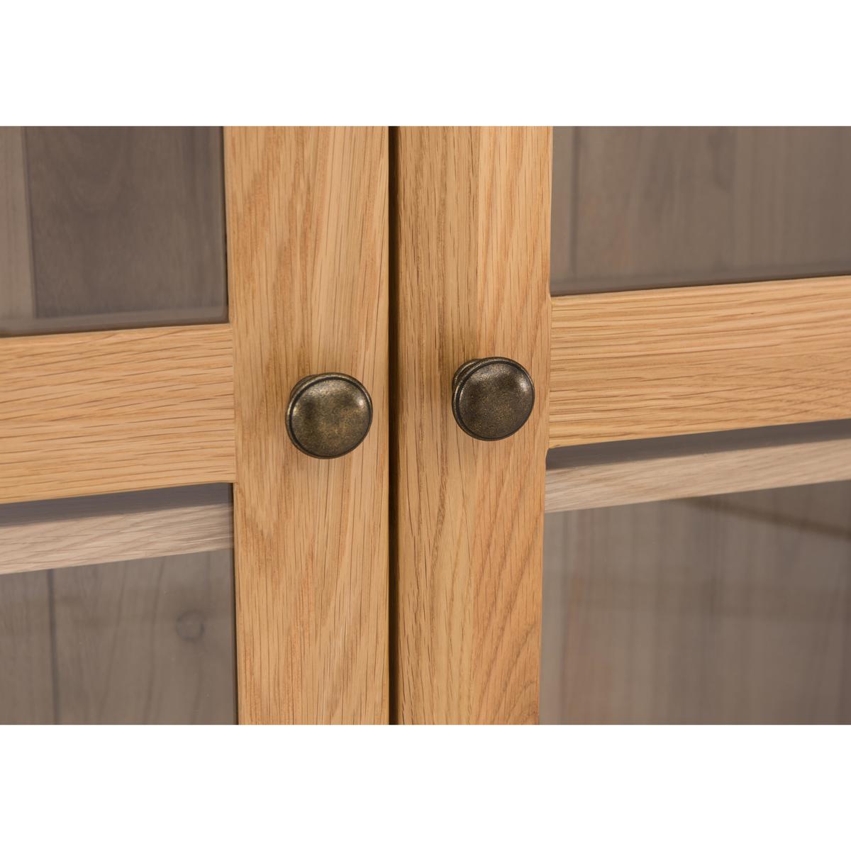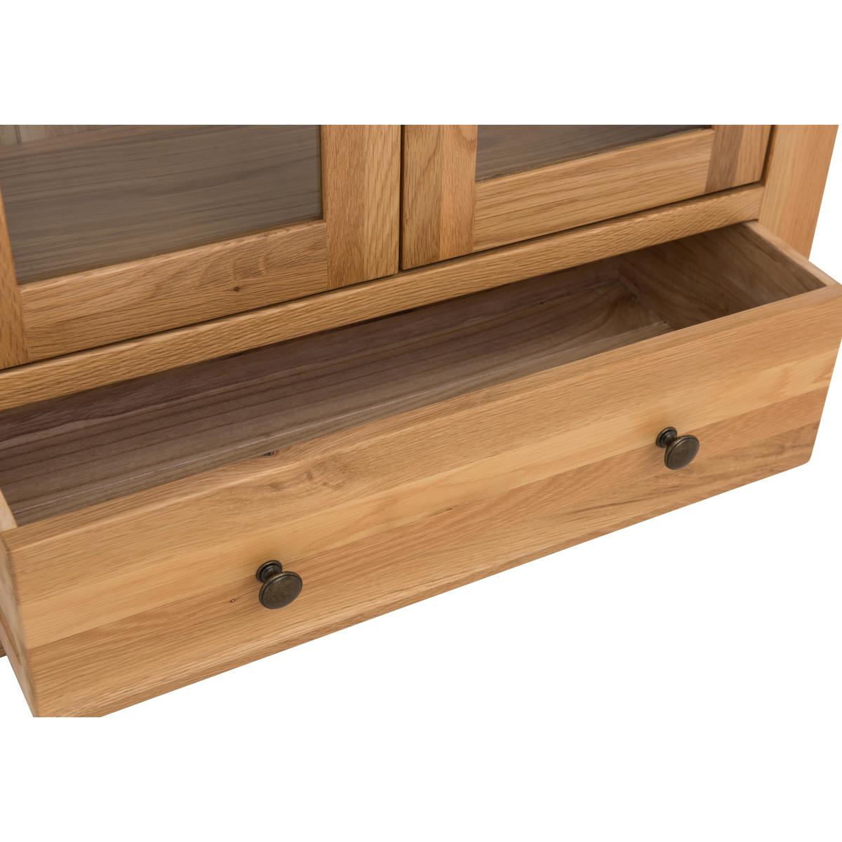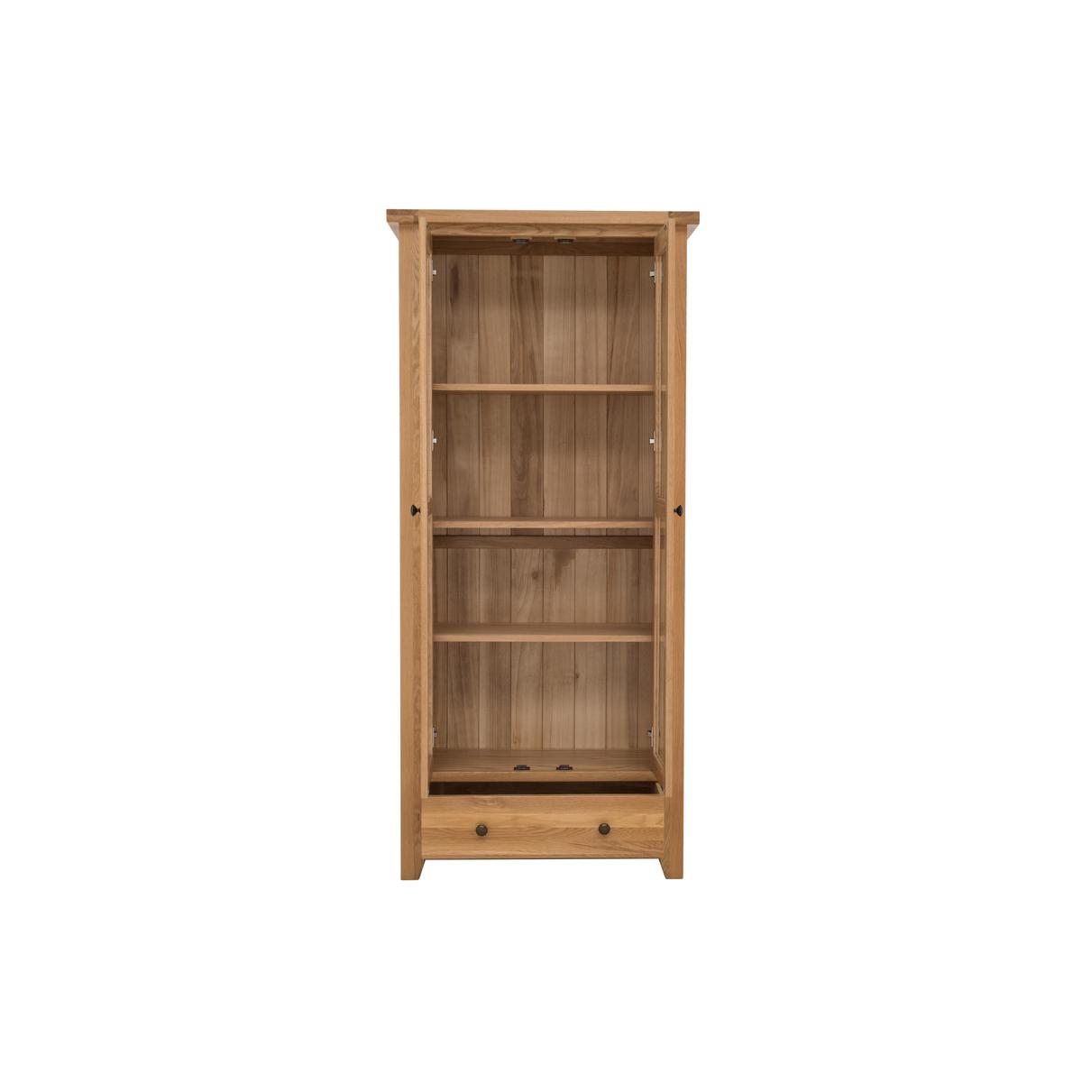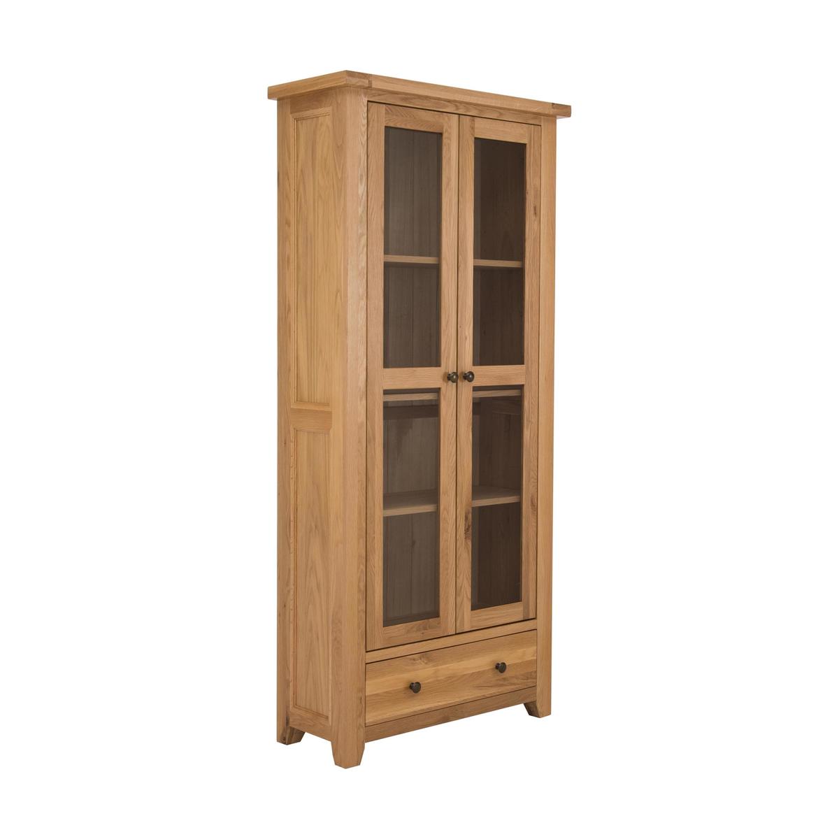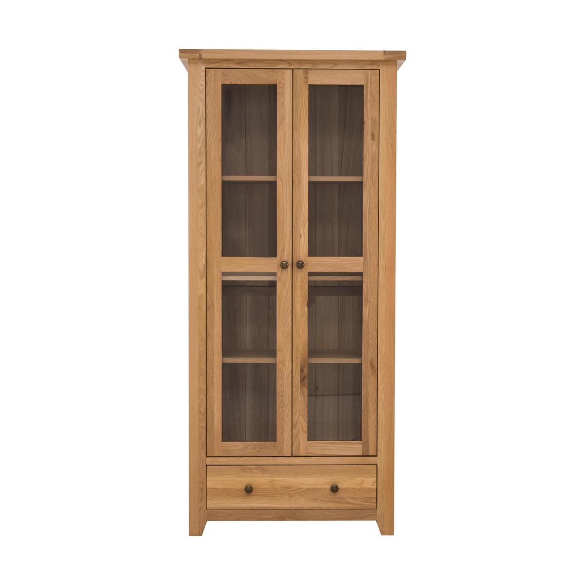 Tall and elegant, the Furnitureland California display unit is a beautiful way to show off your favourite things. Handcrafted from American white oak and beautiful warm oak veneers. Why youll love it Handcrafted tall display unit in solid white American oak. Finished with oak veneers and a clear lacquer for extra durability. The lacquer shows off the woods natural grain. Plenty of display space on adjustable shelves behind glass doors. Theres also a spacious lower drawer. Elegant, panelled sides. Simple, clean- lined design suits the contemporary home. Part of the extensive California range of dining and occasional furniture. What you need to know Handcrafted from white American oak with oak veneers. Strong and sturdy, made to last. 3 adjustable display shelves behind two glass doors. Roomy lower drawer offers extra storage space. Door handles and drawer pulls made of metal. Attractive overhanging top. Shaped feet. California furniture is made of solid wood so every piece is unique, with its own natural markings, knots and colour variations. Easy to clean. Wipe with a damp, non- abrasive cloth. For more advice on caring for your California furniture, see our Dining Care Guide. WARNING! Furniture can tip over unexpectedly and cause injury. This item must be fixed to a wall using the anti- tip kit provided. Be sure to use the correct wall fixings suitable for the walls in your home. Furniture Village is not able to fix anti- tip devices for you. Seek professional advice if you are unsure.