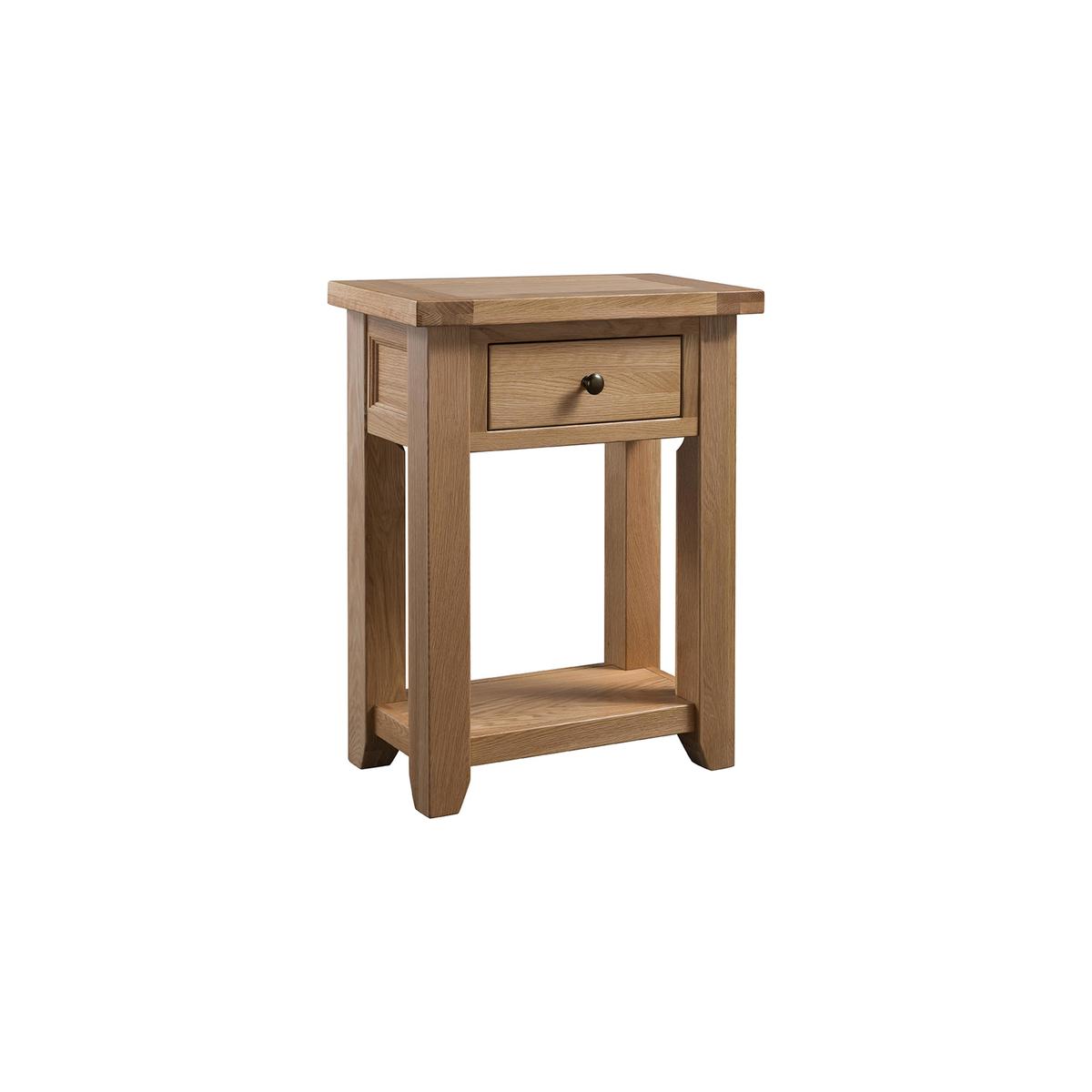 Dine à la carte with California. Choose a round, rectangular or square flip top table as your main, then add one of four delicious styles of side chair. Like well-chosen flavours, everything’s designed to go together beautifully. This fresh, timeless collection also has coordinating occasional furniture on the menu. Made from solid and veneered American oak at a great value price. If you love the look of a console table but have a smaller space, the Furnitureland California small console table is for you. Perfect for more compact living rooms and hallways, this lovely console table is handcrafted from American white oak and oak veneer, and features squared legs with tapered feet and an overhanging top. It’s finished with a clear lacquer that protects the wood and gives it a lovely soft sheen. Style is match by by utility at every turn. As well as the good sized top, there’s a lower shelf and a drawer, finished with a metal pull. The perfectly formed Furnitureland California small console table is part of the extensive Furnitureland California collection of occasional and storage furniture and dining room pieces. A large console table is also available and the range includes a wide choice of dining tables, dining chairs and dining sets. WARNING!. Furniture can tip over unexpectedly and cause injury. This item shall be fixed to a wall using the anti-tip kit provided with the furniture. Be sure to use the correct wall fixings suitable for the walls in your home. Did you know?. Oak is natural with characterful knots and markings, every piece of furniture is unique.